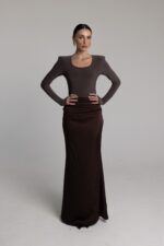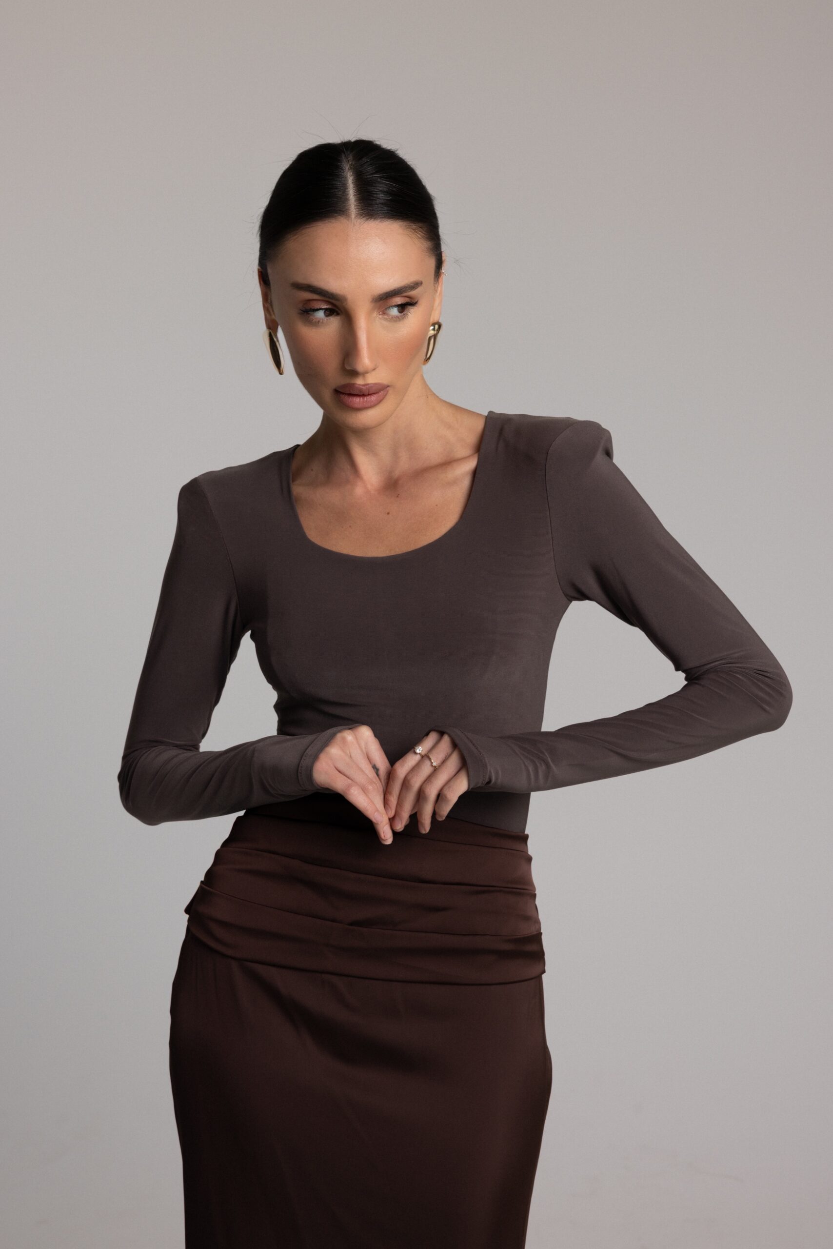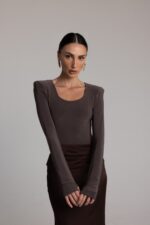 בגד גוף מבד לייקרה עם שרוולים ארוכים, כריות בכתפיים ומפתח מרובע.