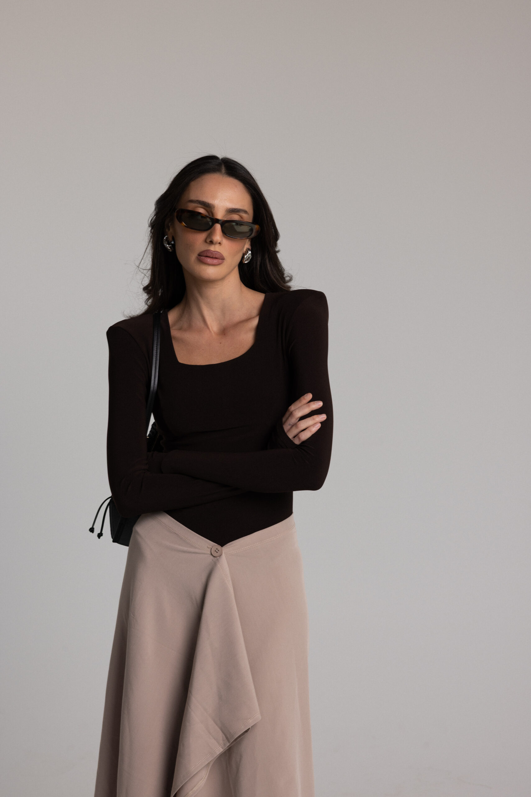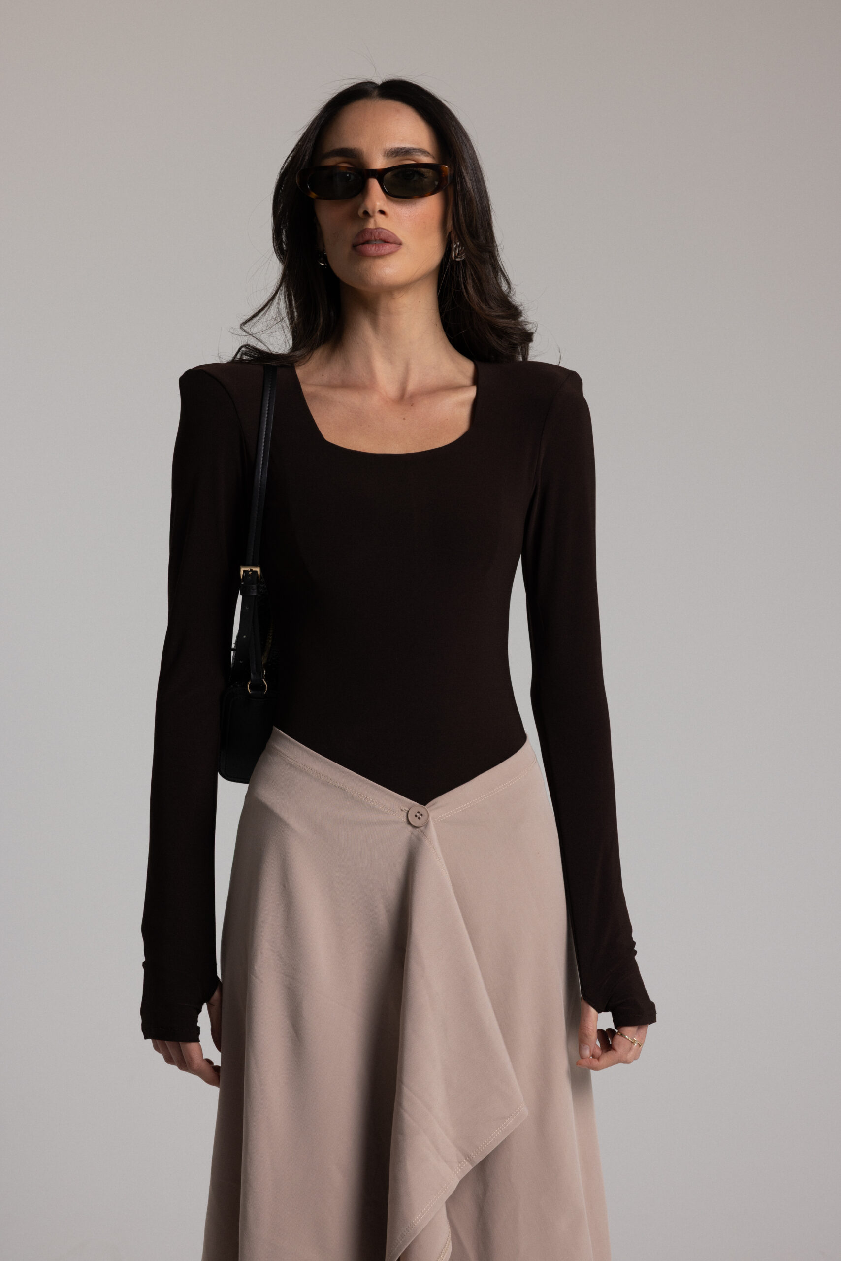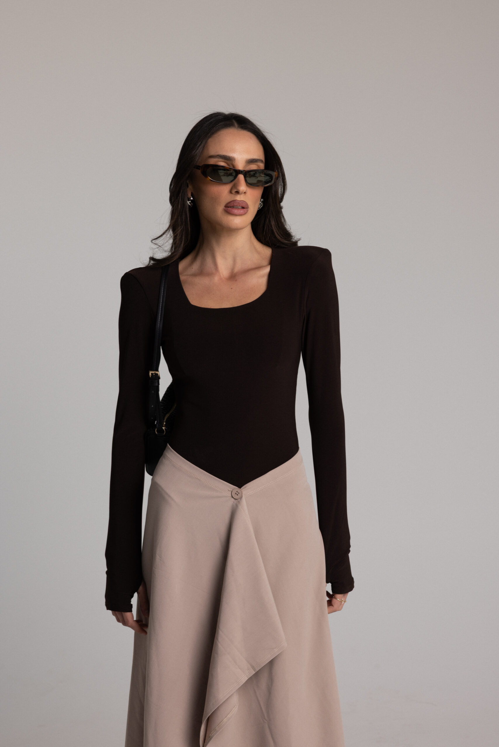 בגד גוף מבד לייקרה עם שרוולים ארוכים, כריות בכתפיים ומפתח מרובע.