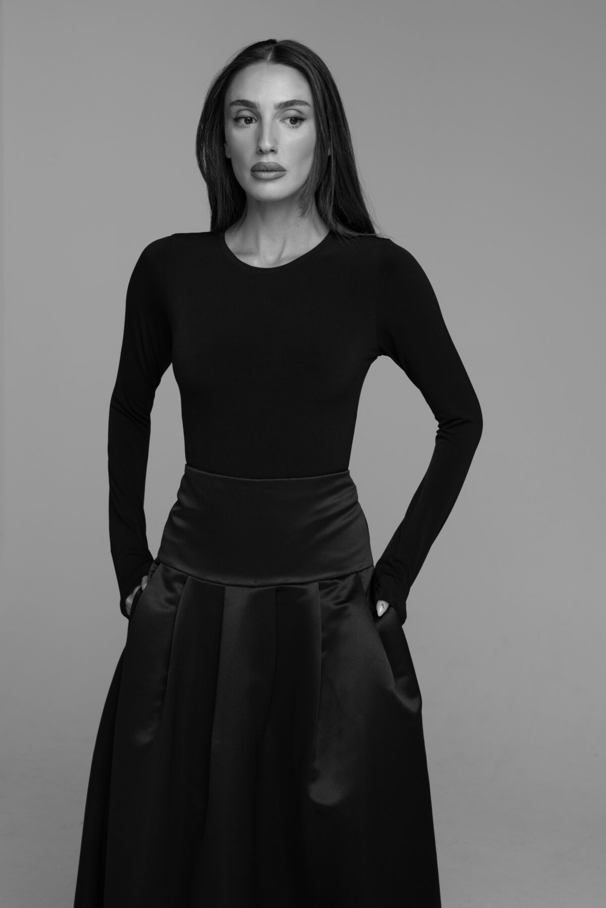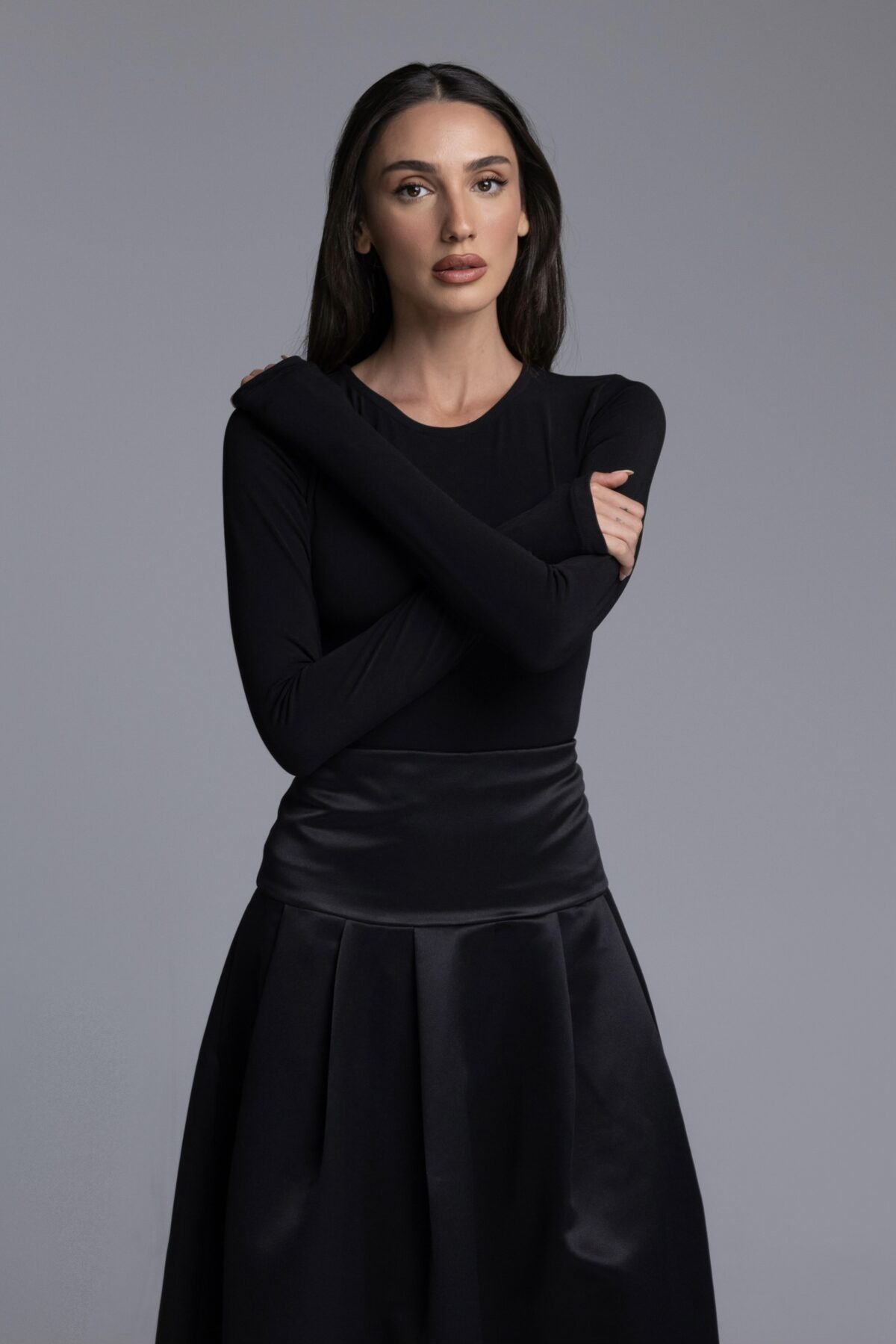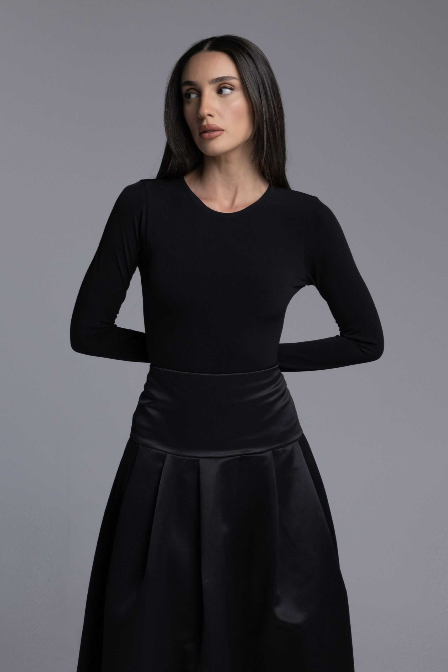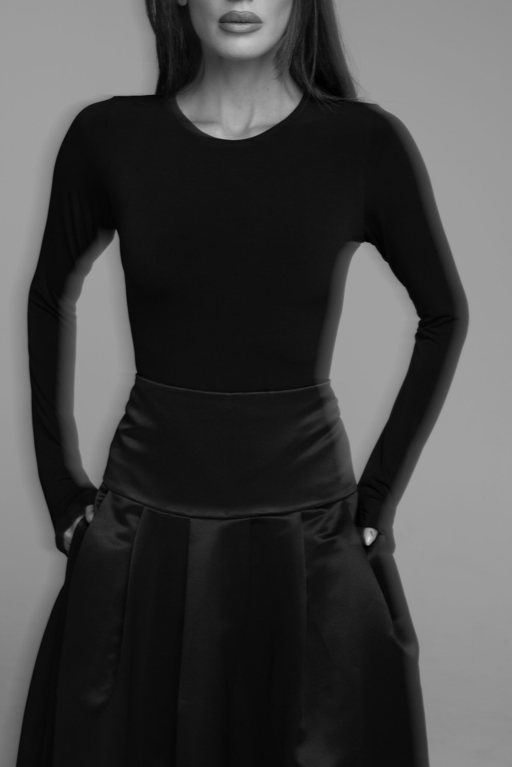 בגד גוף קלאסי עם גזרה נקייה ומדויקת בגימור חלק ומחמיא. עשוי בד נעים וגמיש שמצמיד בעדינות את הגוף, עם שרוולים ארוכים ומחשוף עגול. מידת הבגד על הדוגמנית 0.