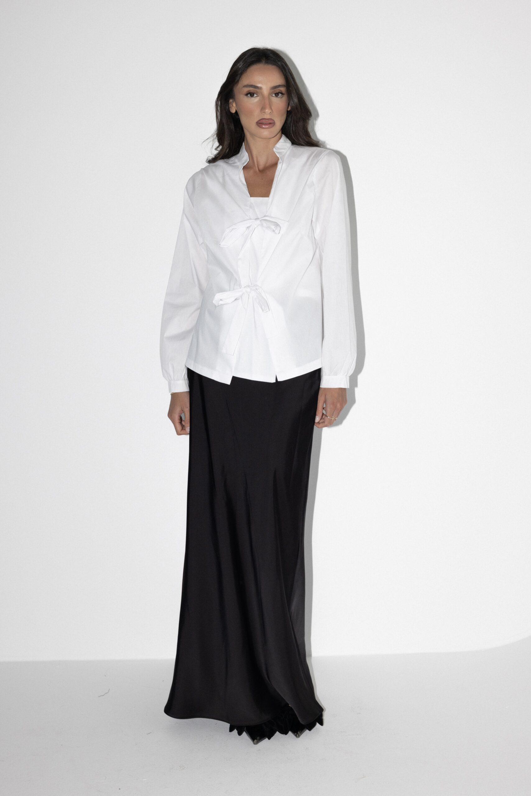 חולצה בגזרה ישרה עם קשירות פפיון מקדימה.
