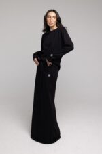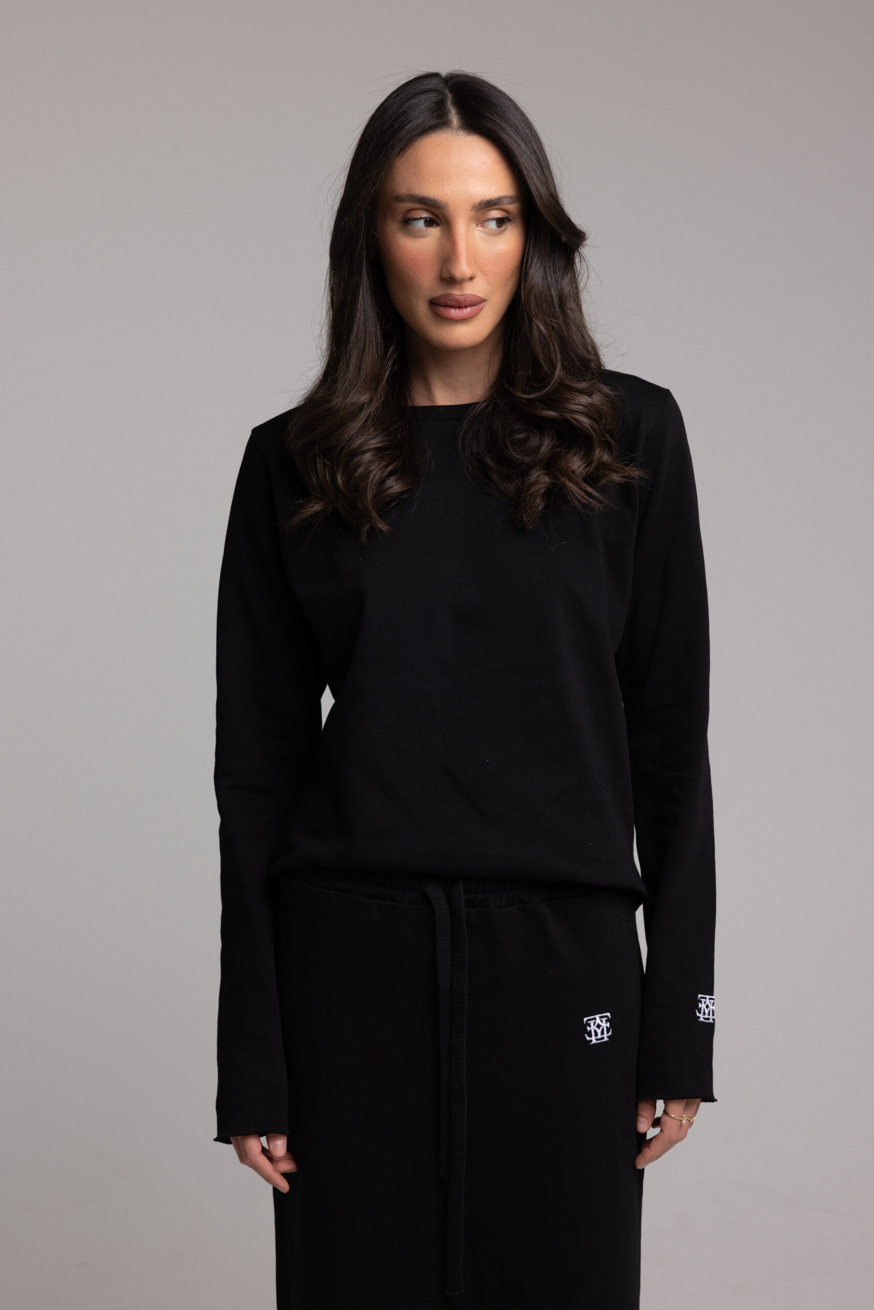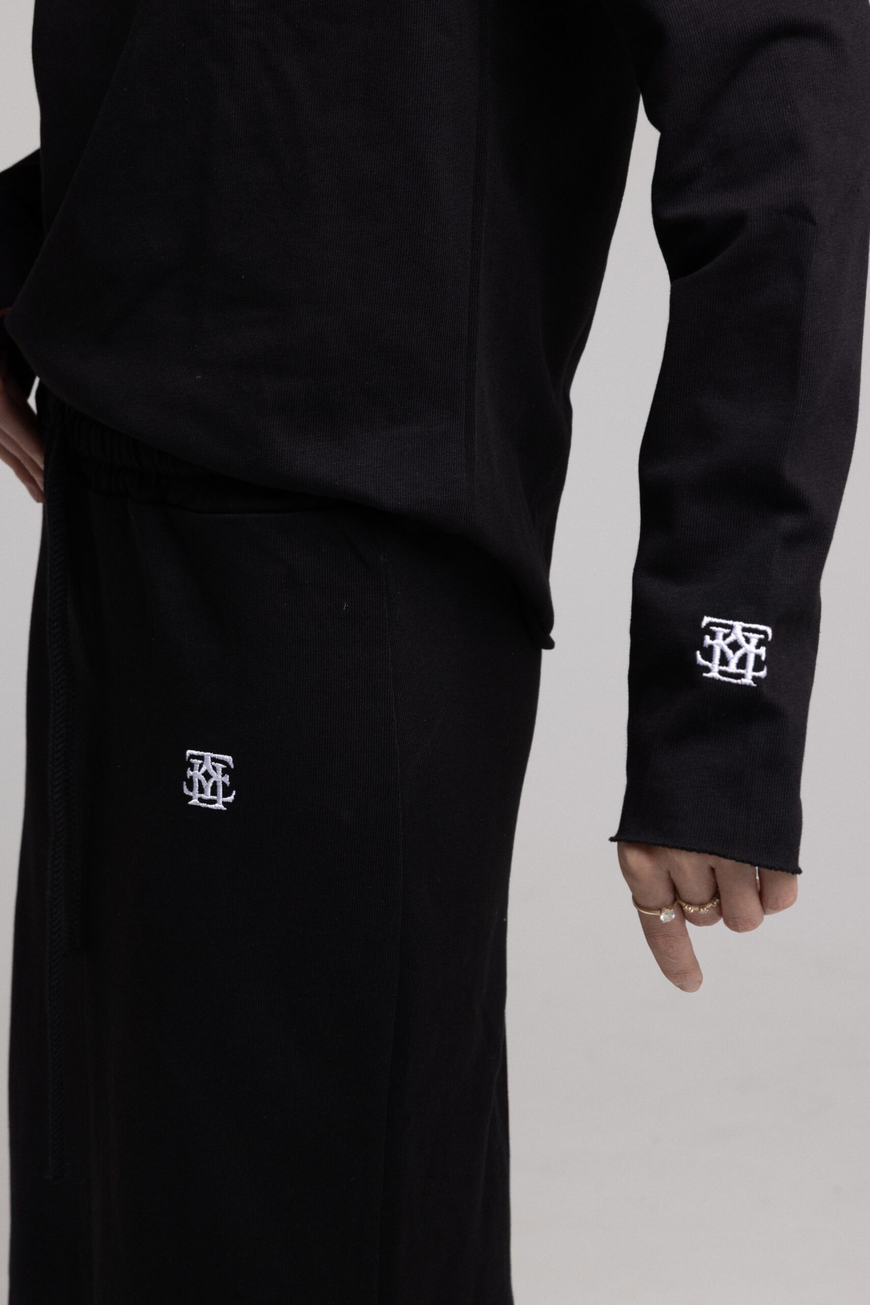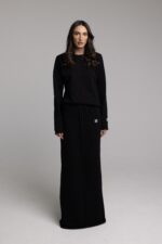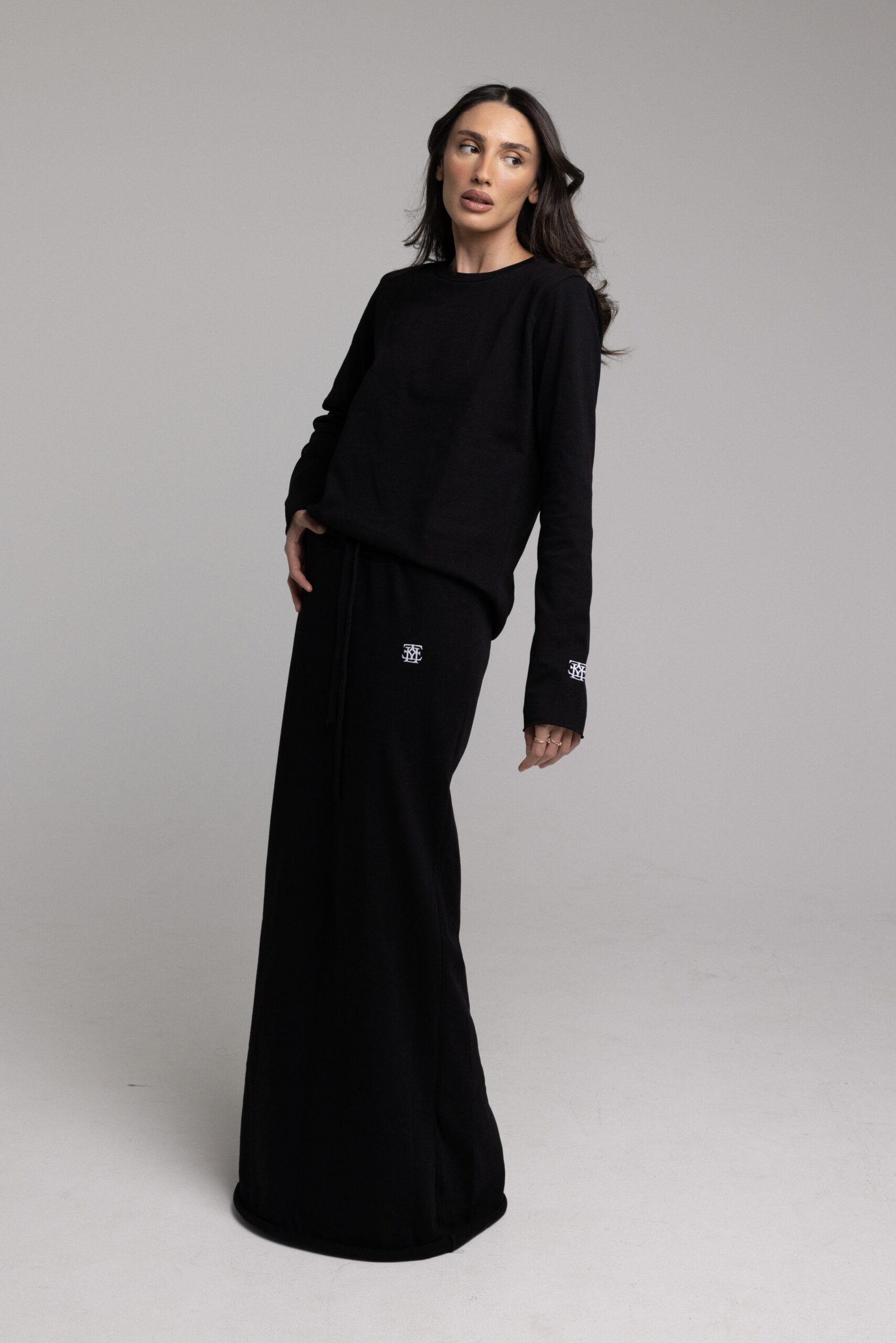 חליפת שני חלקים מבד בייסיק, חולצה ארוכה עם לוגו ביד וחצאית ארוכה עם גומי ולוגו בצד בחצאית.