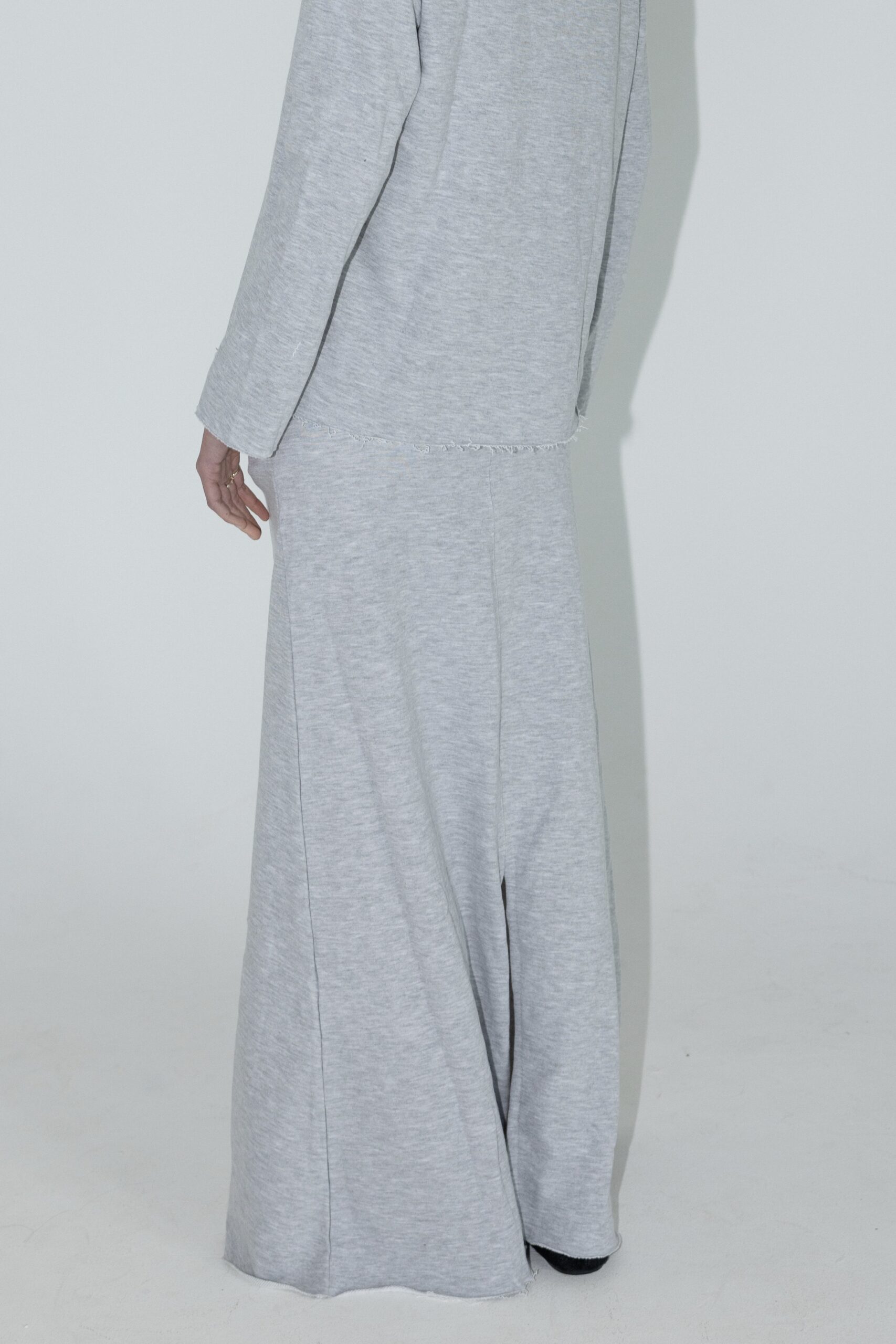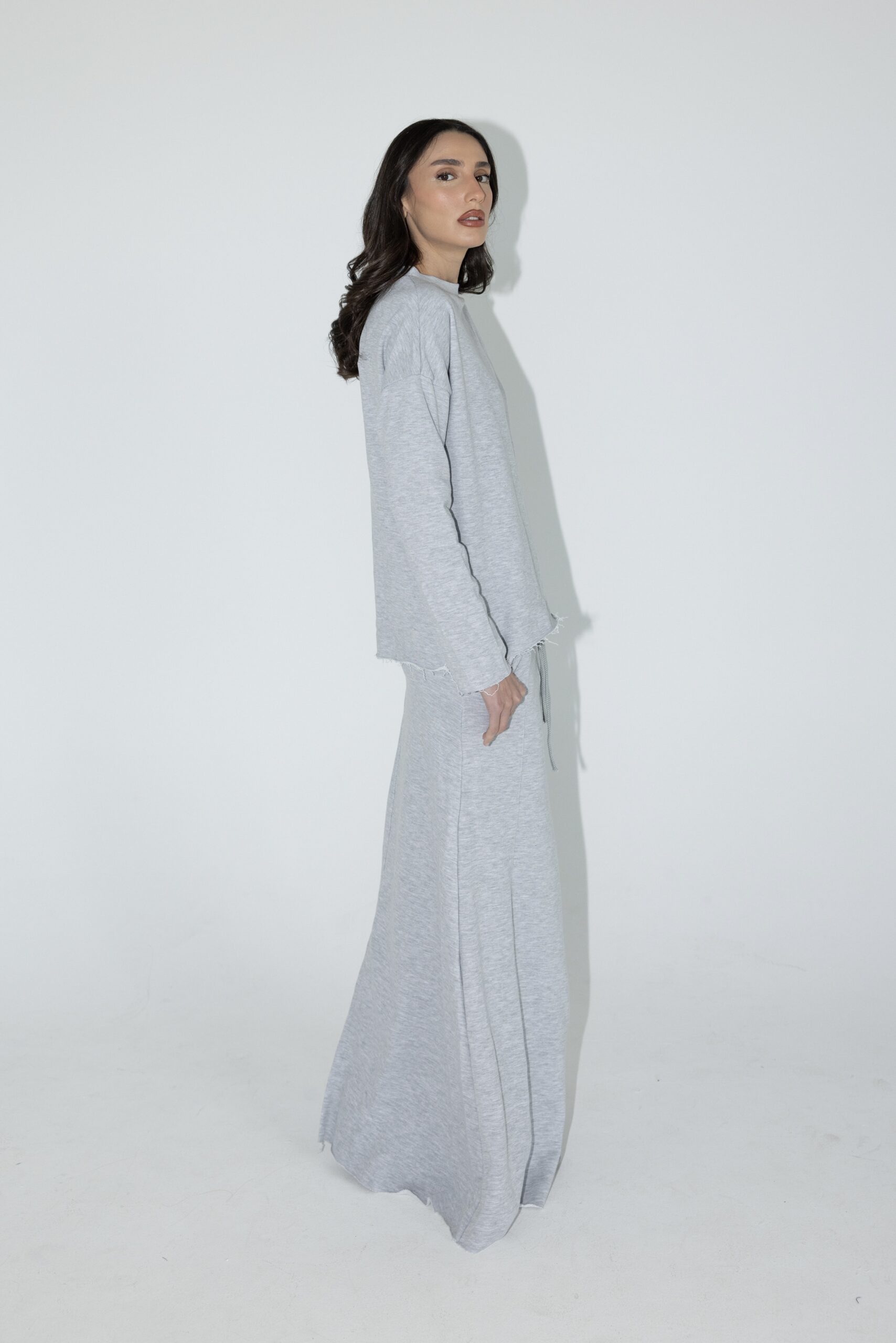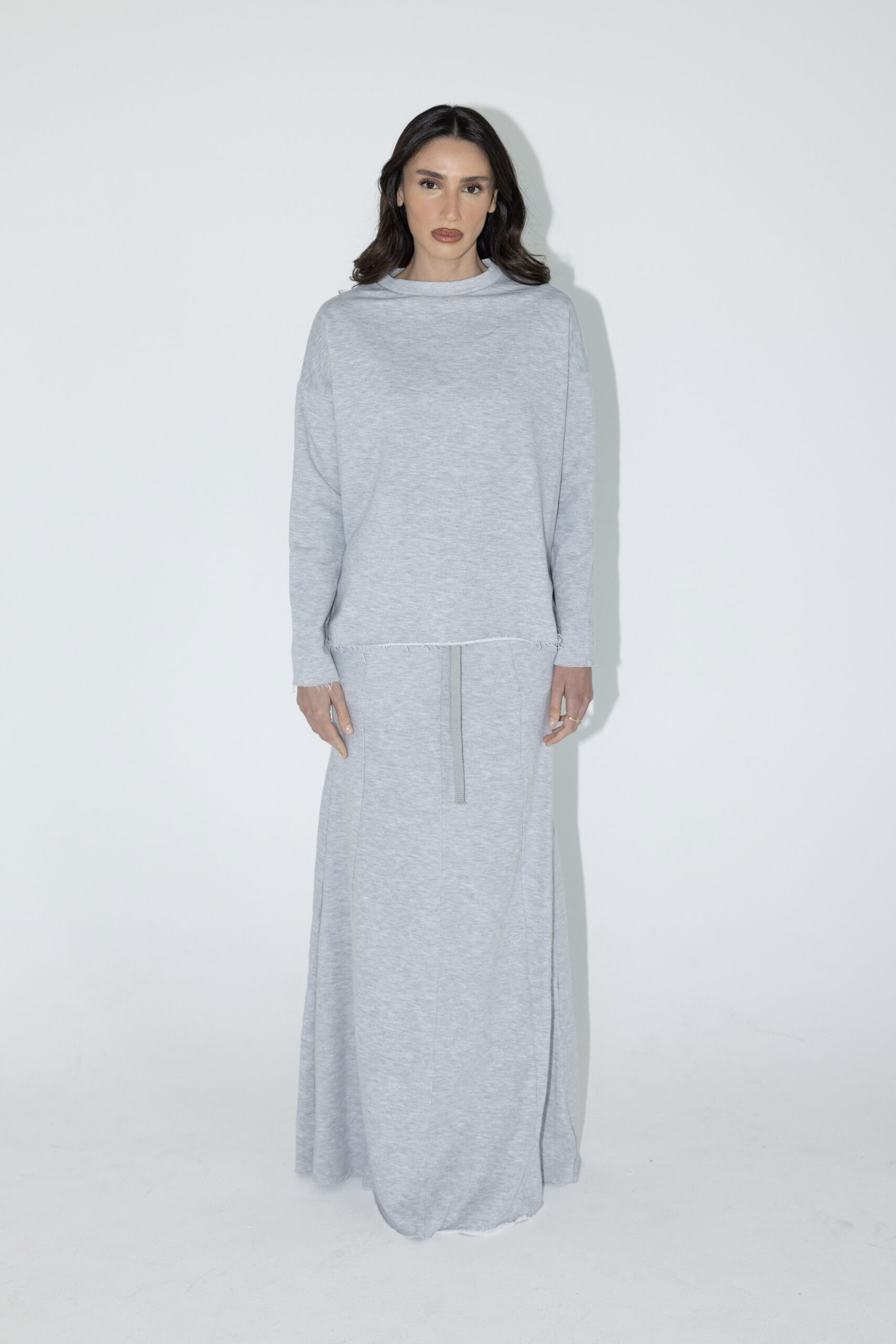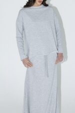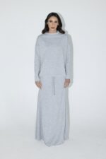 חליפת שני חלקים מושלמת, חולצה בגזרת אובר סייז עם שרוולים ארוכים וחצאית בגזרת A עם ציפורים מקדימה ושסע אחורי.