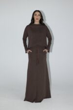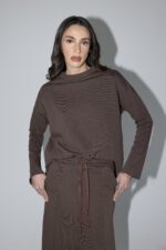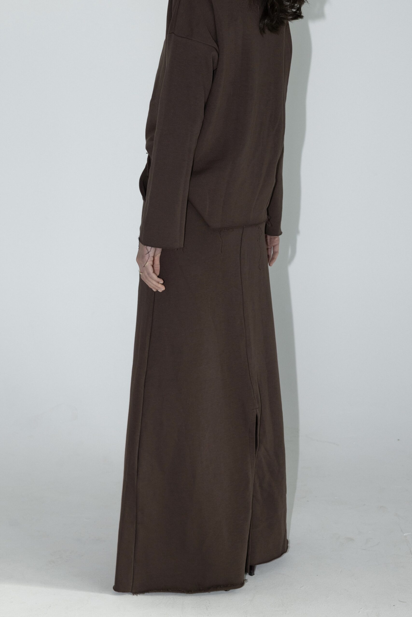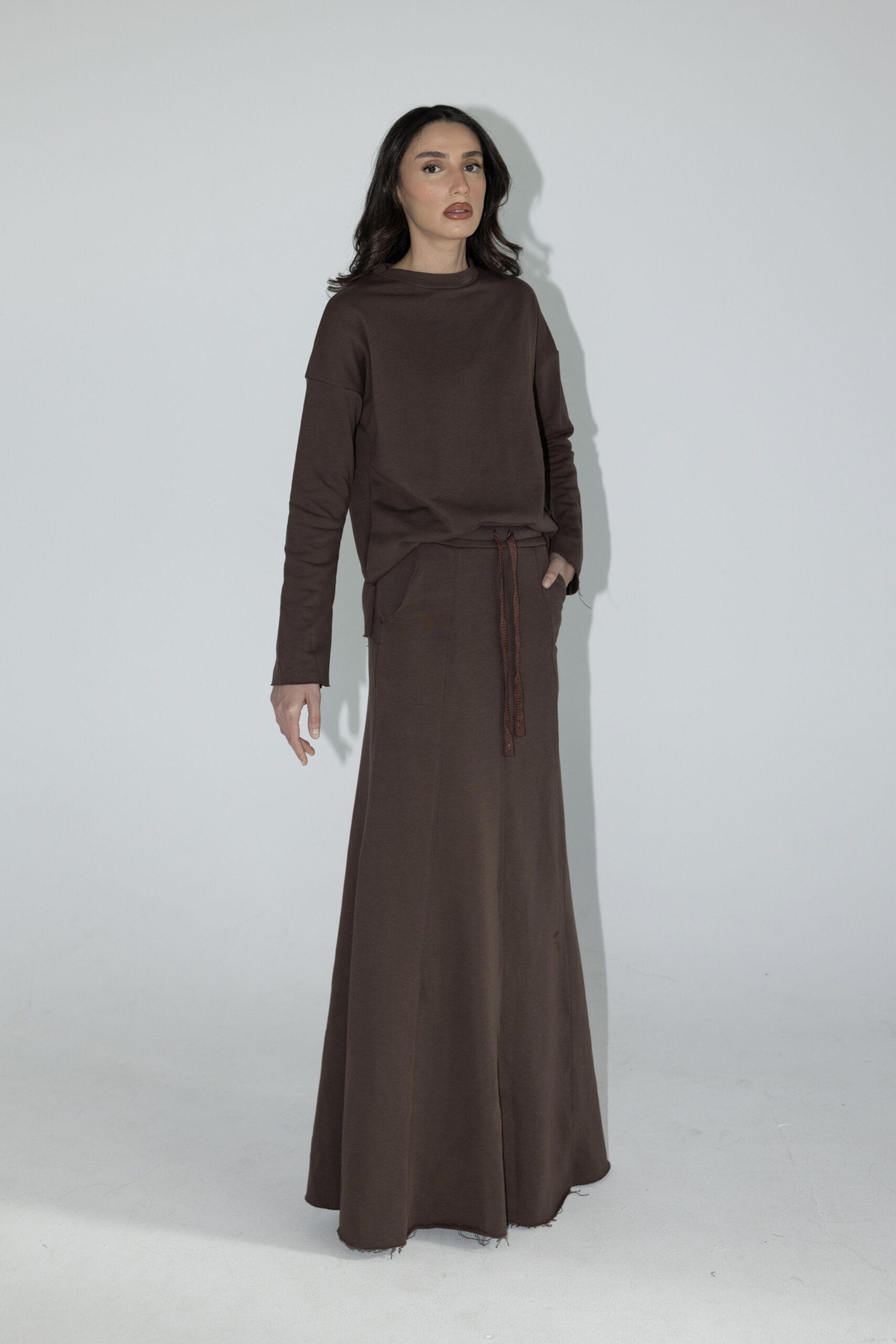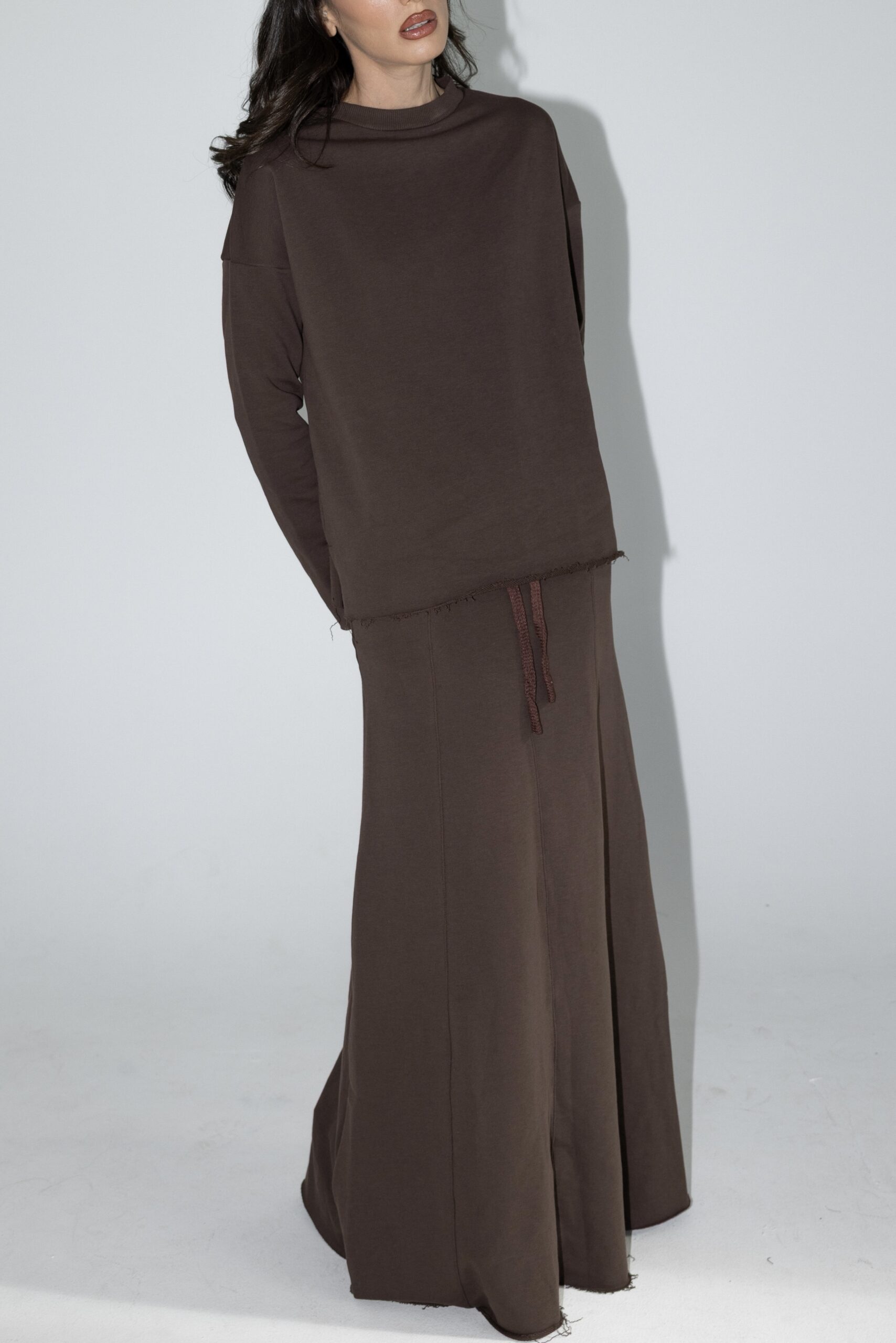חליפת שני חלקים מושלמת, חולצה בגזרת אובר סייז עם שרוולים ארוכים וחצאית בגזרת A עם ציפורים מקדימה ושסע אחורי.