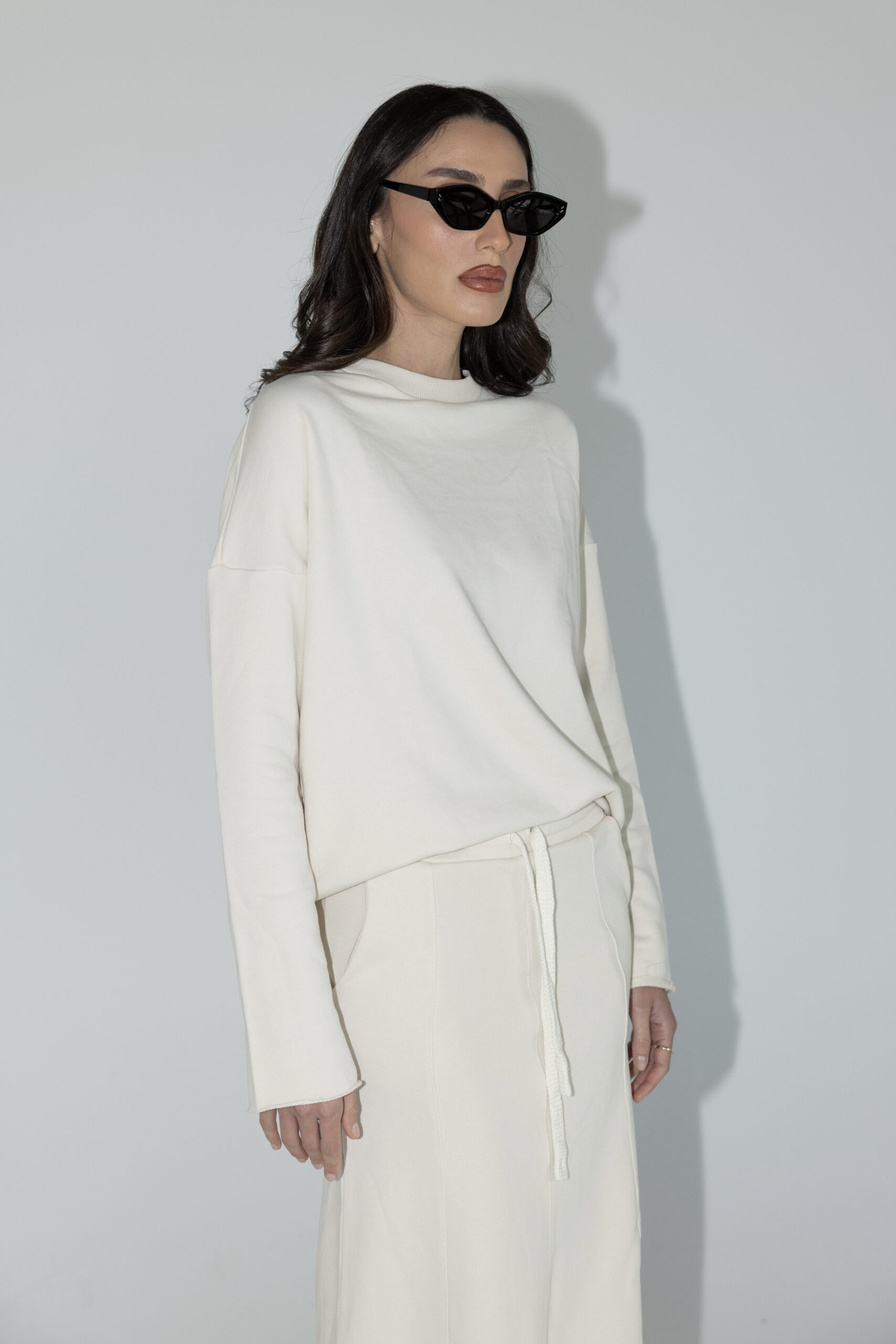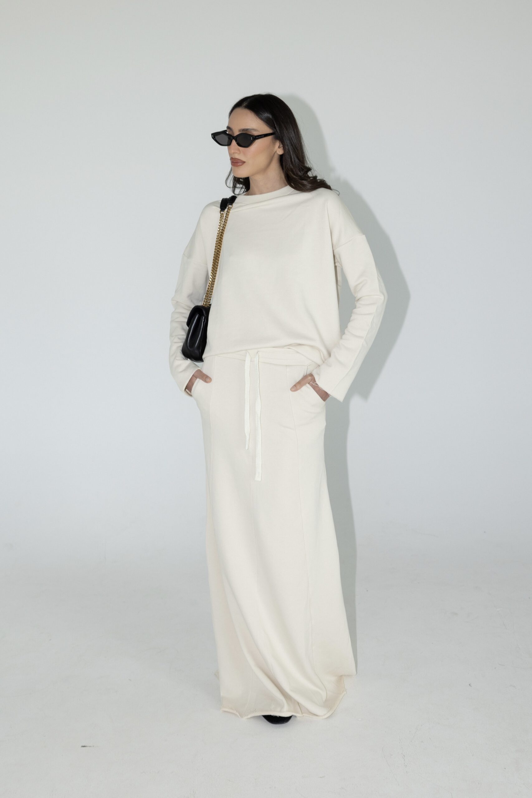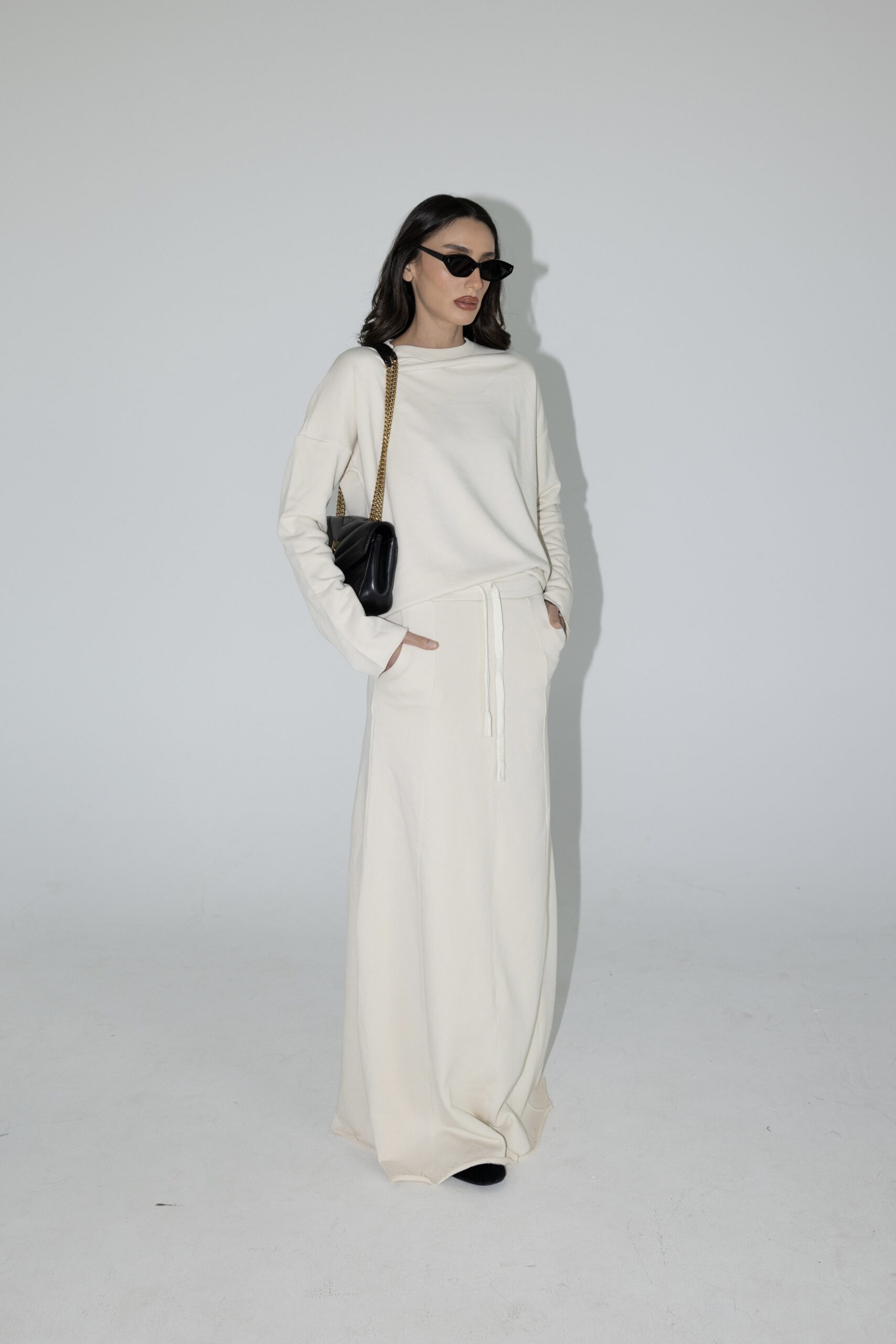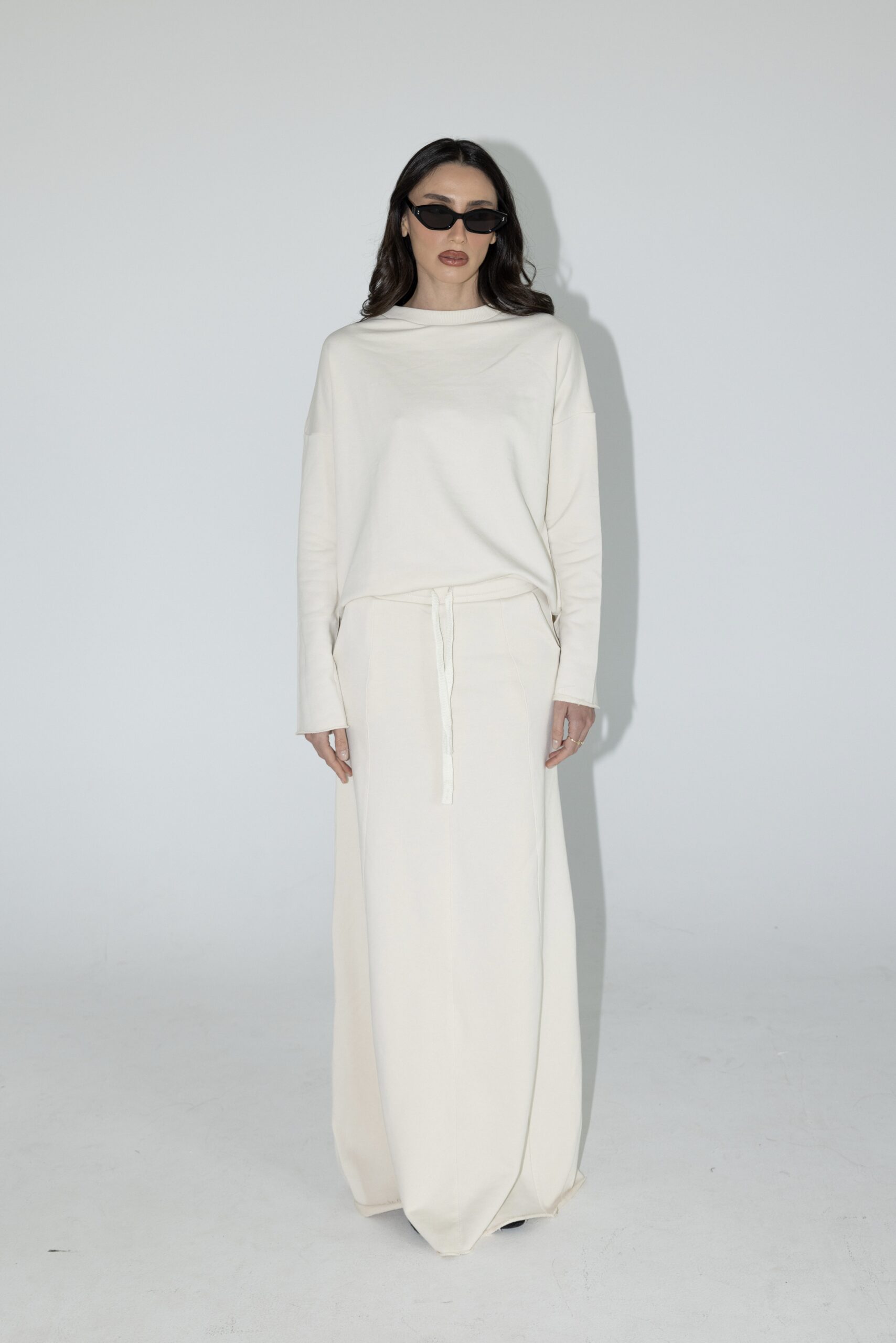 חליפת שני חלקים מושלמת, חולצה בגזרת אובר סייז עם שרוולים ארוכים וחצאית בגזרת A עם ציפורים מקדימה ושסע אחורי.