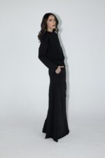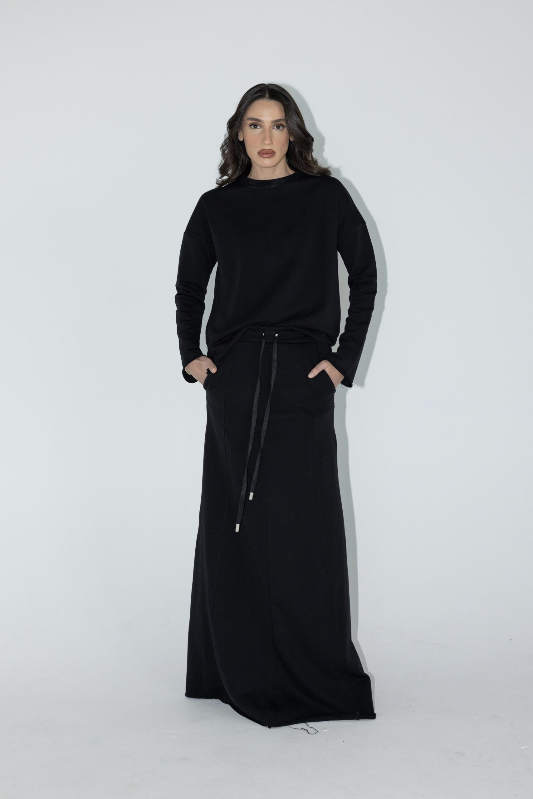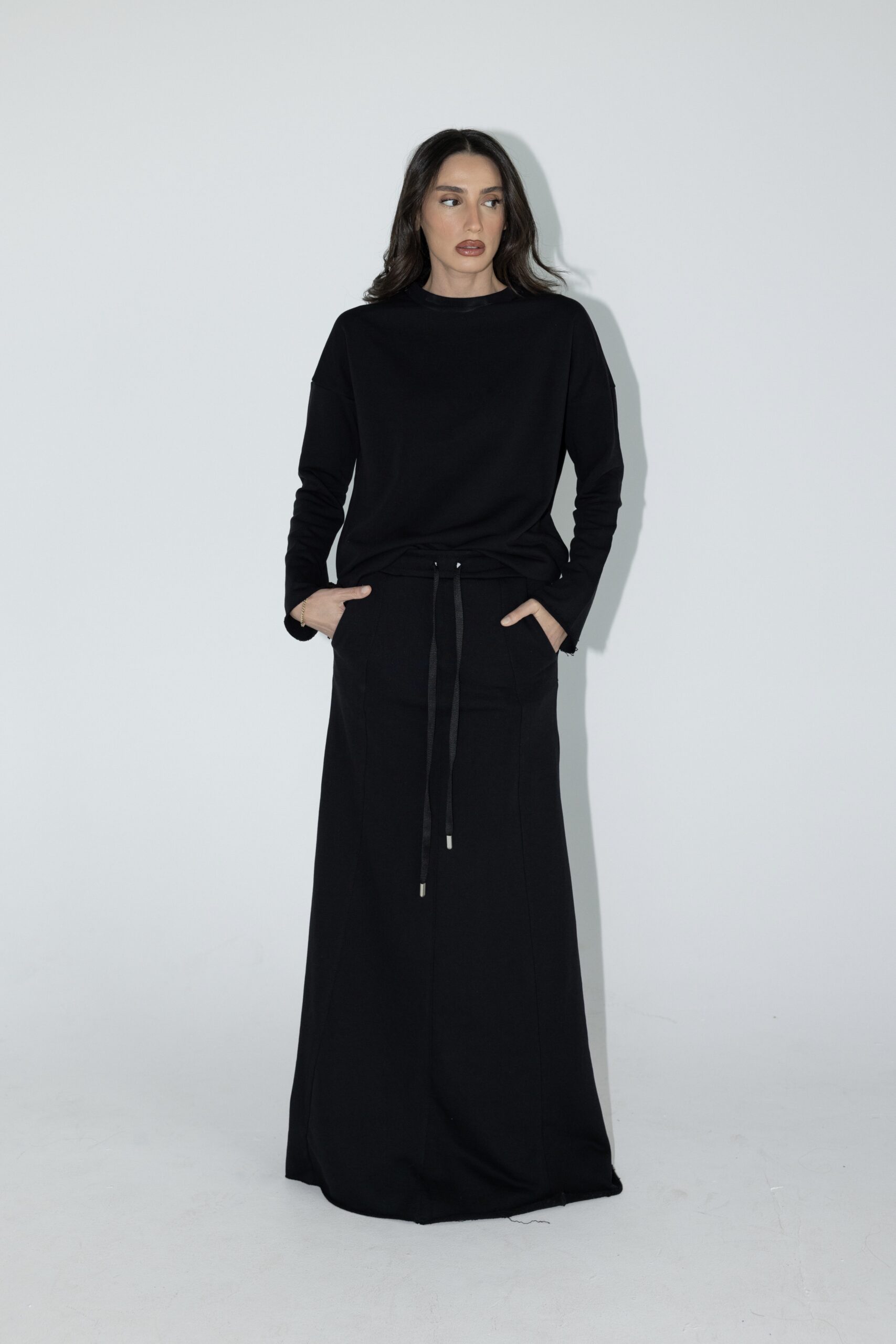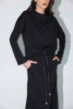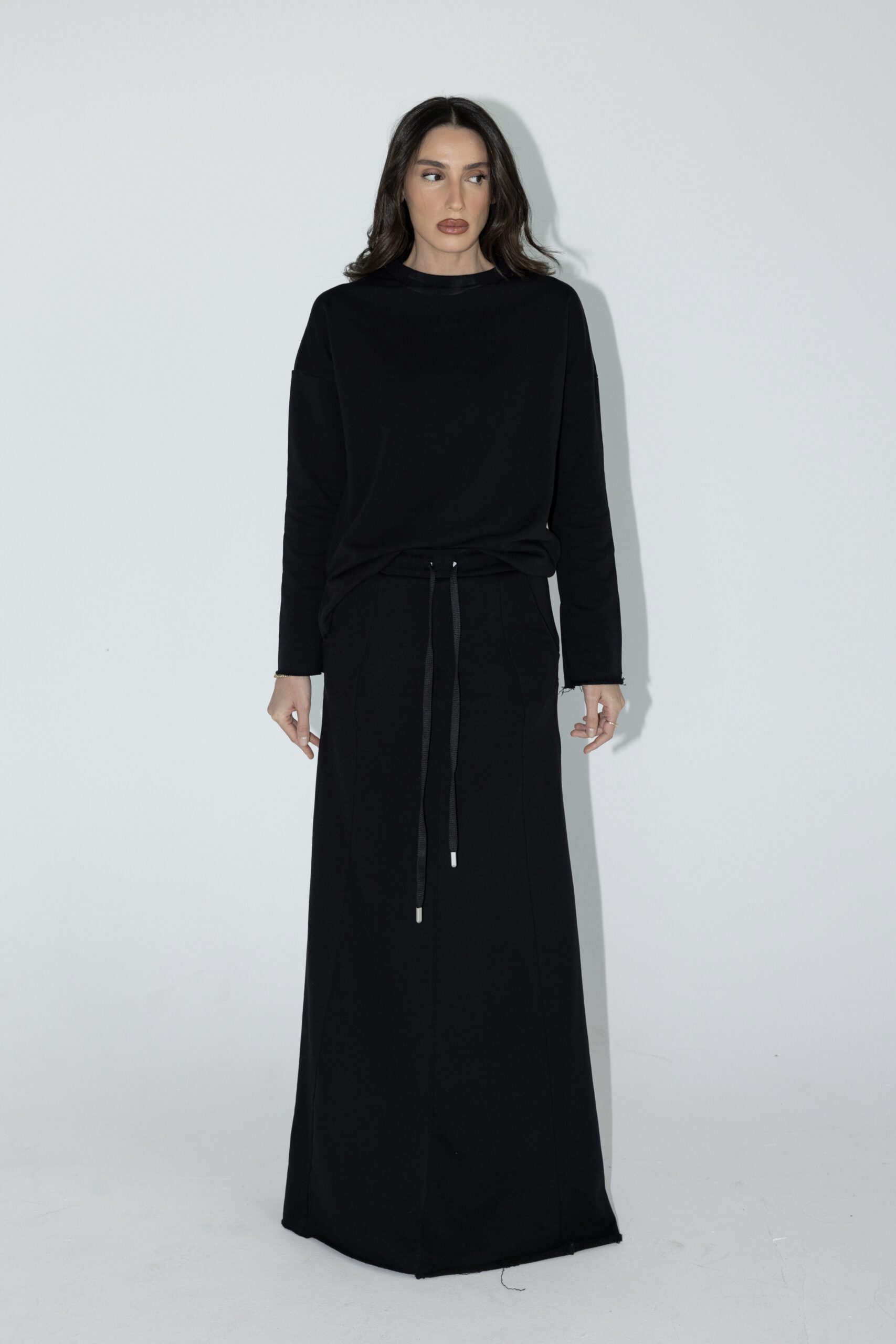 חליפת שני חלקים מושלמת, חולצה בגזרת אובר סייז עם שרוולים ארוכים וחצאית בגזרת A עם ציפורים מקדימה ושסע אחורי.