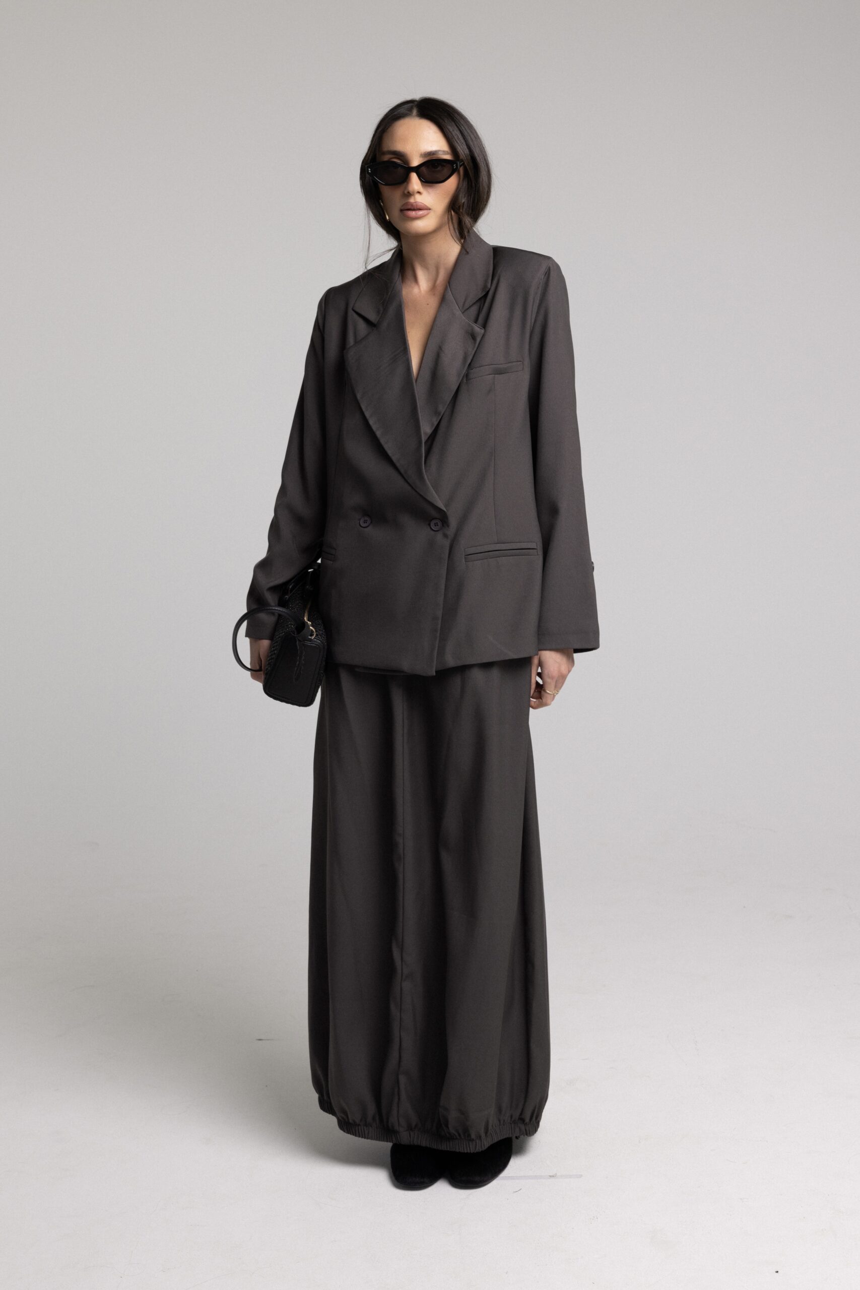 חליפת שני חלקים, ג׳קט מחויט וחצאית עם רוכסן קדמי וגומי למטה.