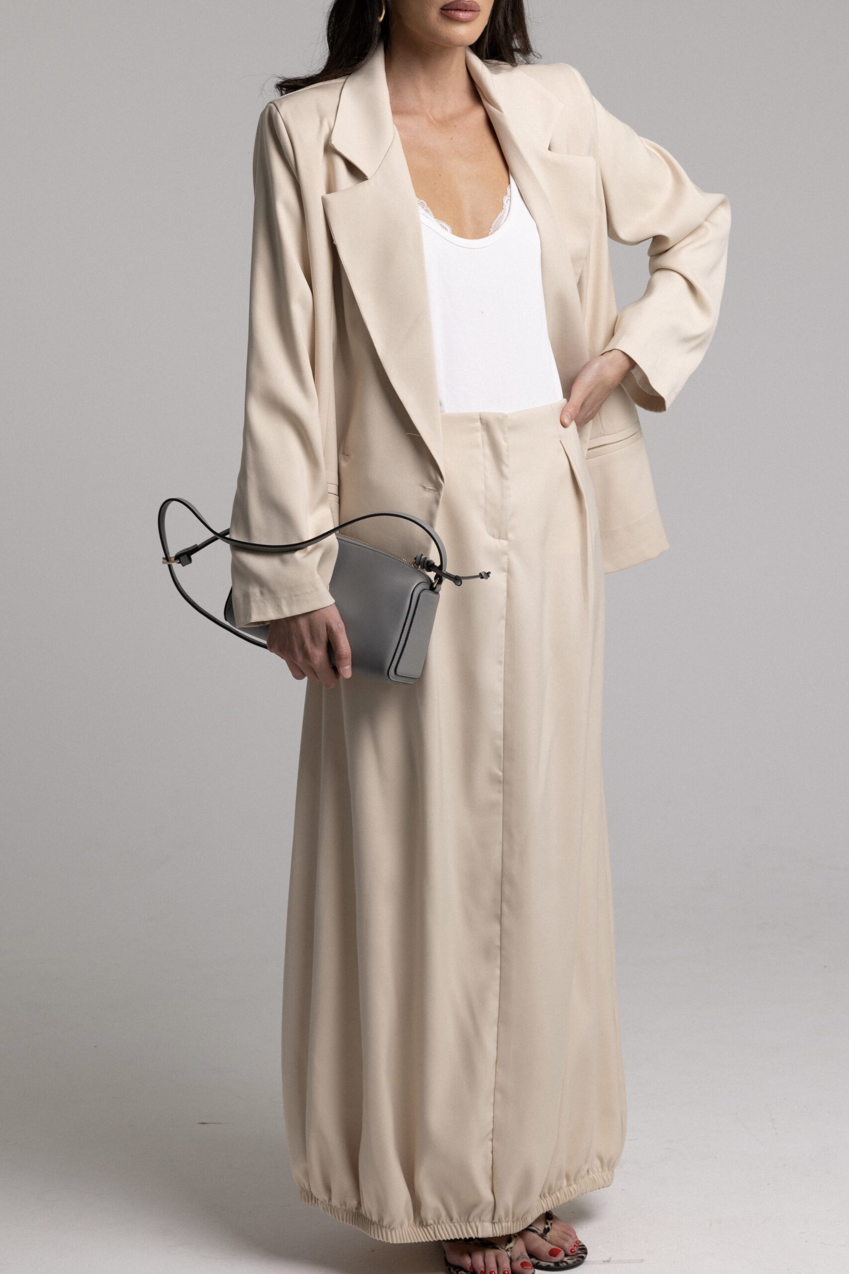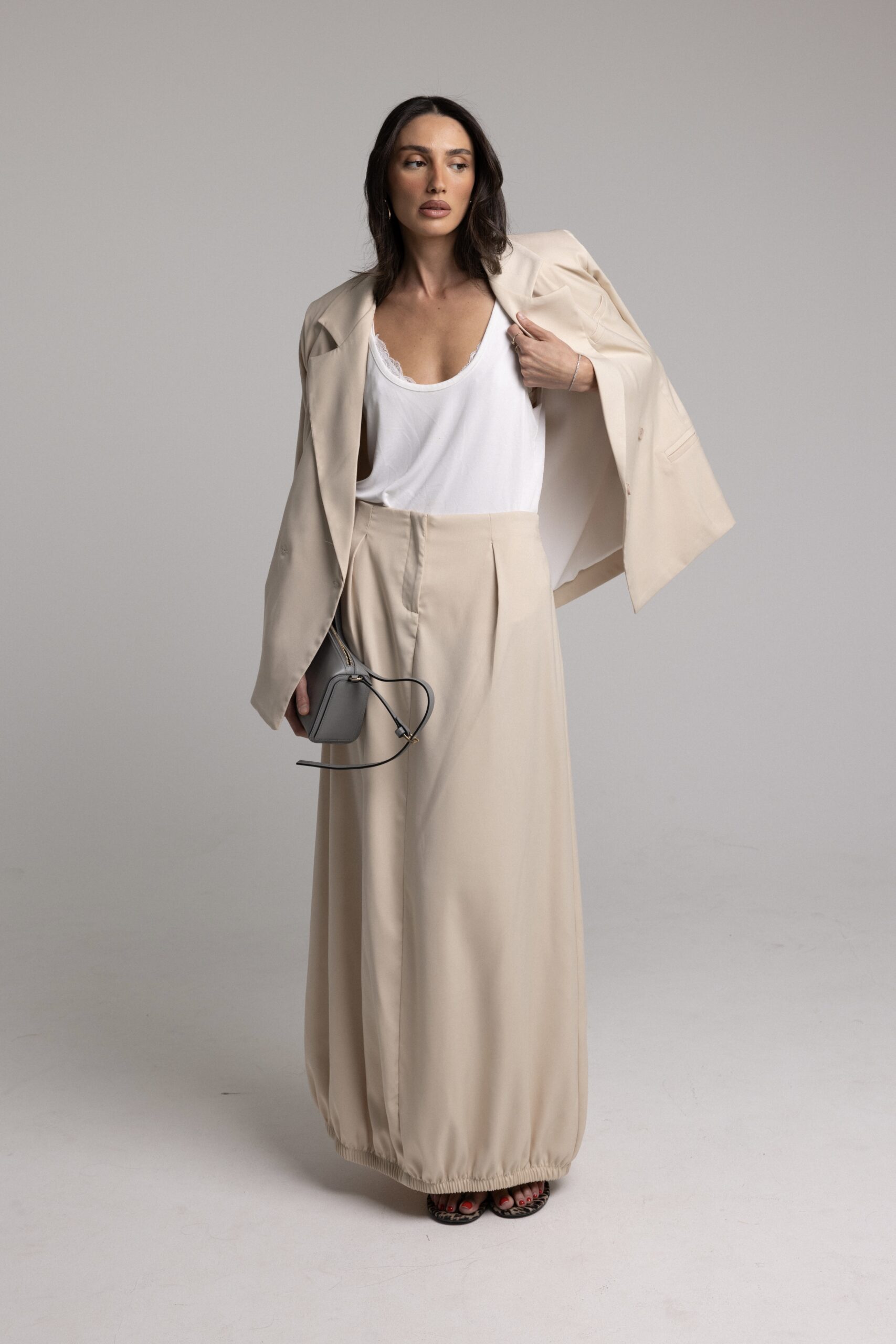 חליפת שני חלקים, ג׳קט מחויט וחצאית עם רוכסן קדמי וגומי למטה.