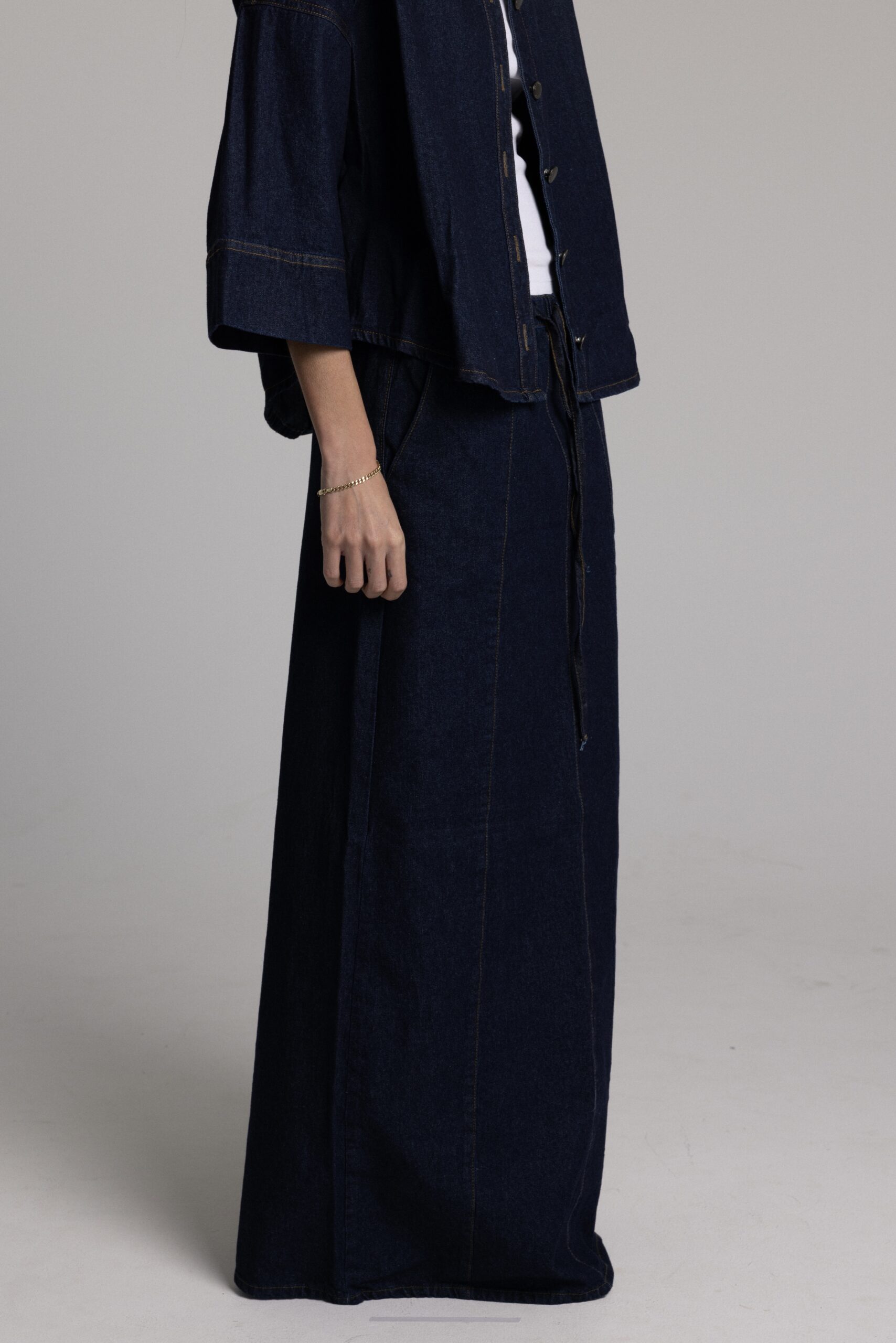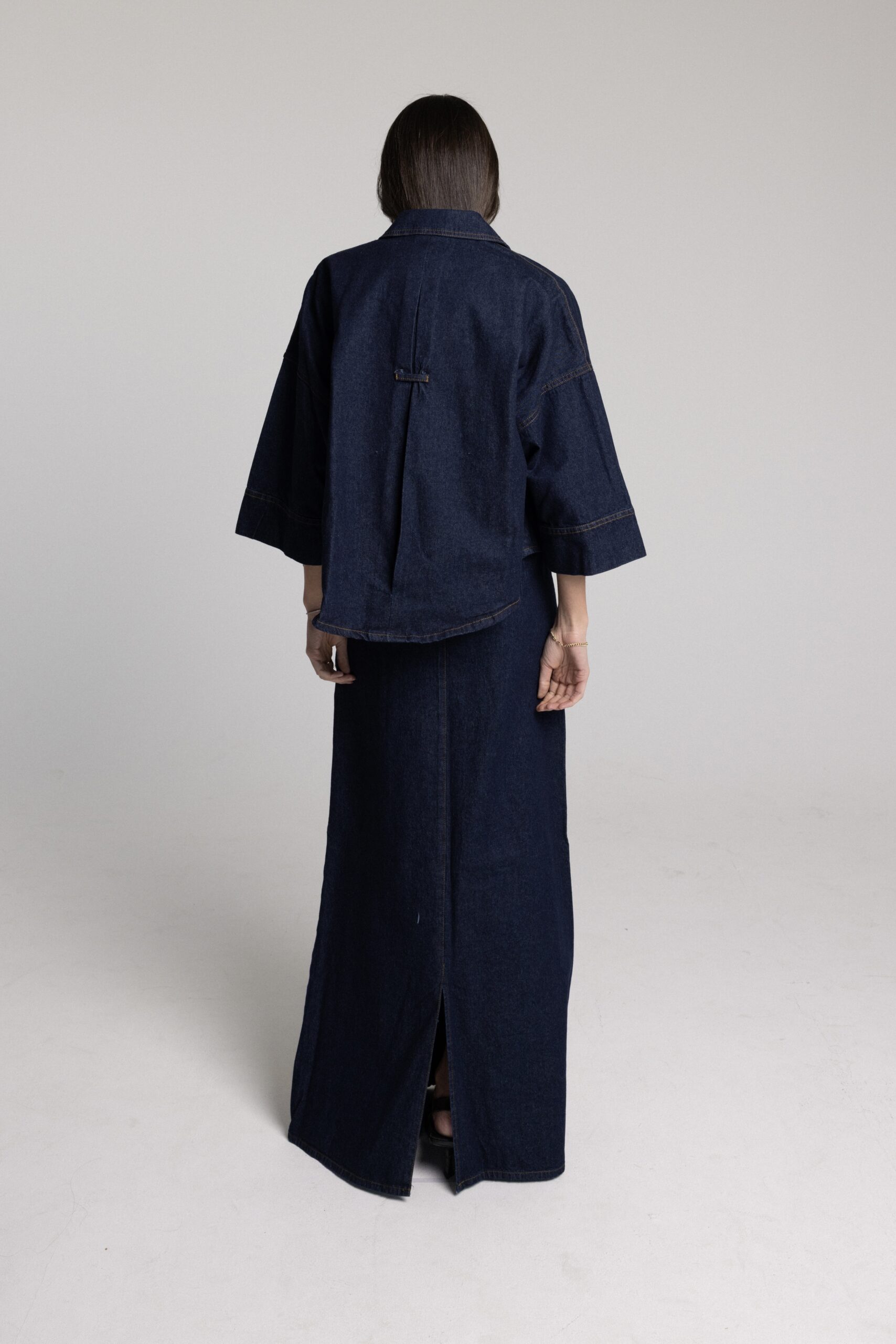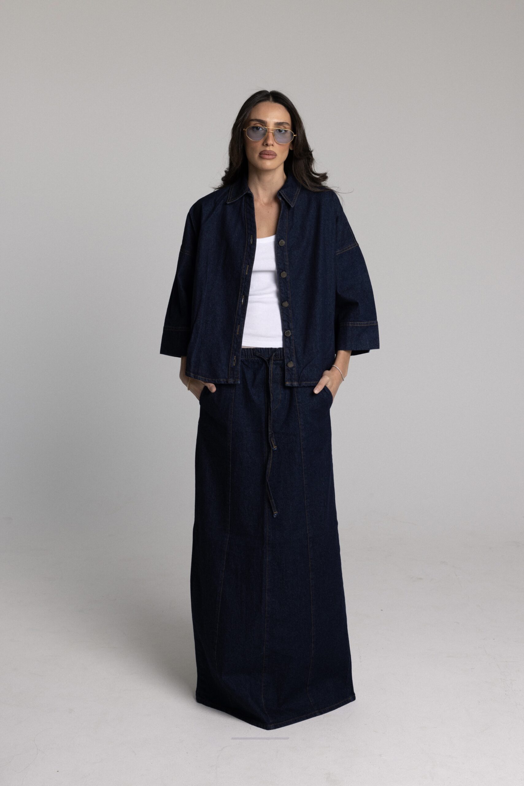 חליפת שני חלקים ג׳קט בגזרת אובר סייז שרוול 3/4 עובר מרפק וחצאית מקסי עם תיפורים לאורך החצאית. מידת הבגד על הדוגמנית 0.