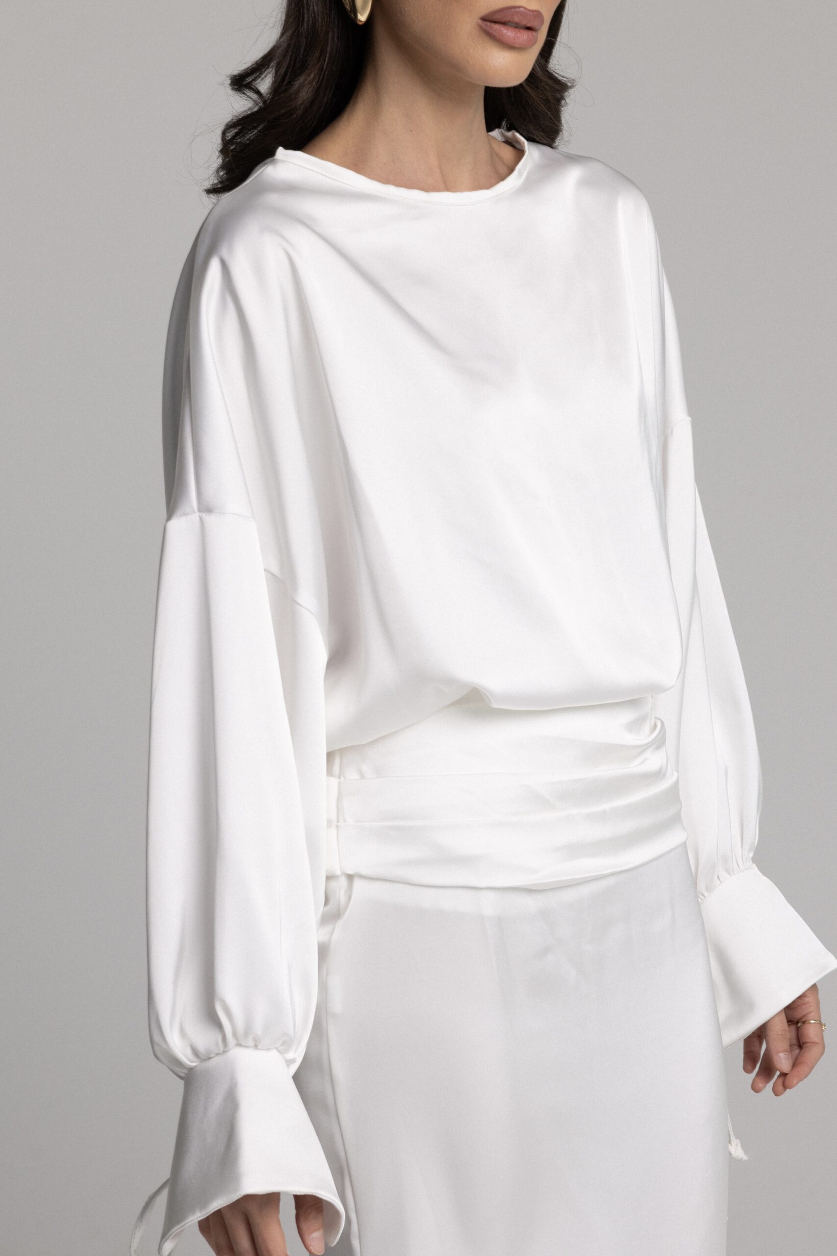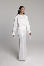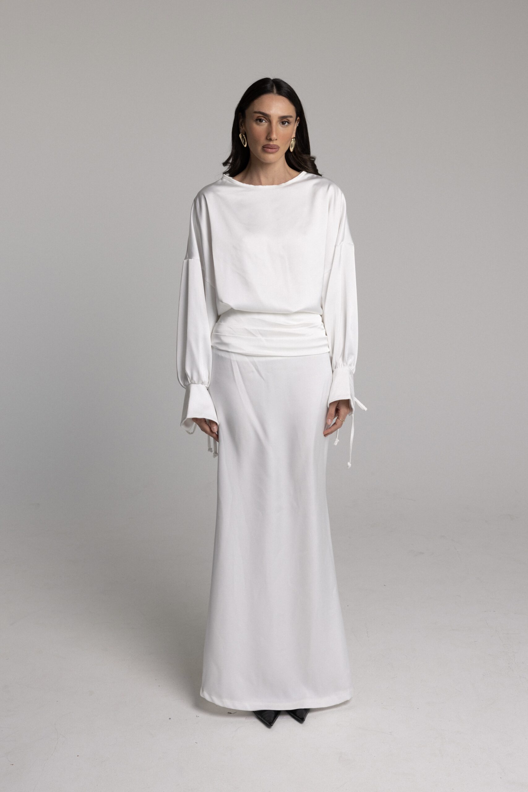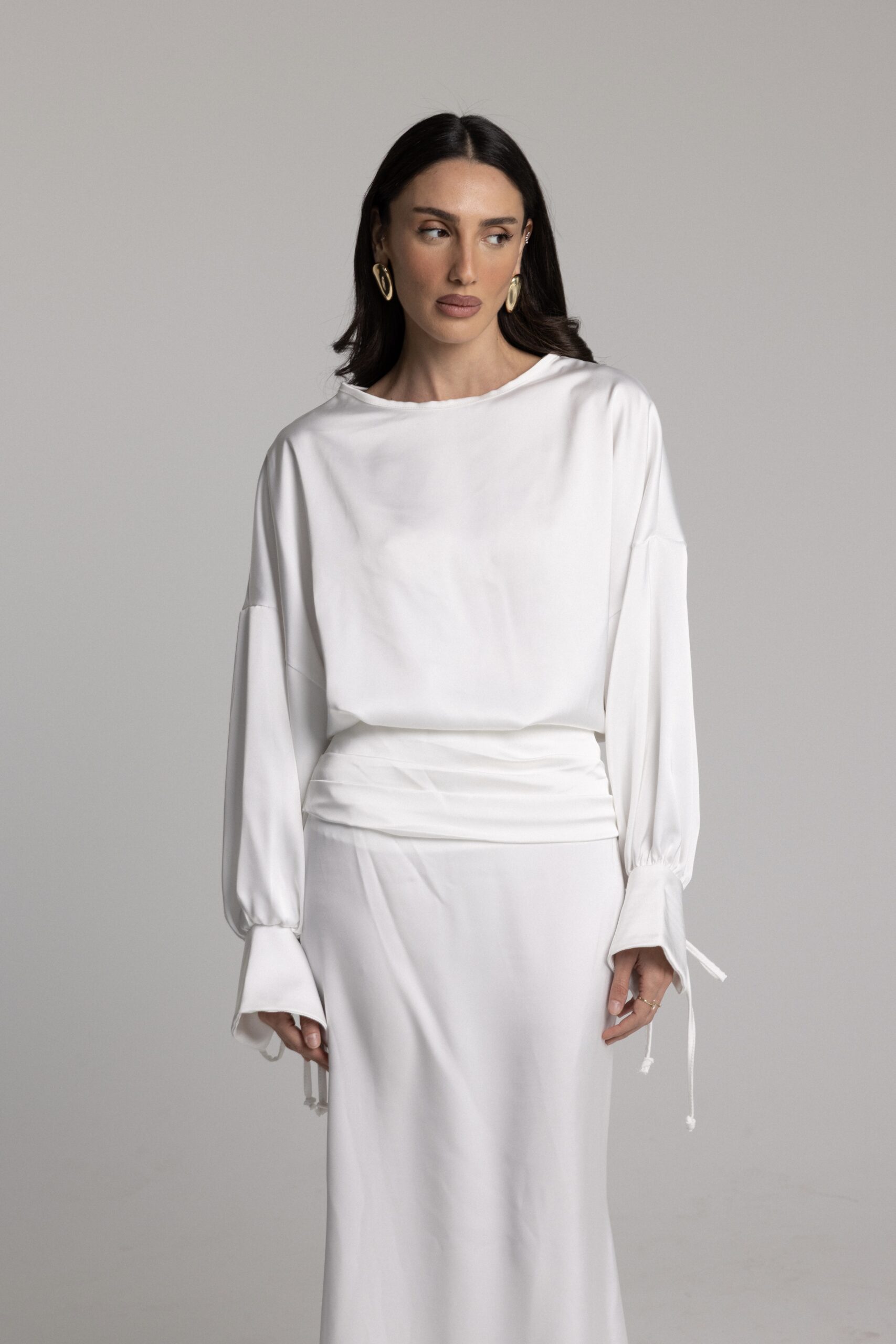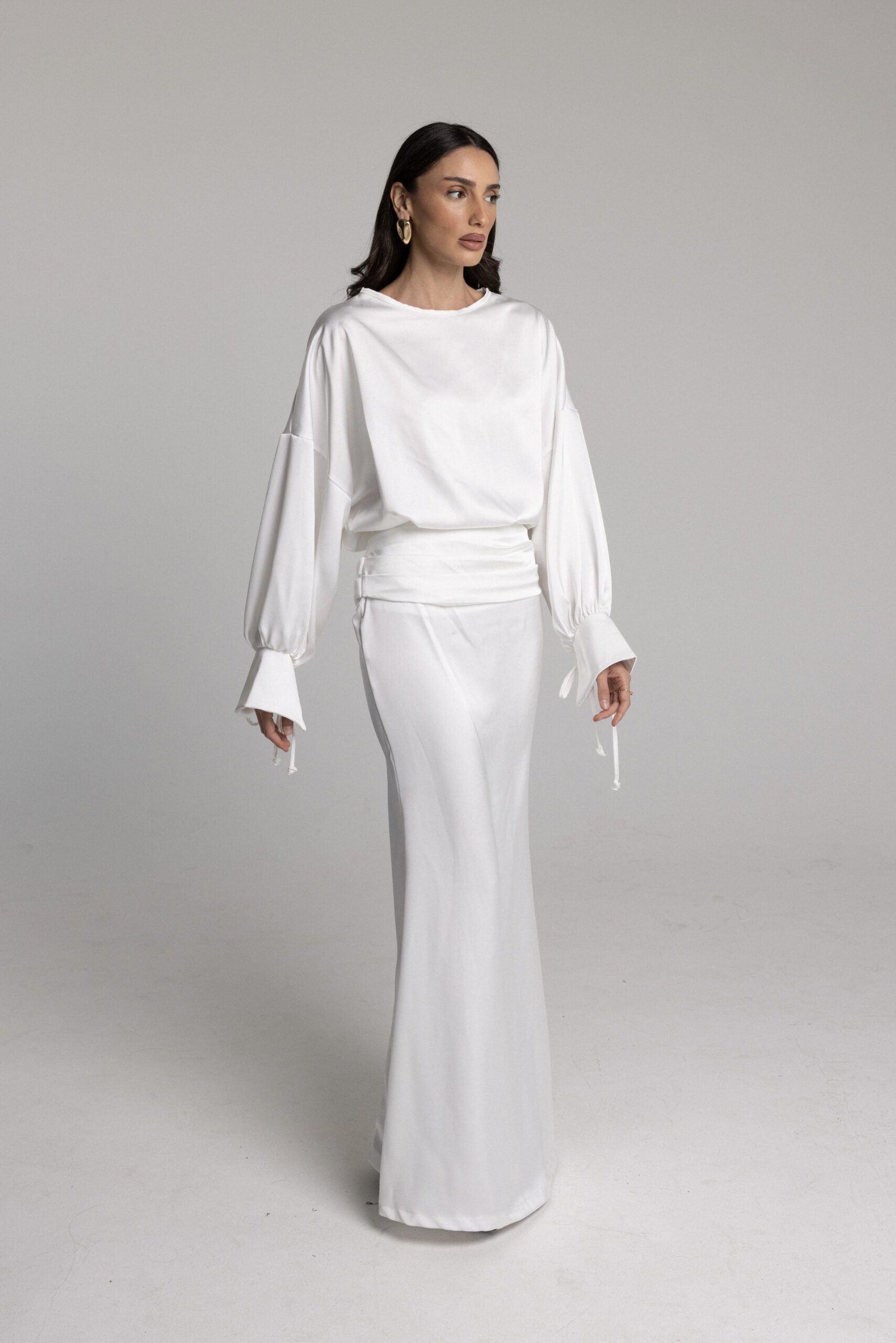 חליפת שני חלקים מבד סאטן, חולצה בגזרת אובר סייז וקשירות בידיים וחצאית מקסי עם כפלים באזור המותן.