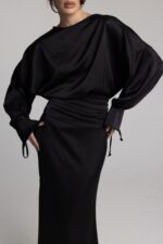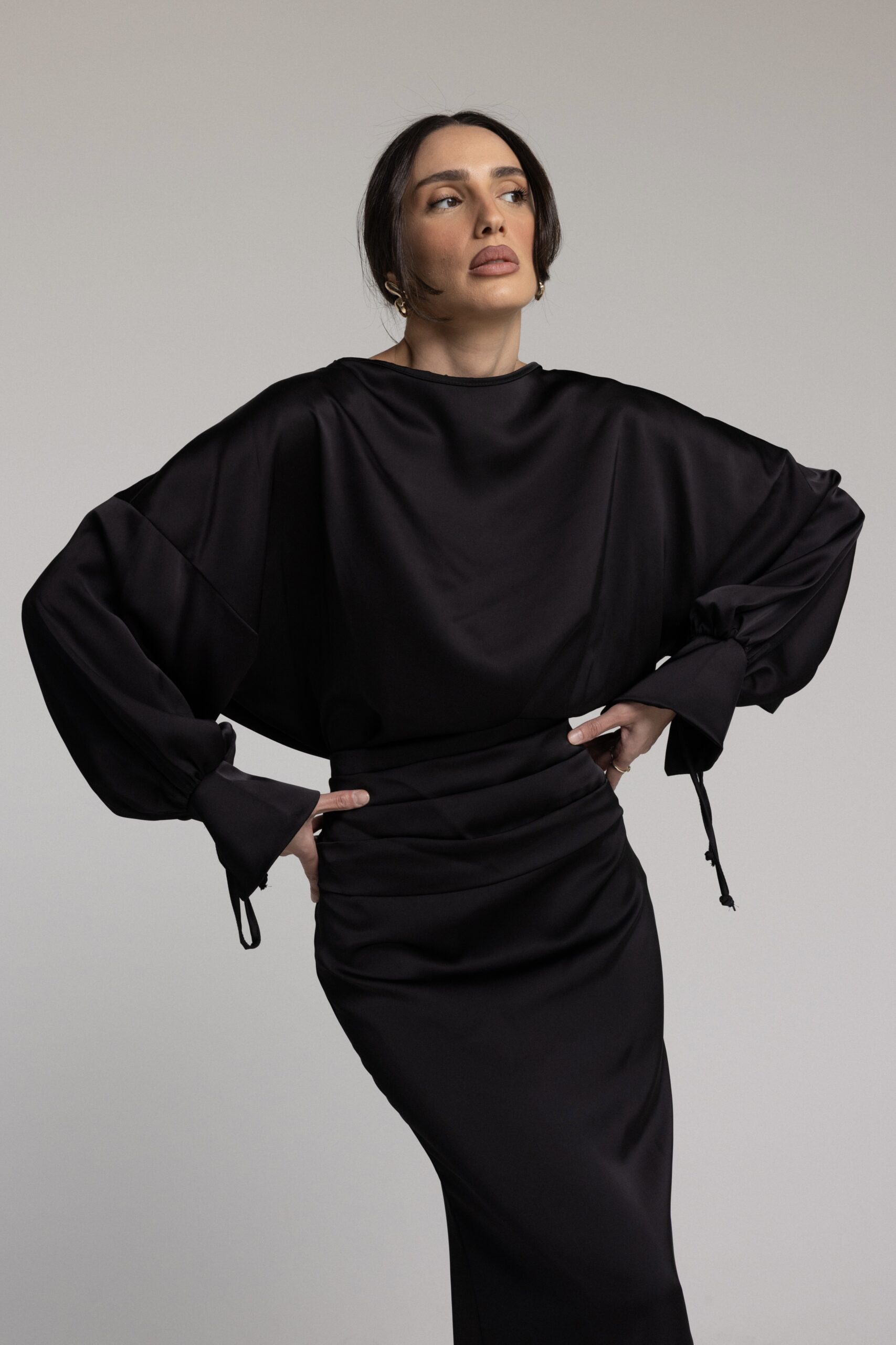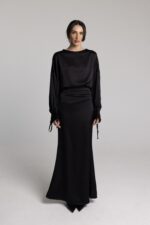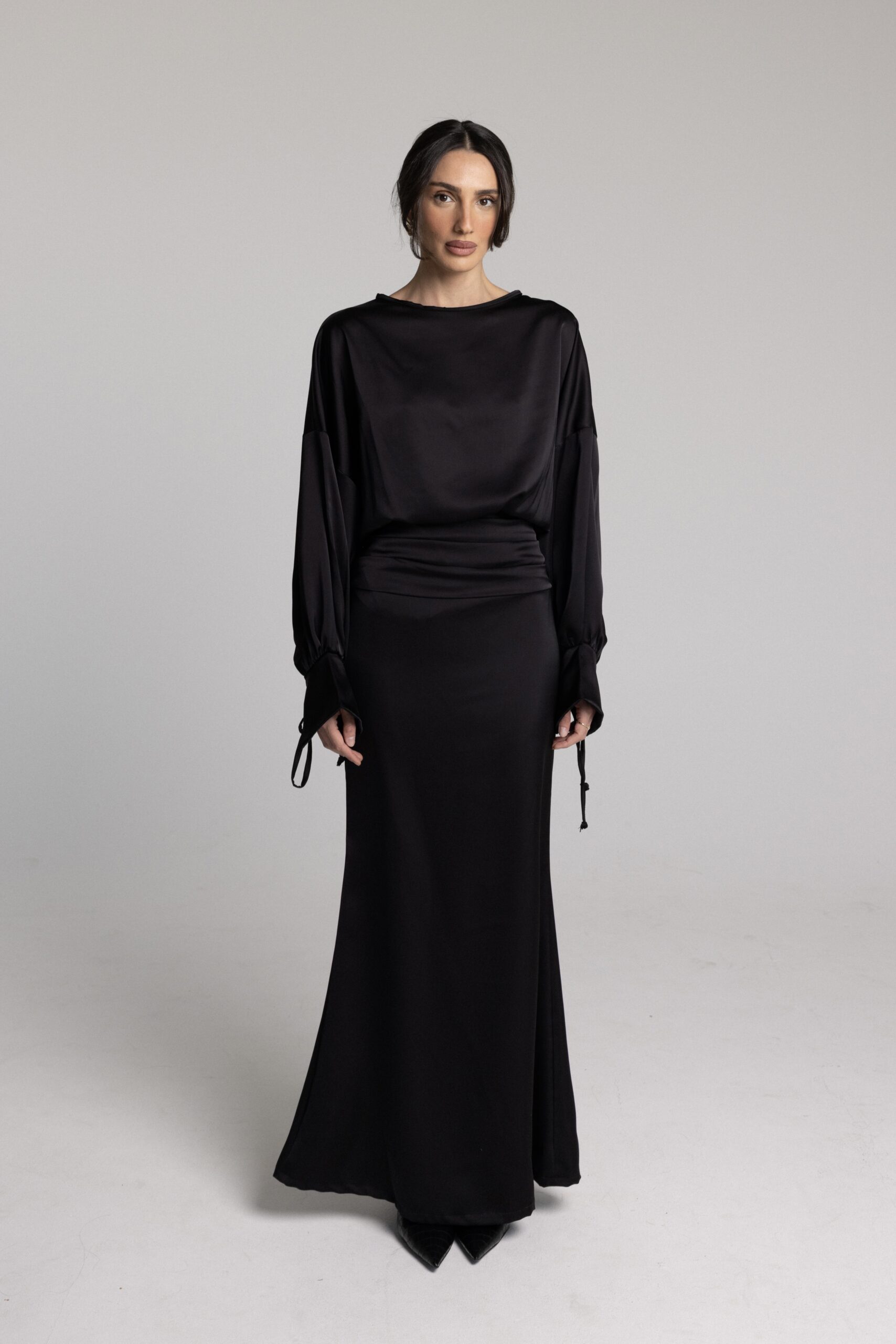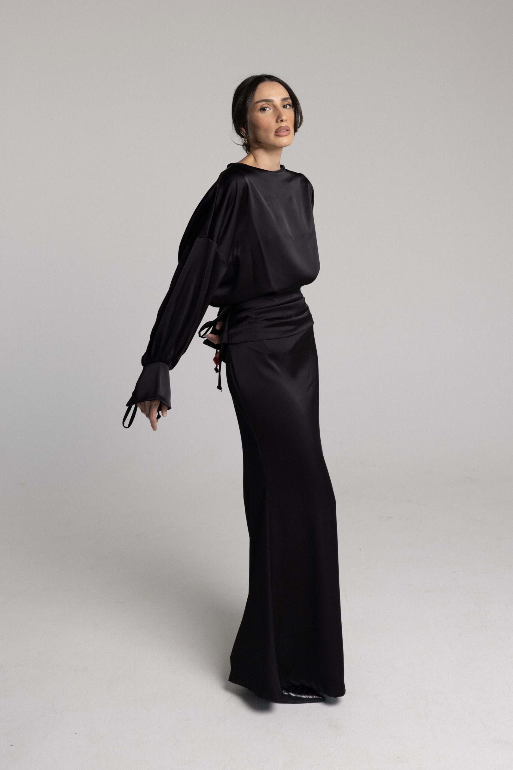 חליפת שני חלקים מבד סאטן, חולצה בגזרת אובר סייז וקשירות בידיים וחצאית מקסי עם כפלים באזור המותן.