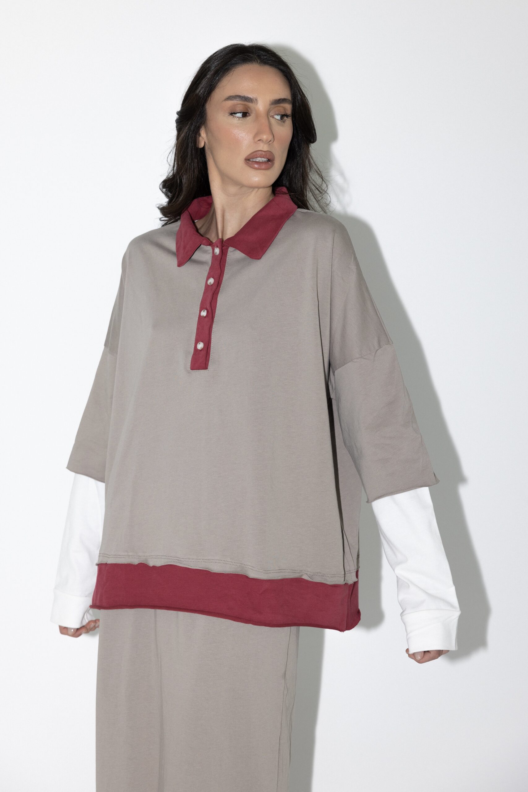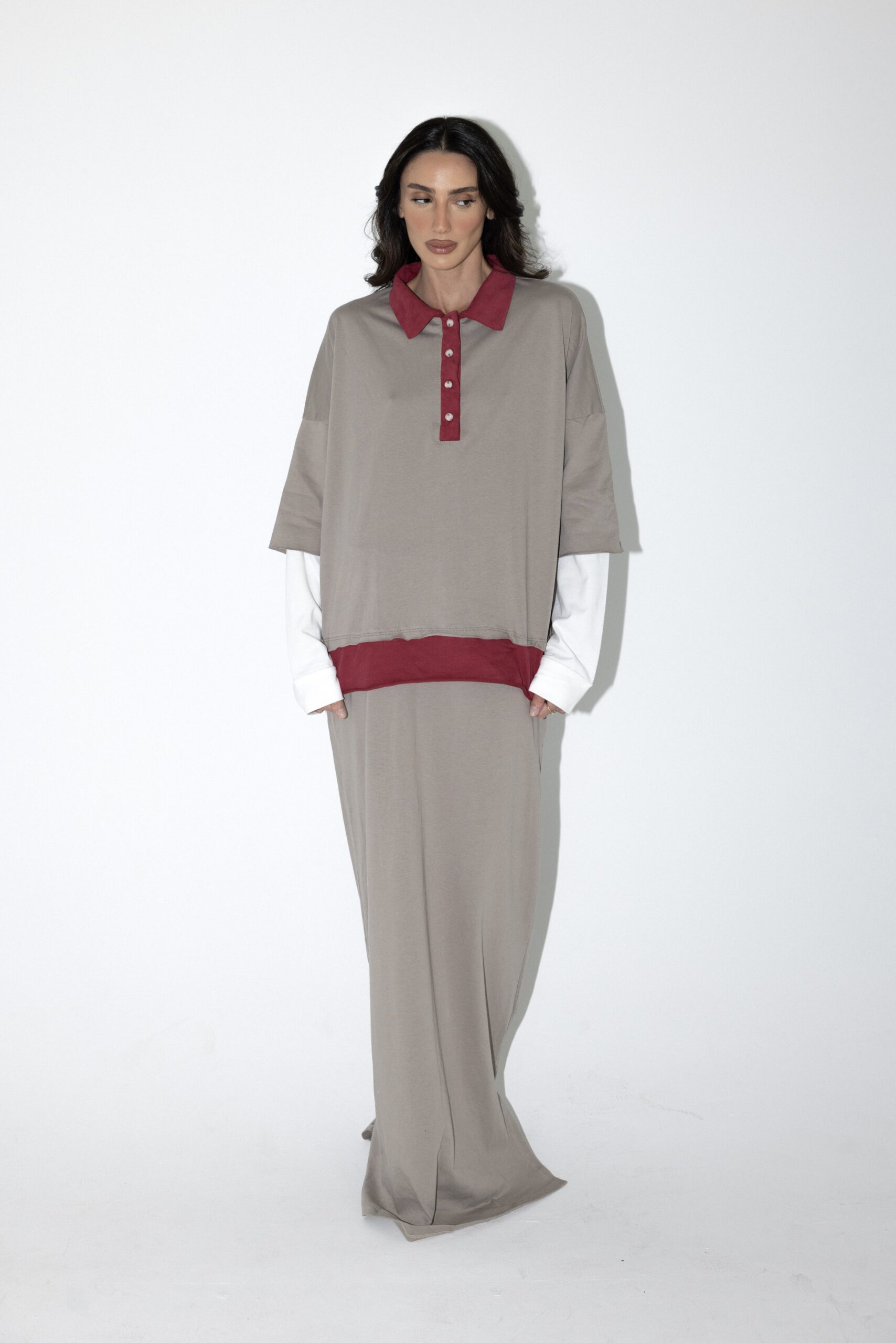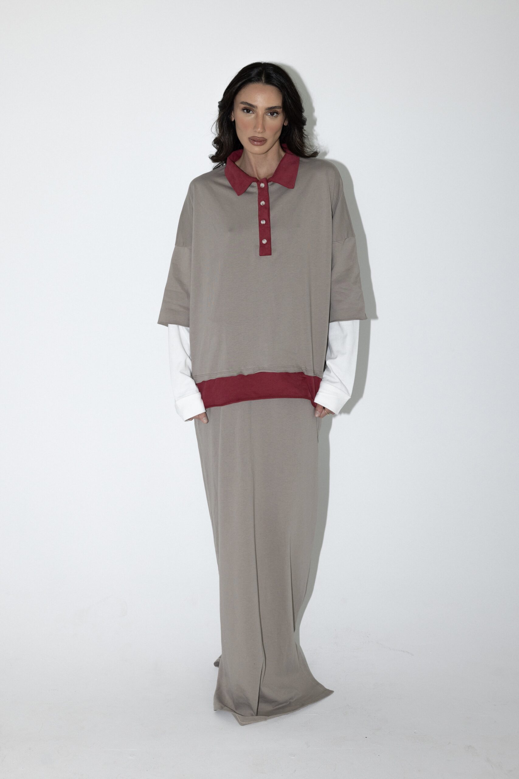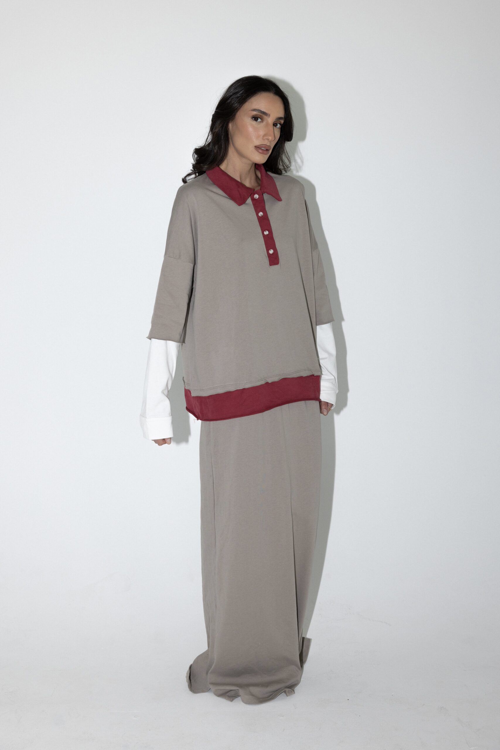 חליפת שני חלקים מבד קליל ונעים, חולצת אובר סייז ארוכה עם צווארון וחצאית מקסי עם גומי למעלה.