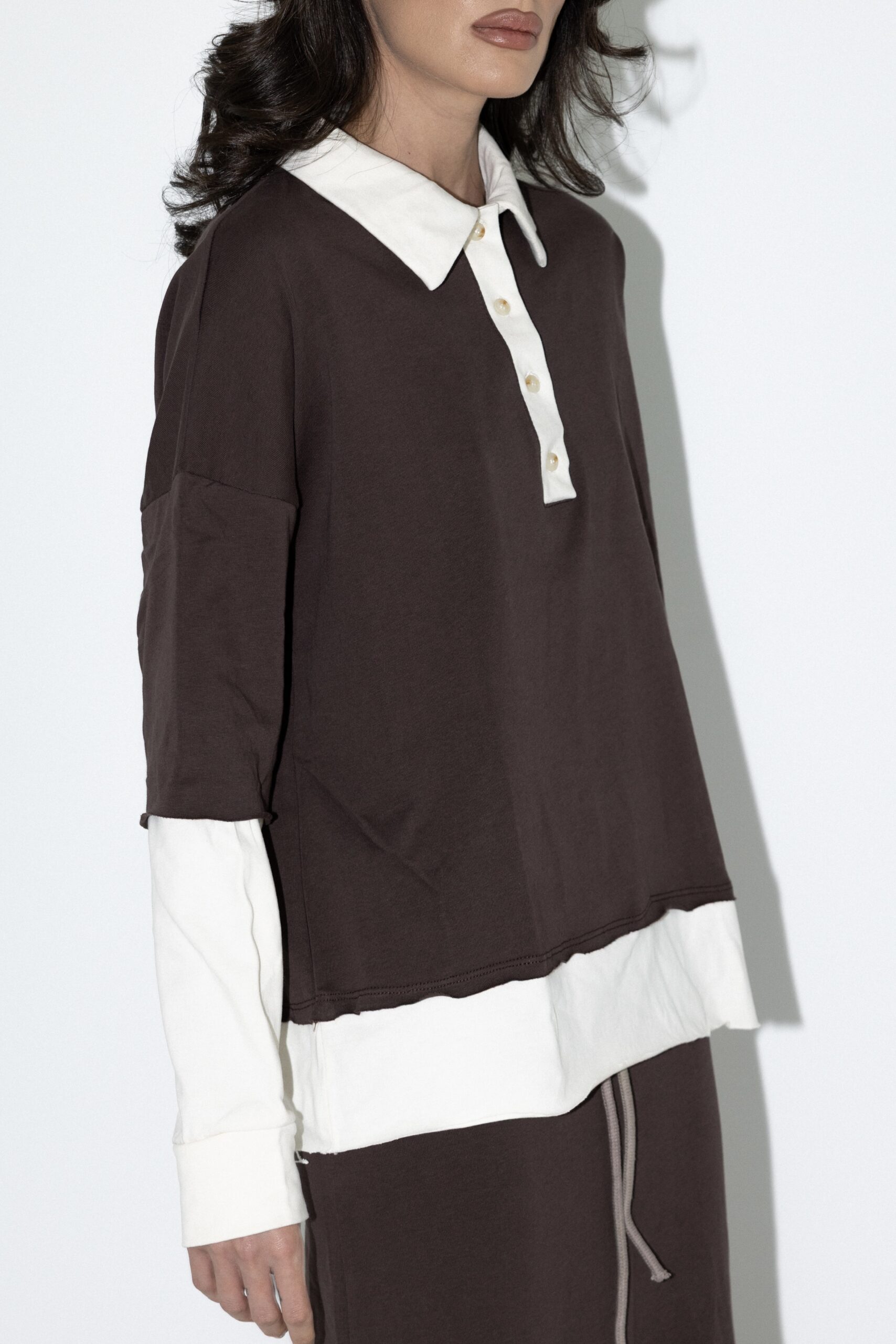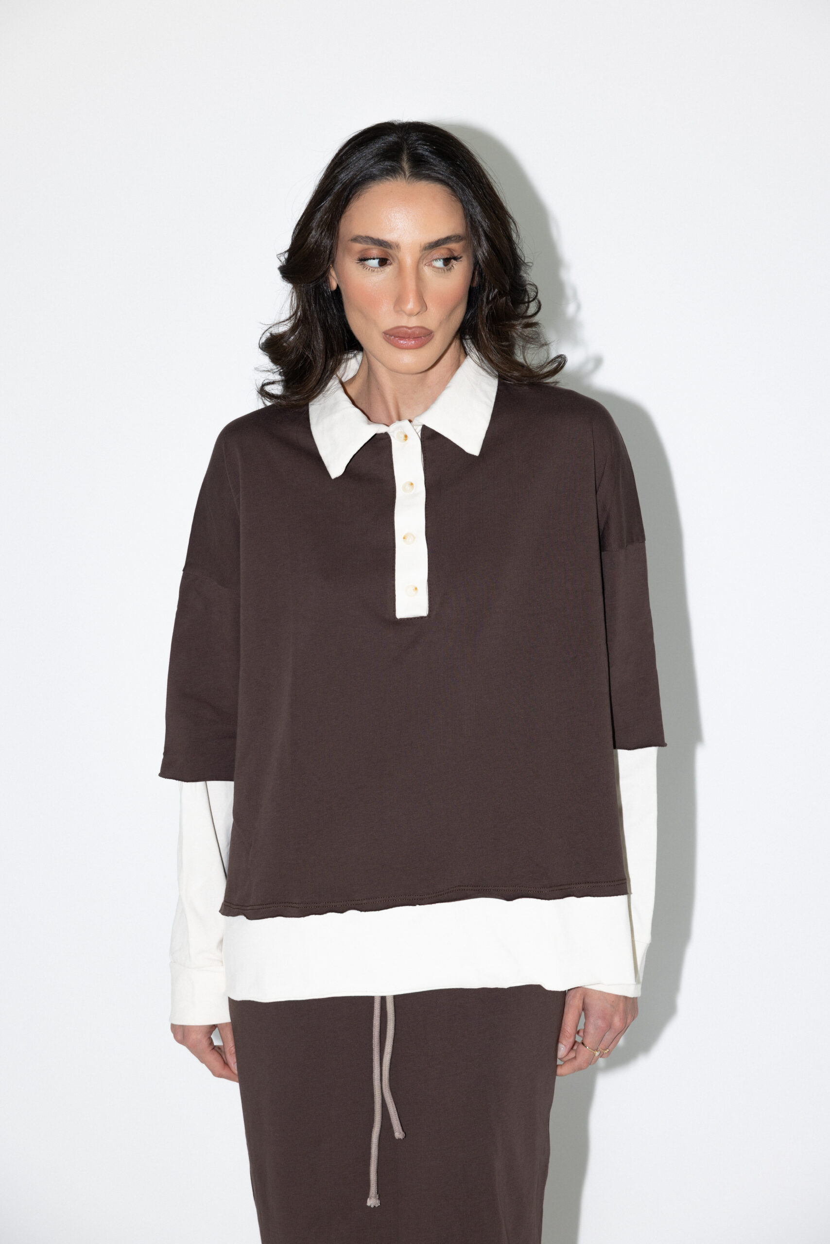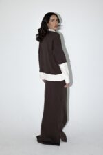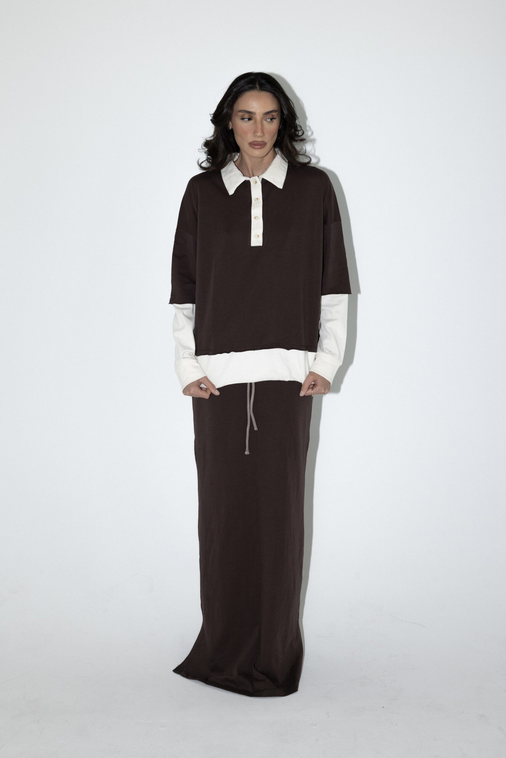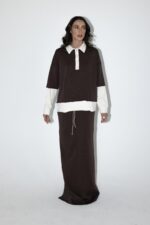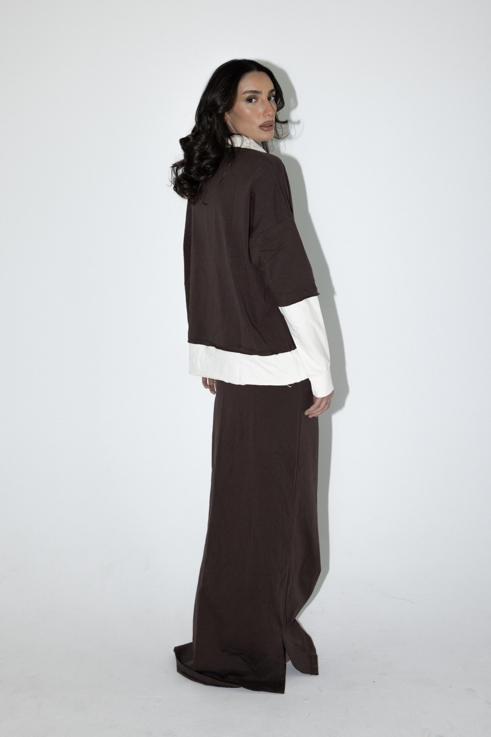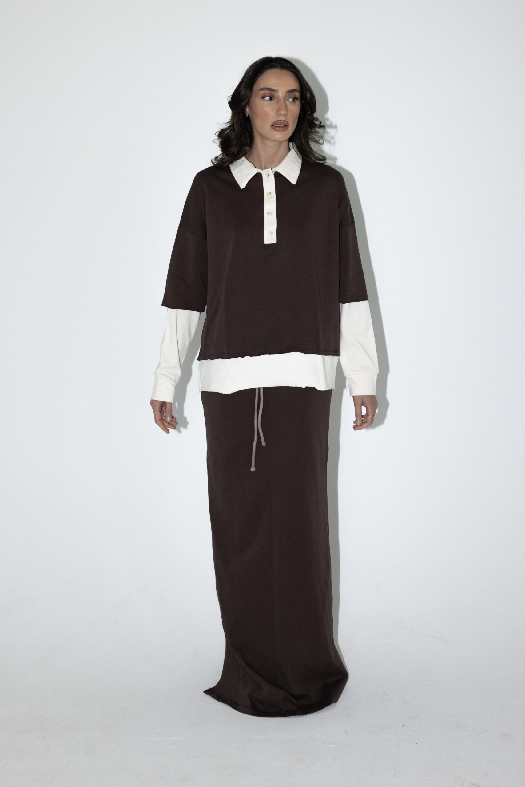 חליפת שני חלקים מבד קליל ונעים, חולצת אובר סייז ארוכה עם צווארון וחצאית מקסי עם גומי למעלה.