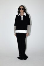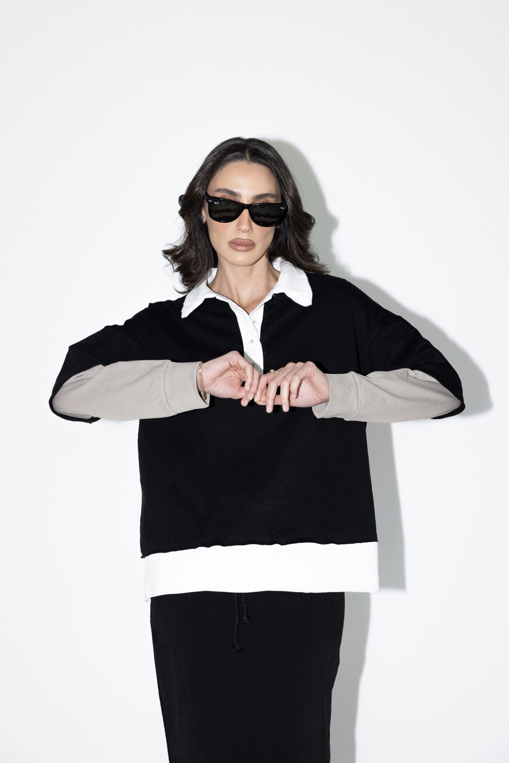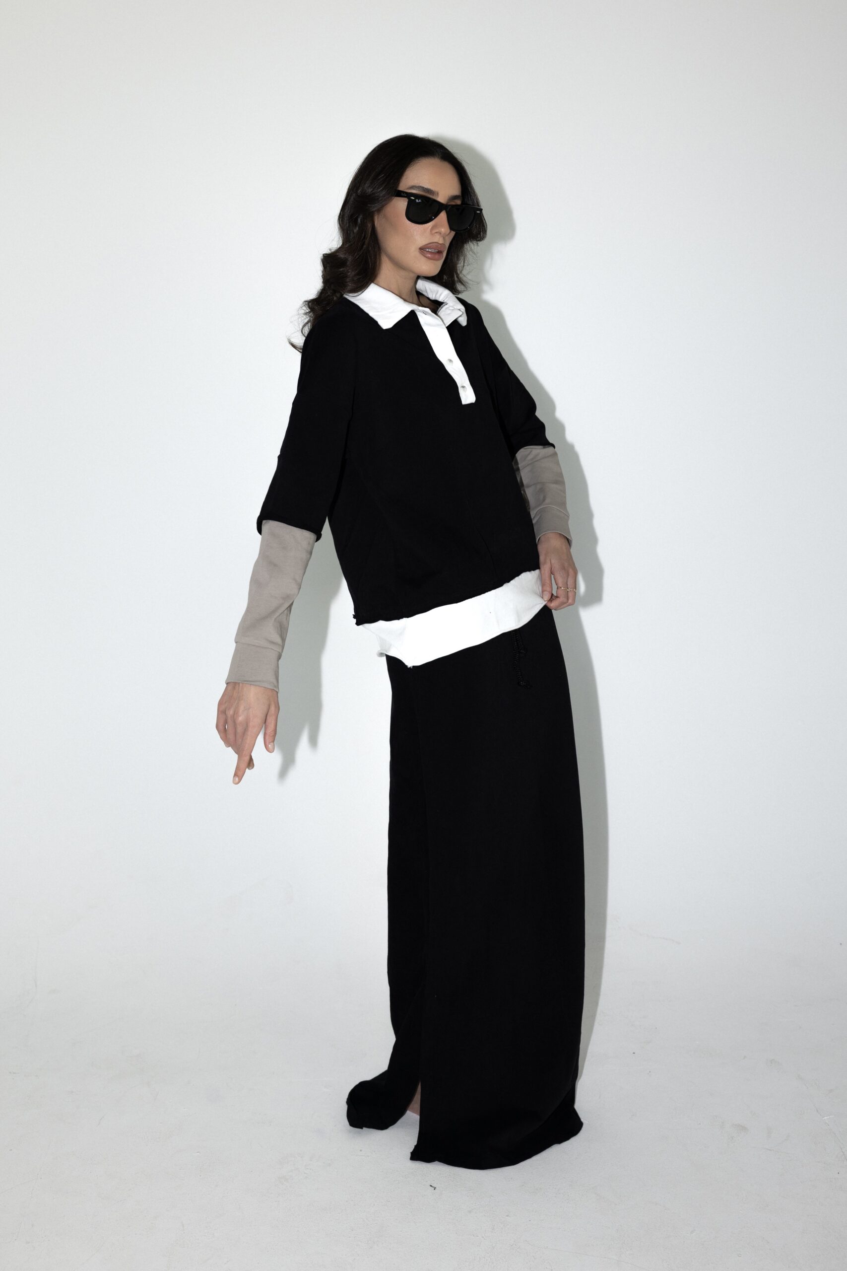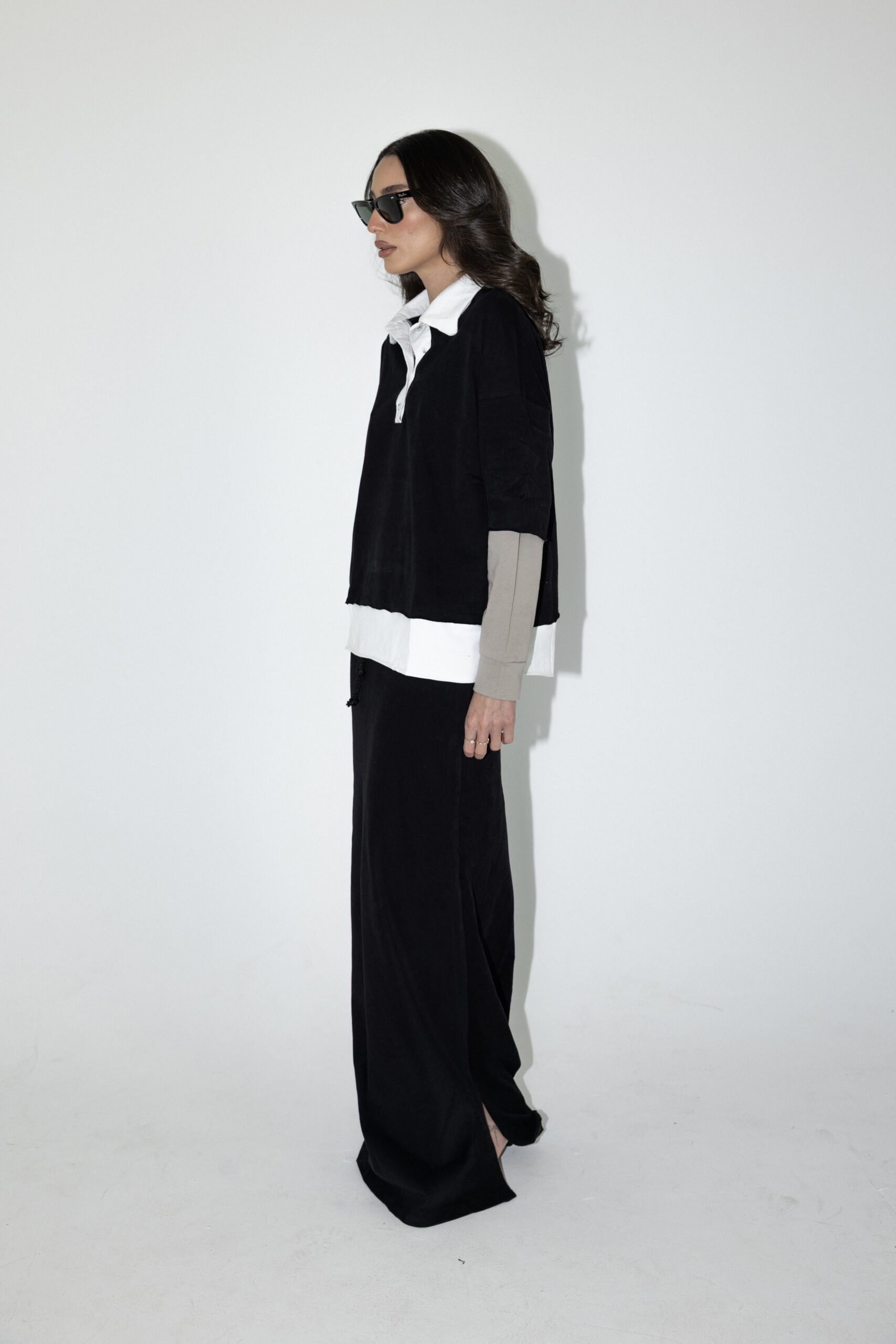 חליפת שני חלקים מבד קליל ונעים, חולצת אובר סייז ארוכה עם צווארון וחצאית מקסי עם גומי למעלה.