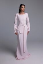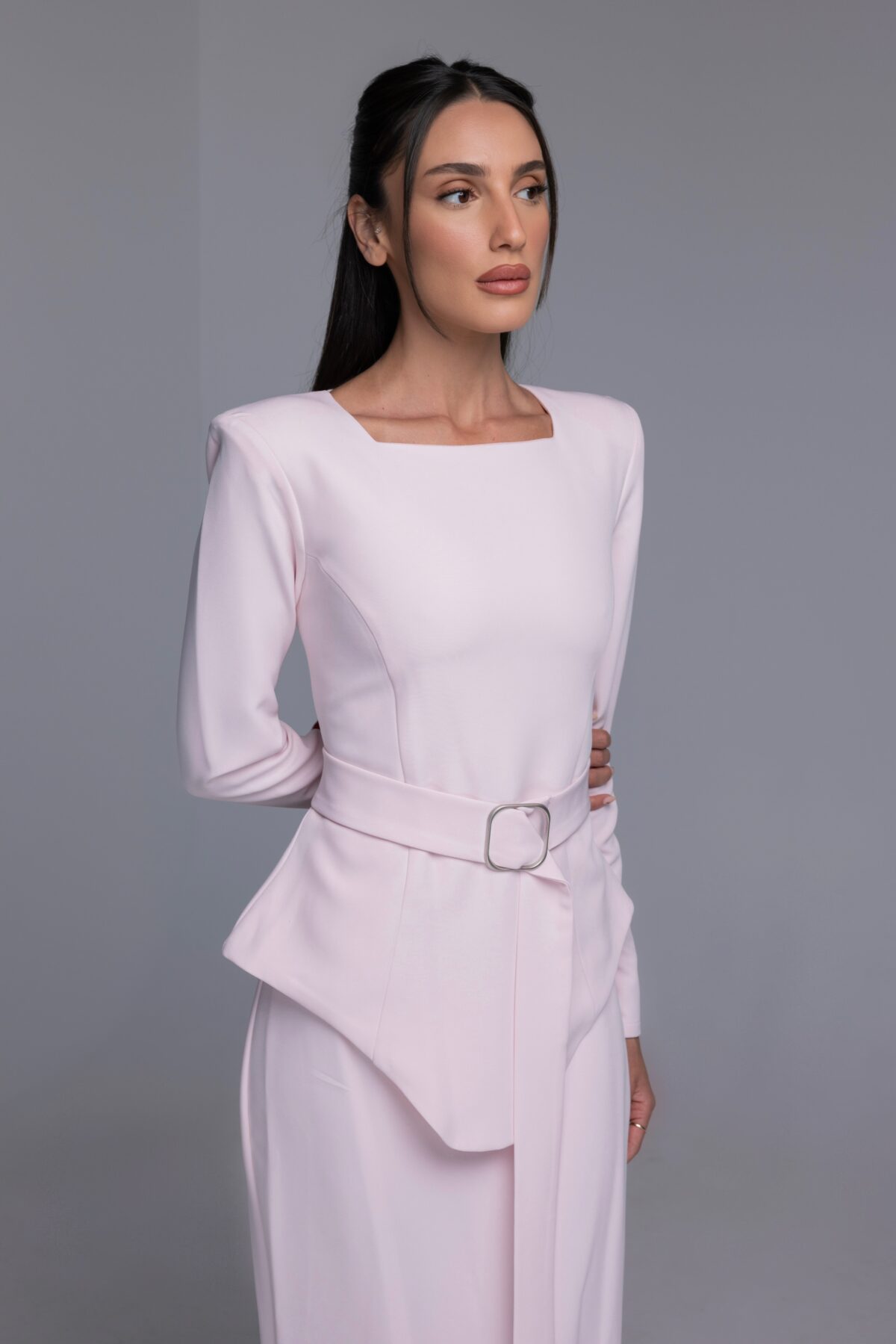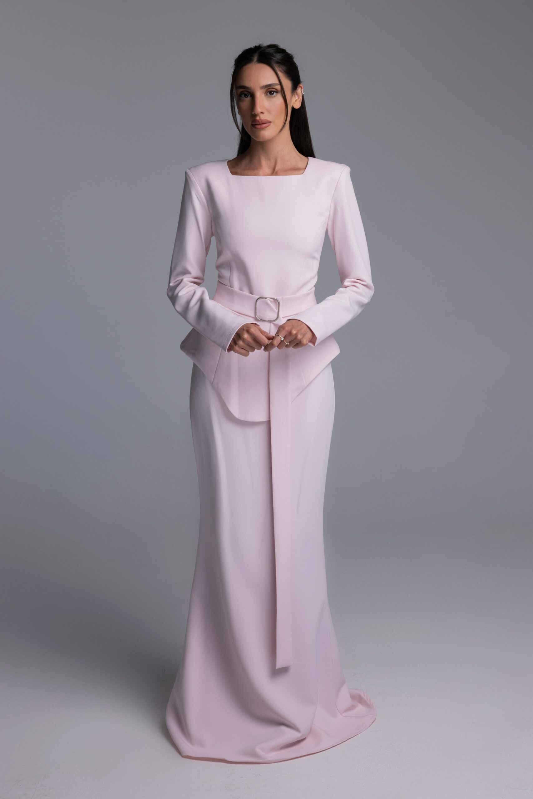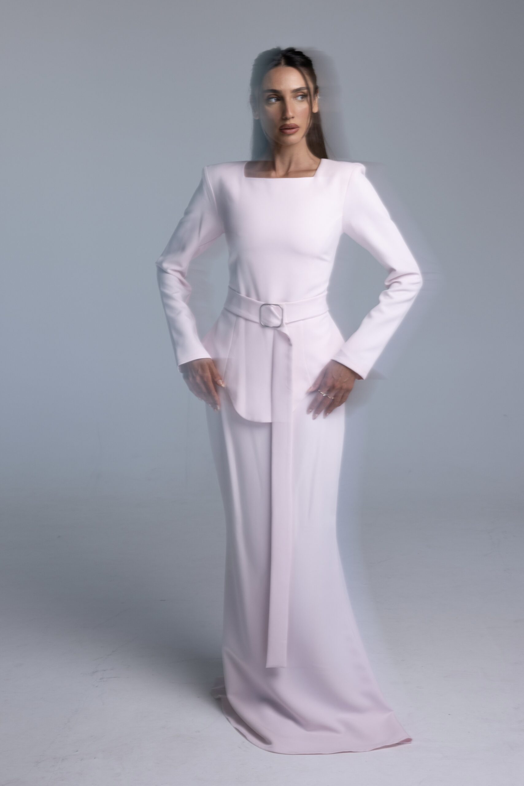 חליפה אלגנטית בשני חלקים, חולצה מחויטת עם מחשוף מרובע, כתפיים מודגשות ועיצוב מחמיא למותן עם חגורת בד תואמת, בשילוב חצאית מקסי נשפכת שיוצרת מראה אלגנטי ונקי. סט קלאסי ורב־עוצמה לערב או אירוע רשמי. מידת הבגד על הדוגמנית 0.