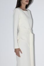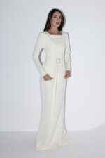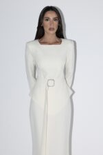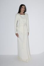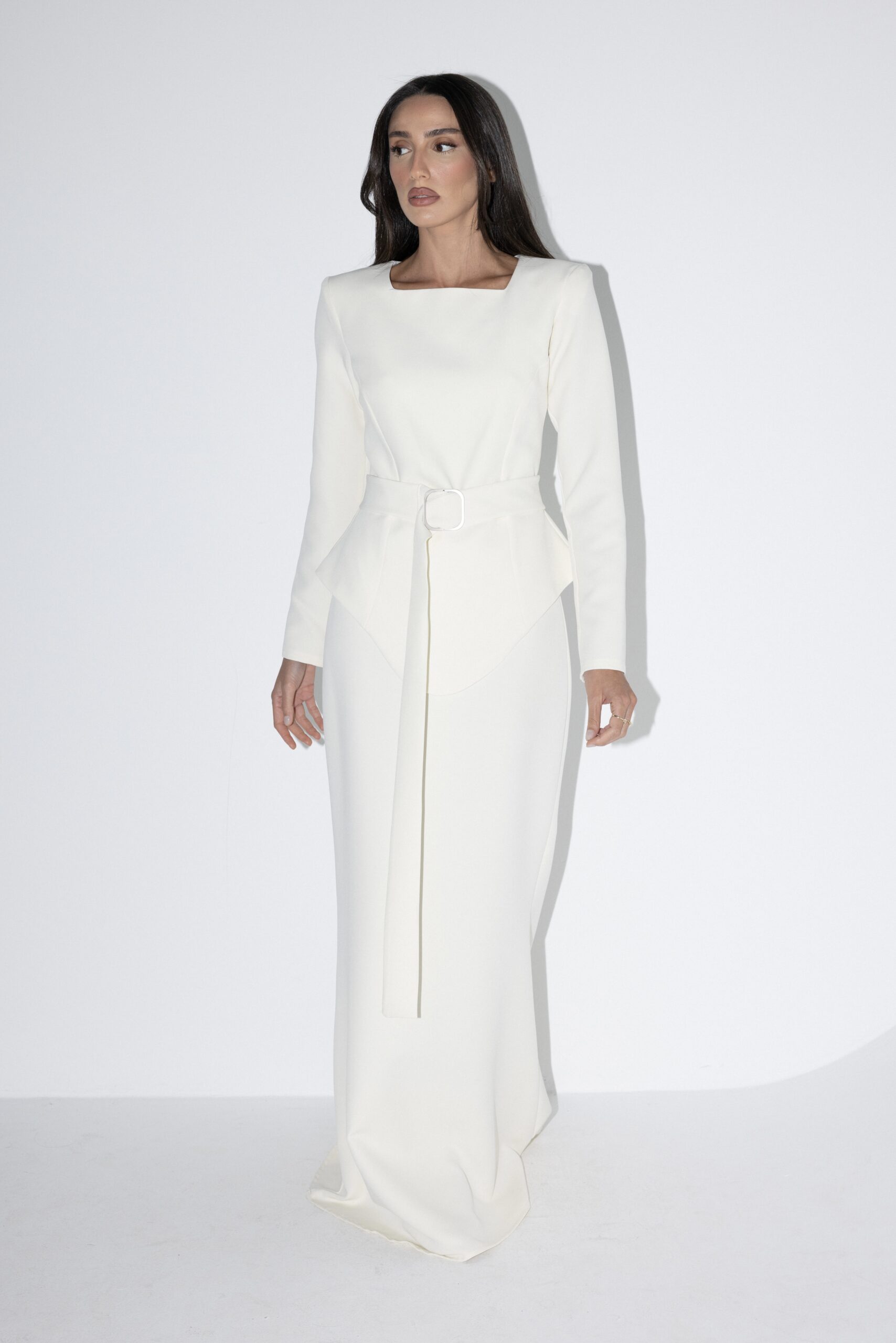חליפה אלגנטית בשני חלקים, חולצה מחויטת עם מחשוף מרובע, כתפיים מודגשות ועיצוב מחמיא למותן עם חגורת בד תואמת, בשילוב חצאית מקסי נשפכת שיוצרת מראה אלגנטי ונקי. סט קלאסי ורב־עוצמה לערב או אירוע רשמי. מידת הבגד על הדוגמנית 0.