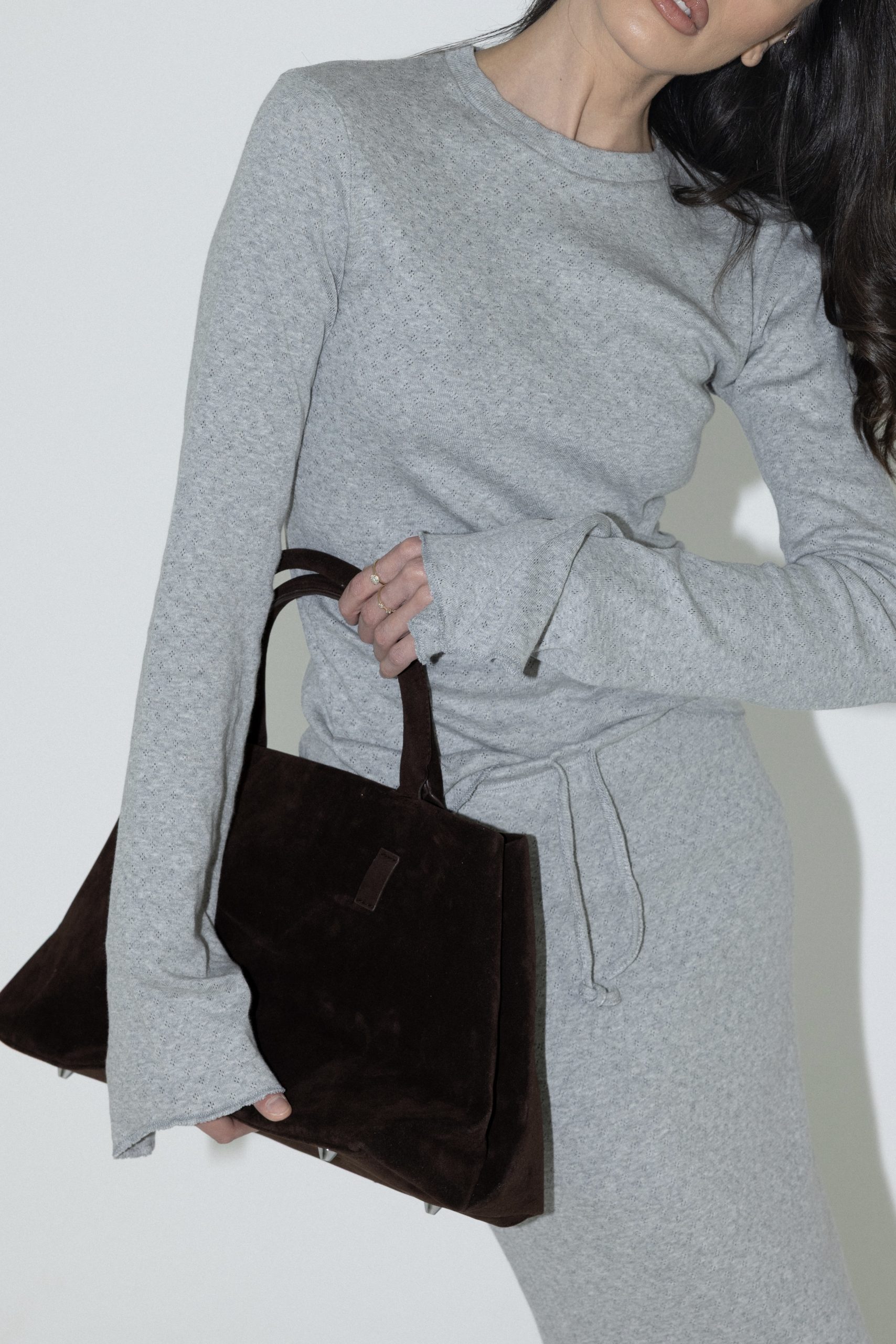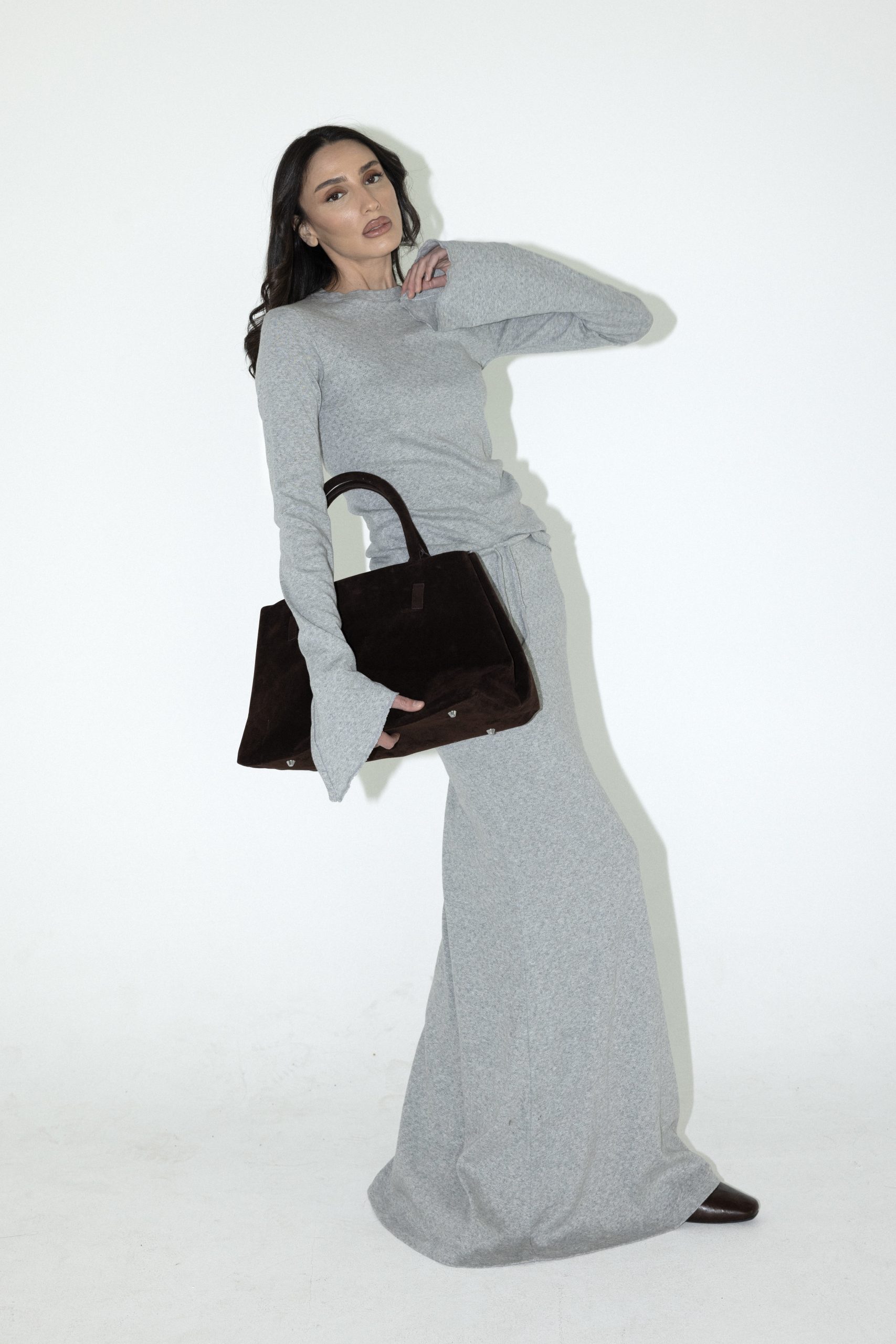 חליפת שני חלקים מבד פוינטל, חולצה בגזרה צמודה עם שרוולים ארוכים מתרחבים וחצאית מקסי עם בטנה תפורה וגומי למעלה.