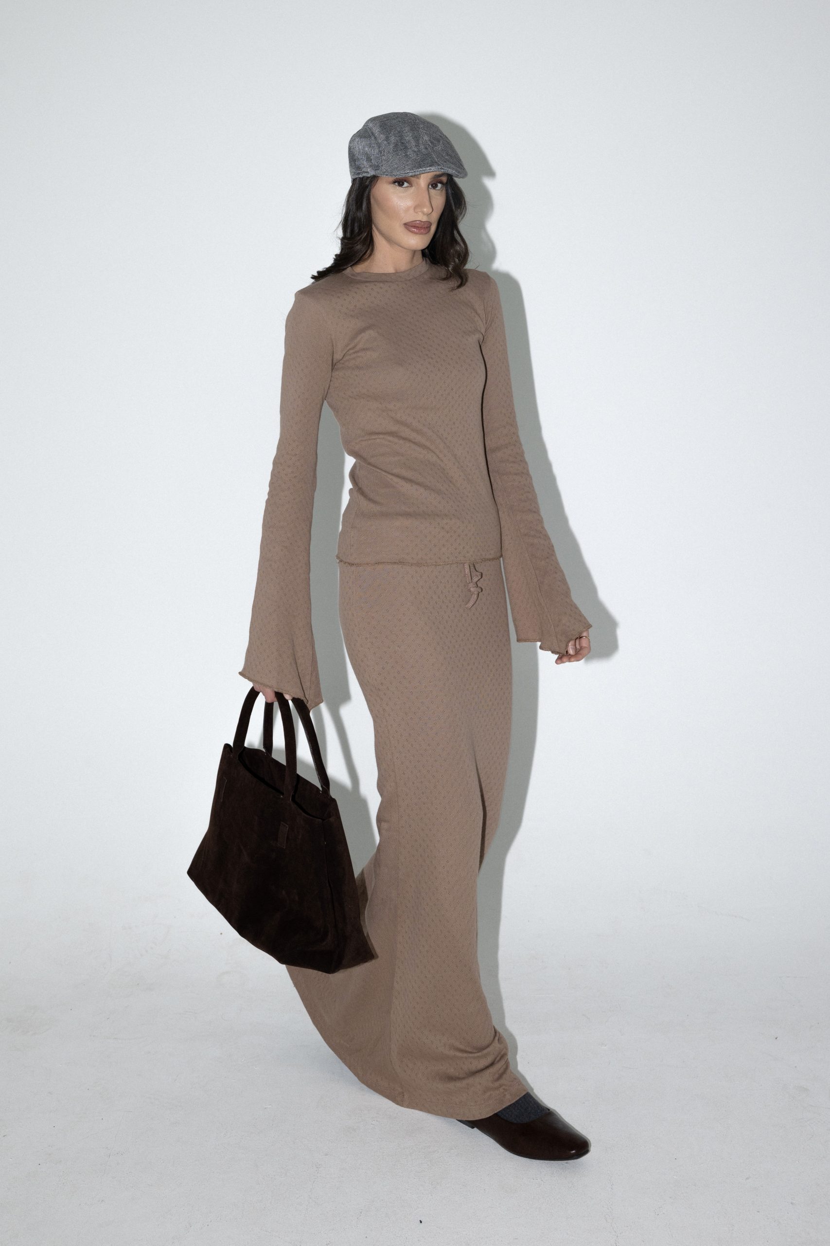 חליפת שני חלקים מבד פוינטל, חולצה בגזרה צמודה עם שרוולים ארוכים מתרחבים וחצאית מקסי עם בטנה תפורה וגומי למעלה.