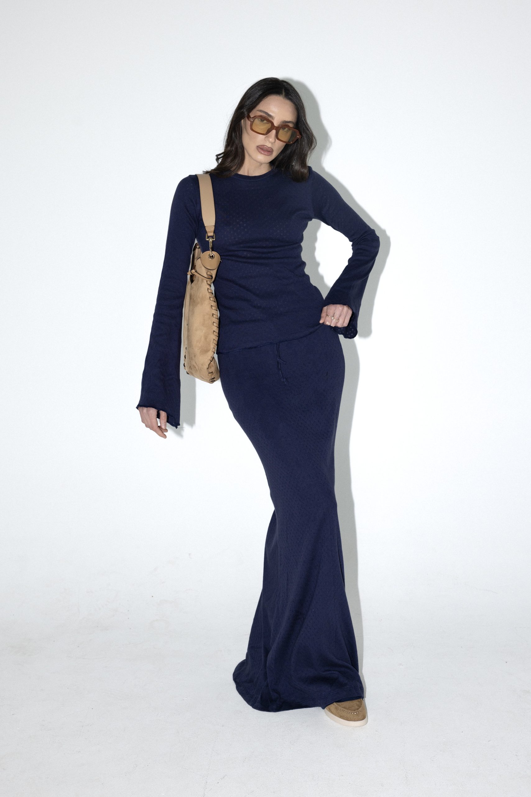 חליפת שני חלקים מבד פוינטל, חולצה בגזרה צמודה עם שרוולים ארוכים מתרחבים וחצאית מקסי עם בטנה תפורה וגומי למעלה.