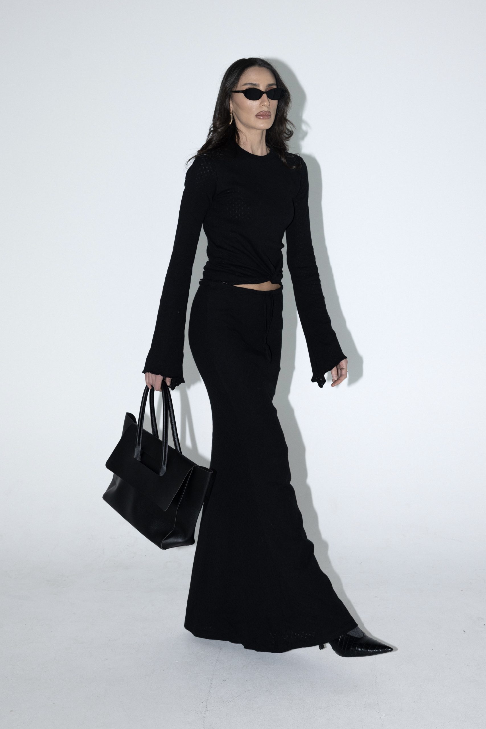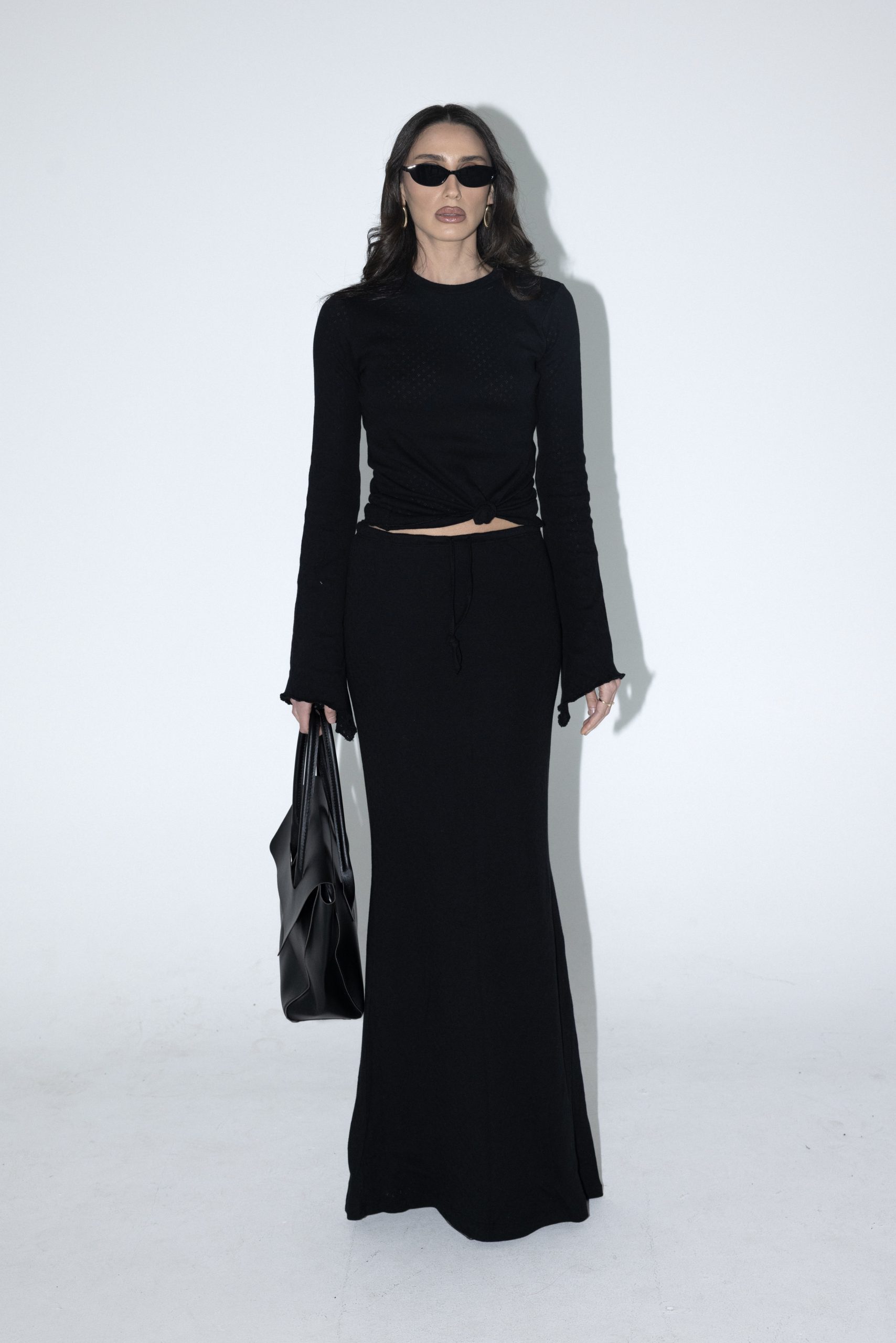 חליפת שני חלקים מבד פוינטל, חולצה בגזרה צמודה עם שרוולים ארוכים מתרחבים וחצאית מקסי עם בטנה תפורה וגומי למעלה.
