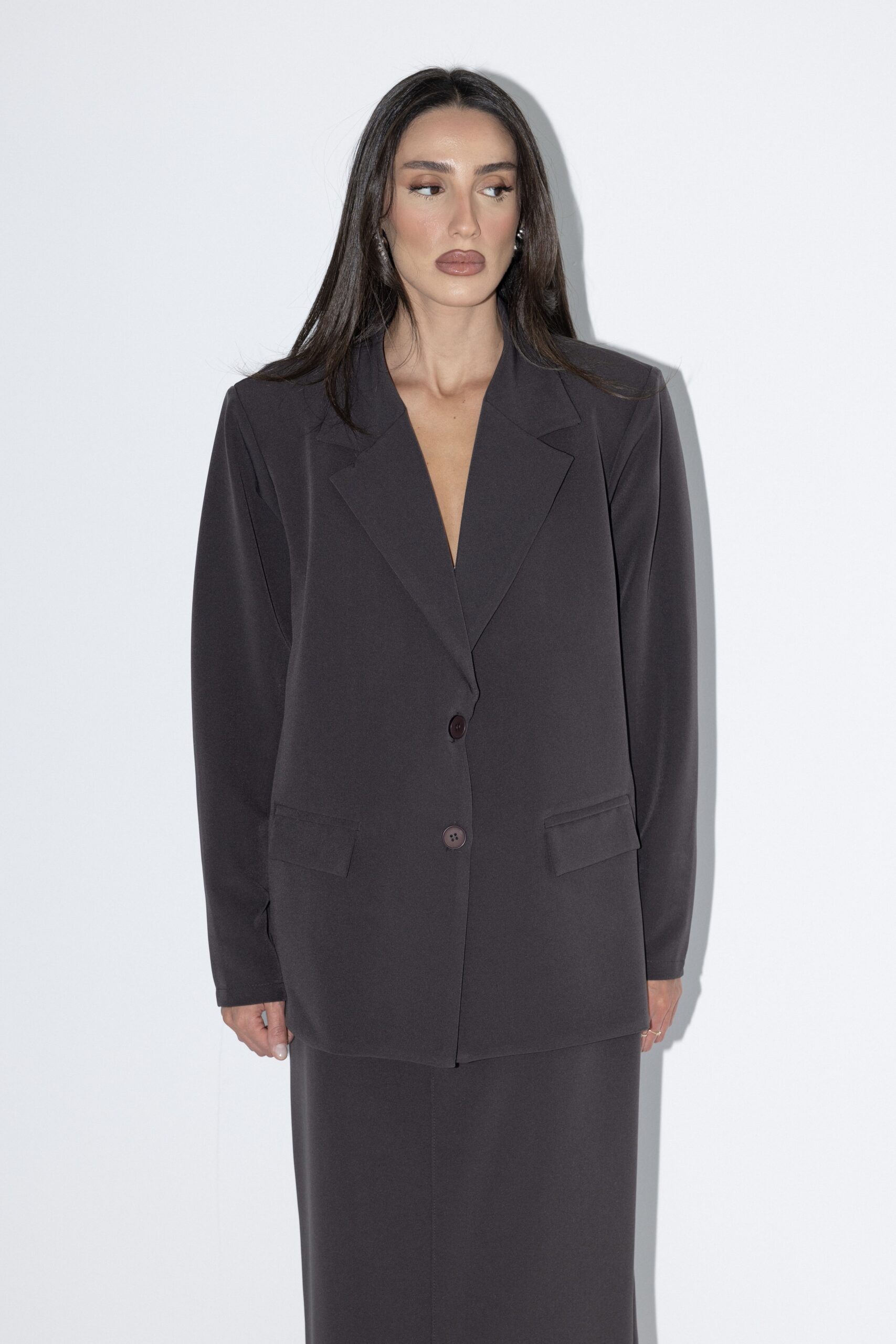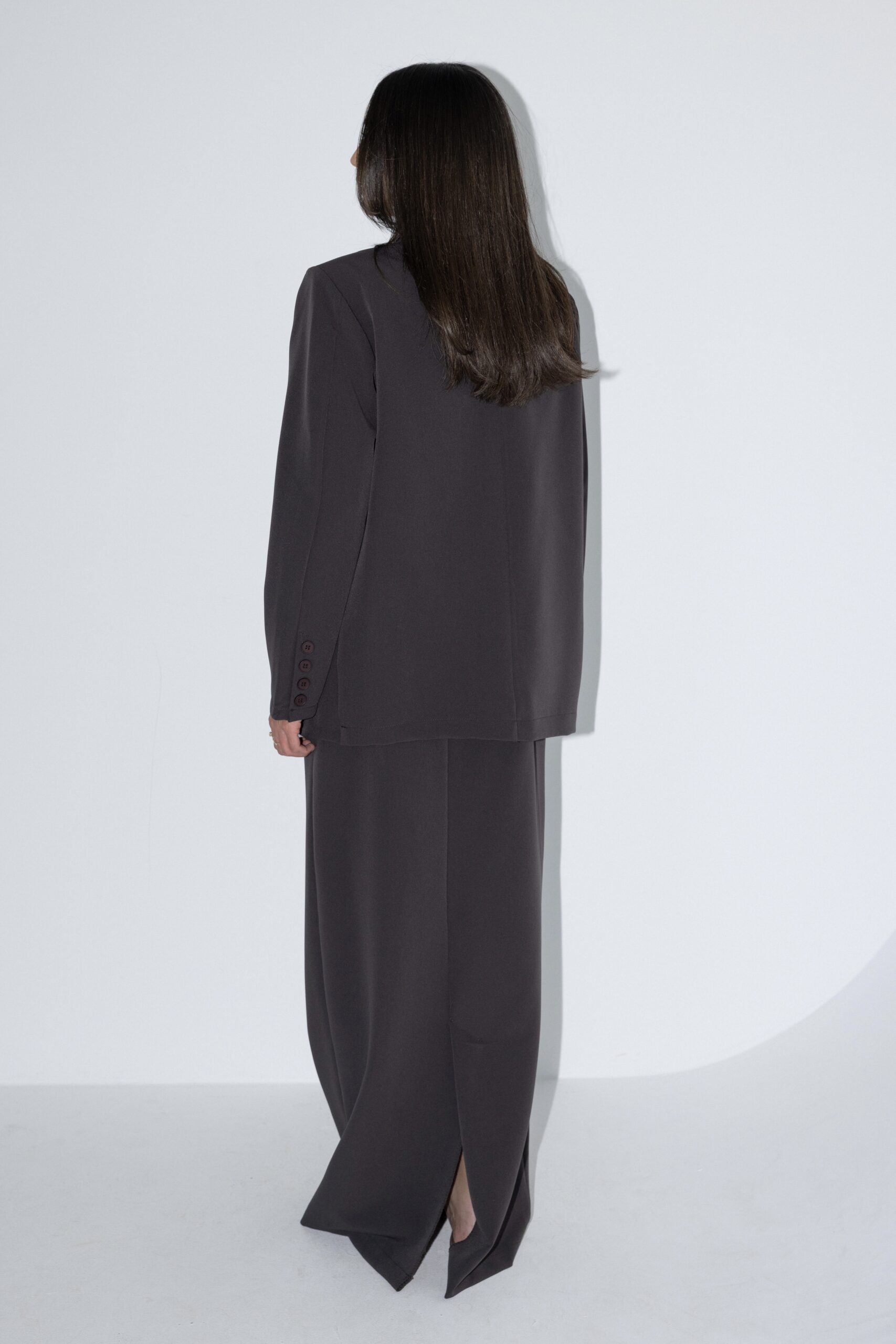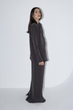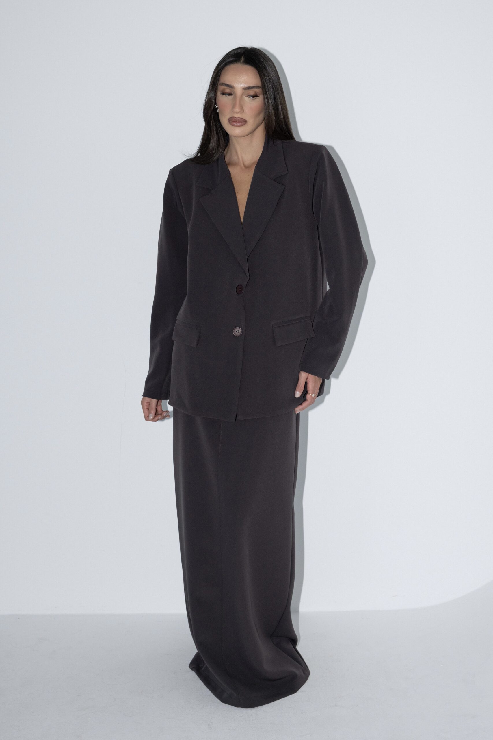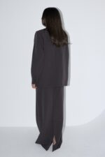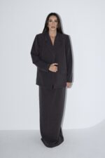 חליפה אלגנטית, המורכבת מז’קט מחויט בעל כתפיים מודגשות וכיסים קדמיים, בשילוב חצאית מקסי בגזרה ישרה ונקייה ושסע אחורי.