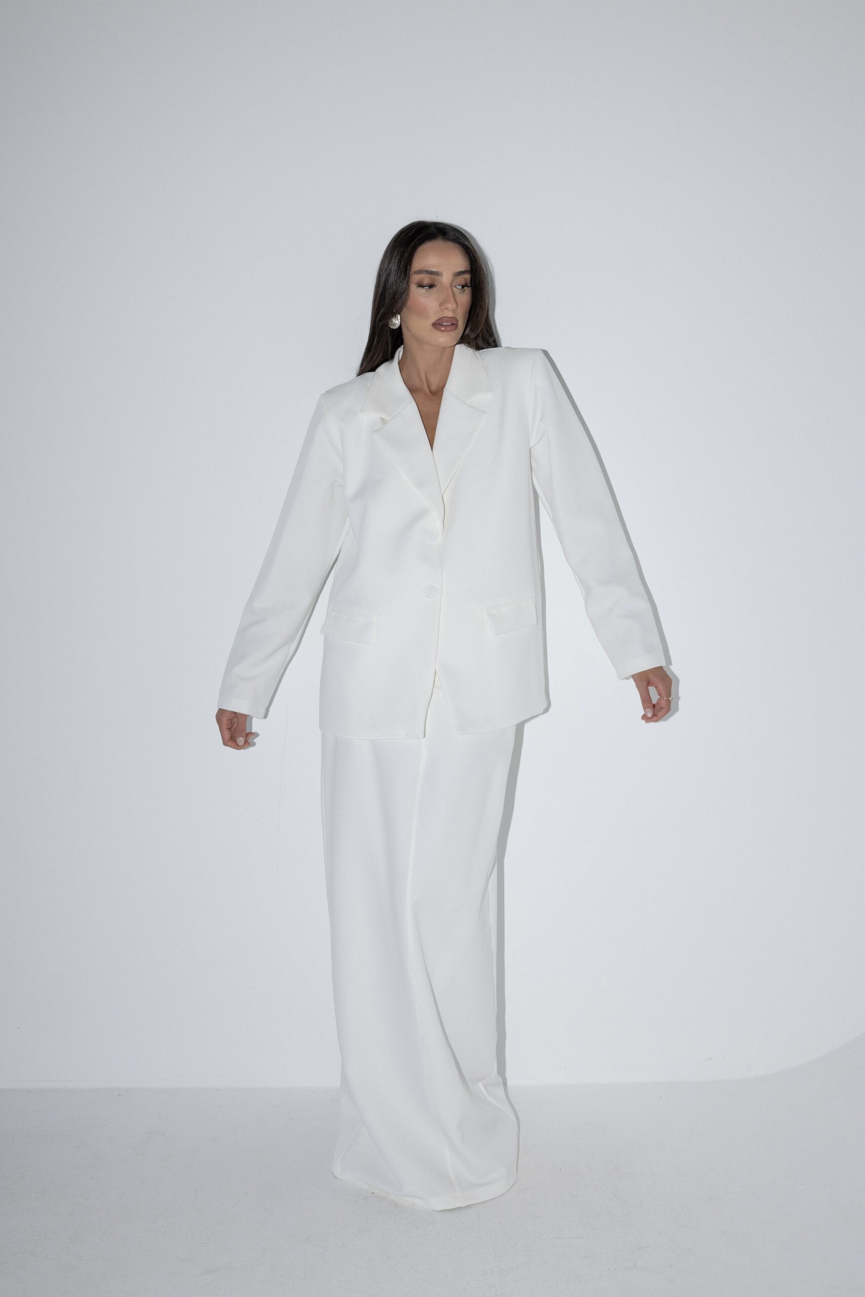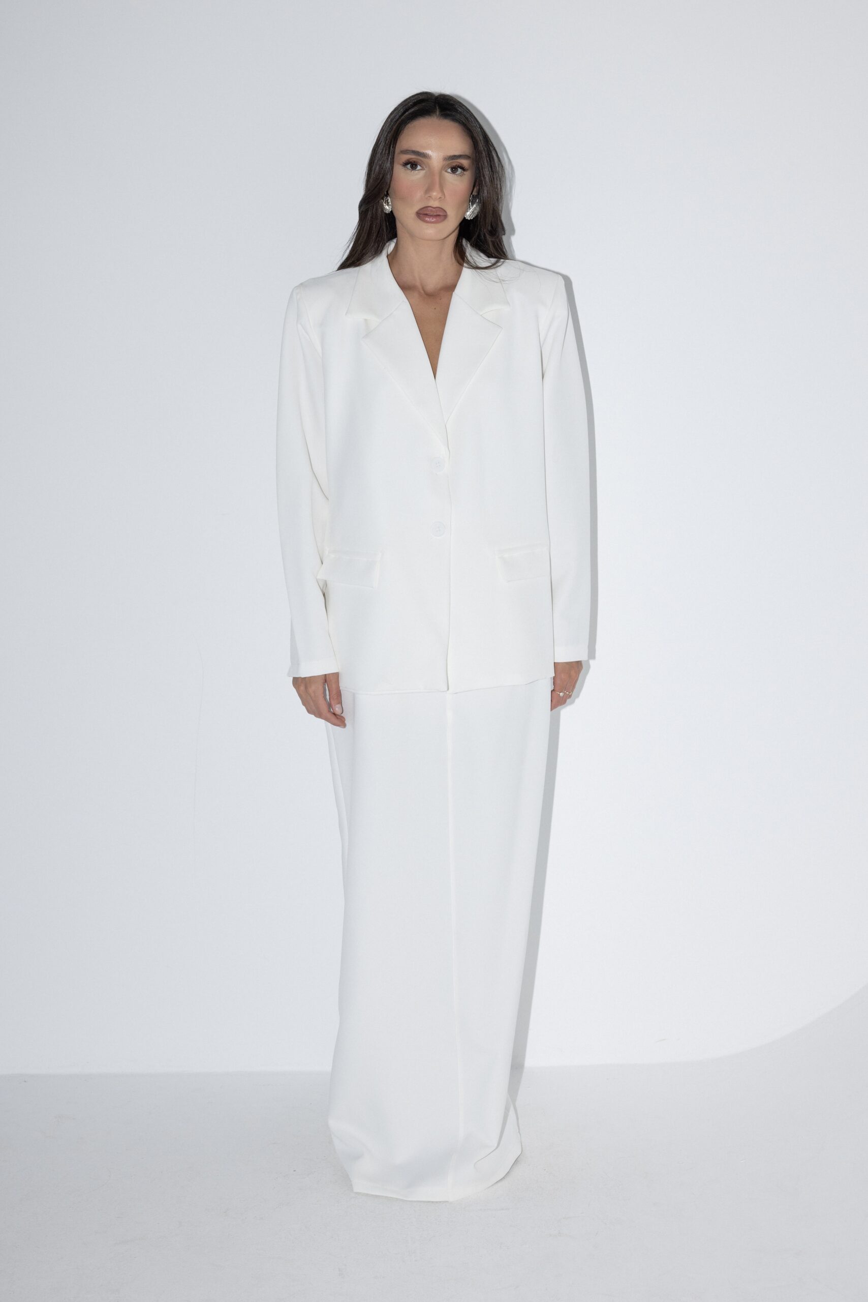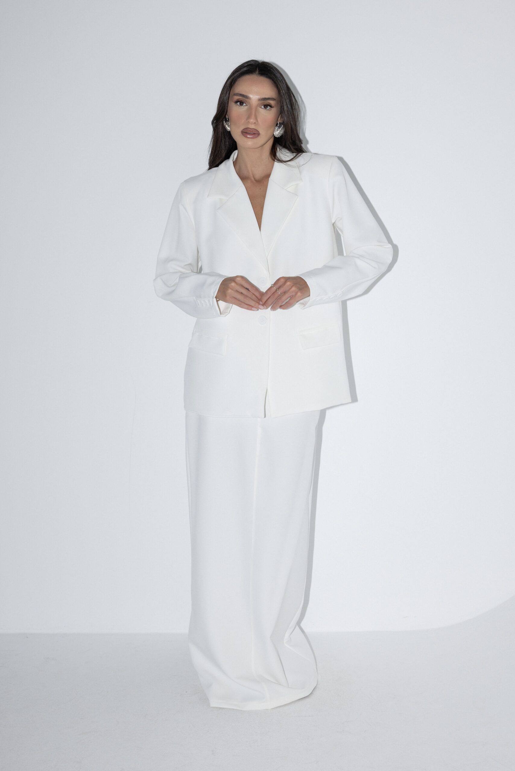 חליפה אלגנטית, המורכבת מז’קט מחויט בעל כתפיים מודגשות וכיסים קדמיים, בשילוב חצאית מקסי בגזרה ישרה ונקייה ושסע אחורי.