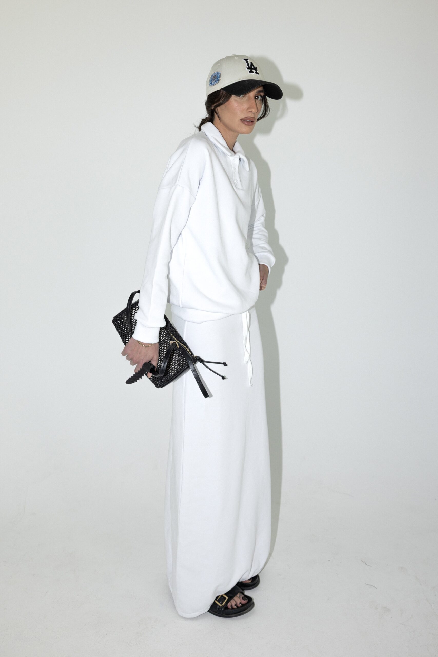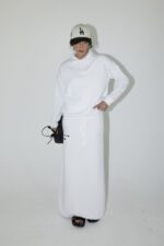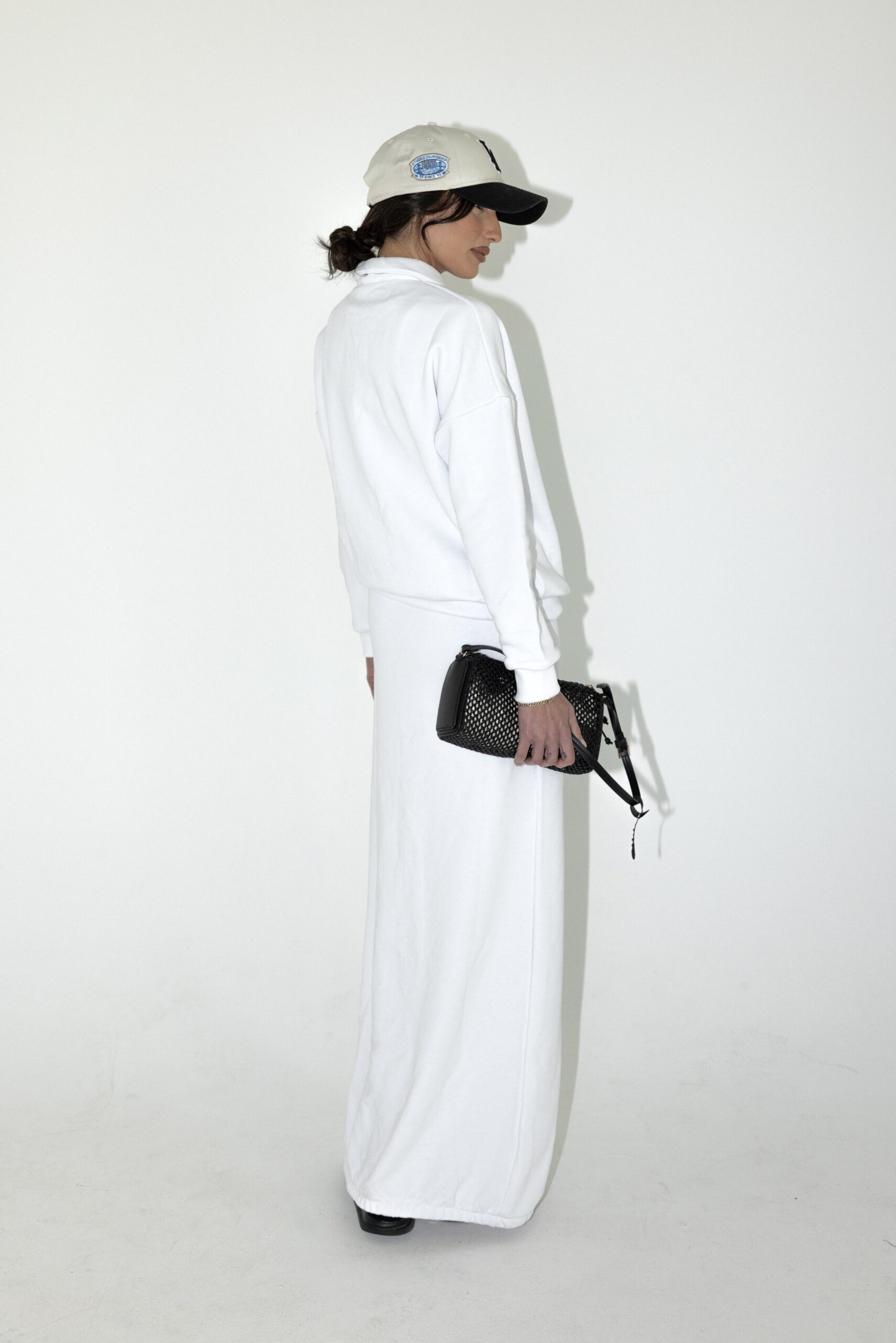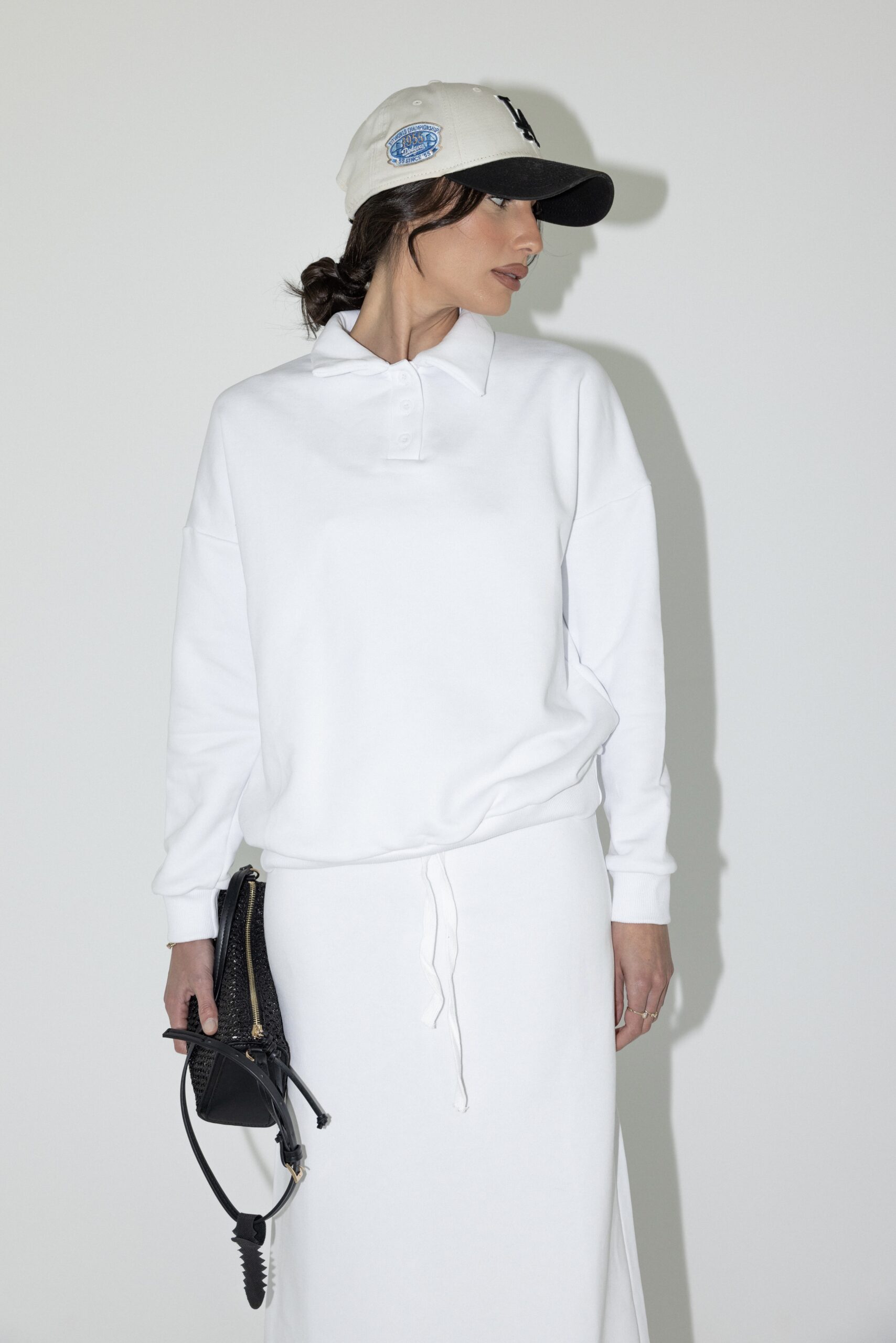 חליפת שני חלקים מבד נעים ורך, חולצה בגזרה אובר סייז עם צווארון ושרוולים ארוכים וחצאית עם גומי למעלה ולמטה.