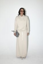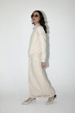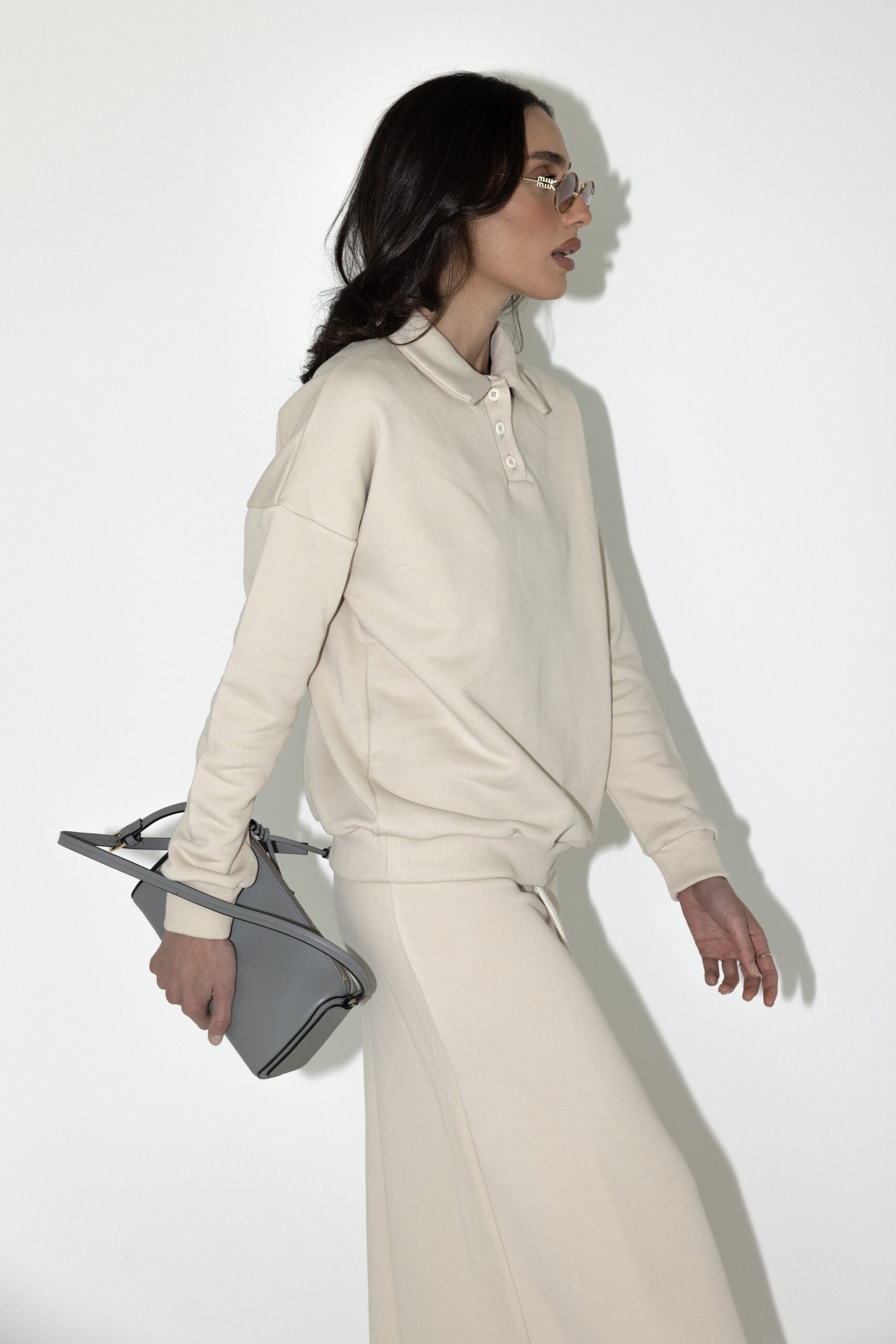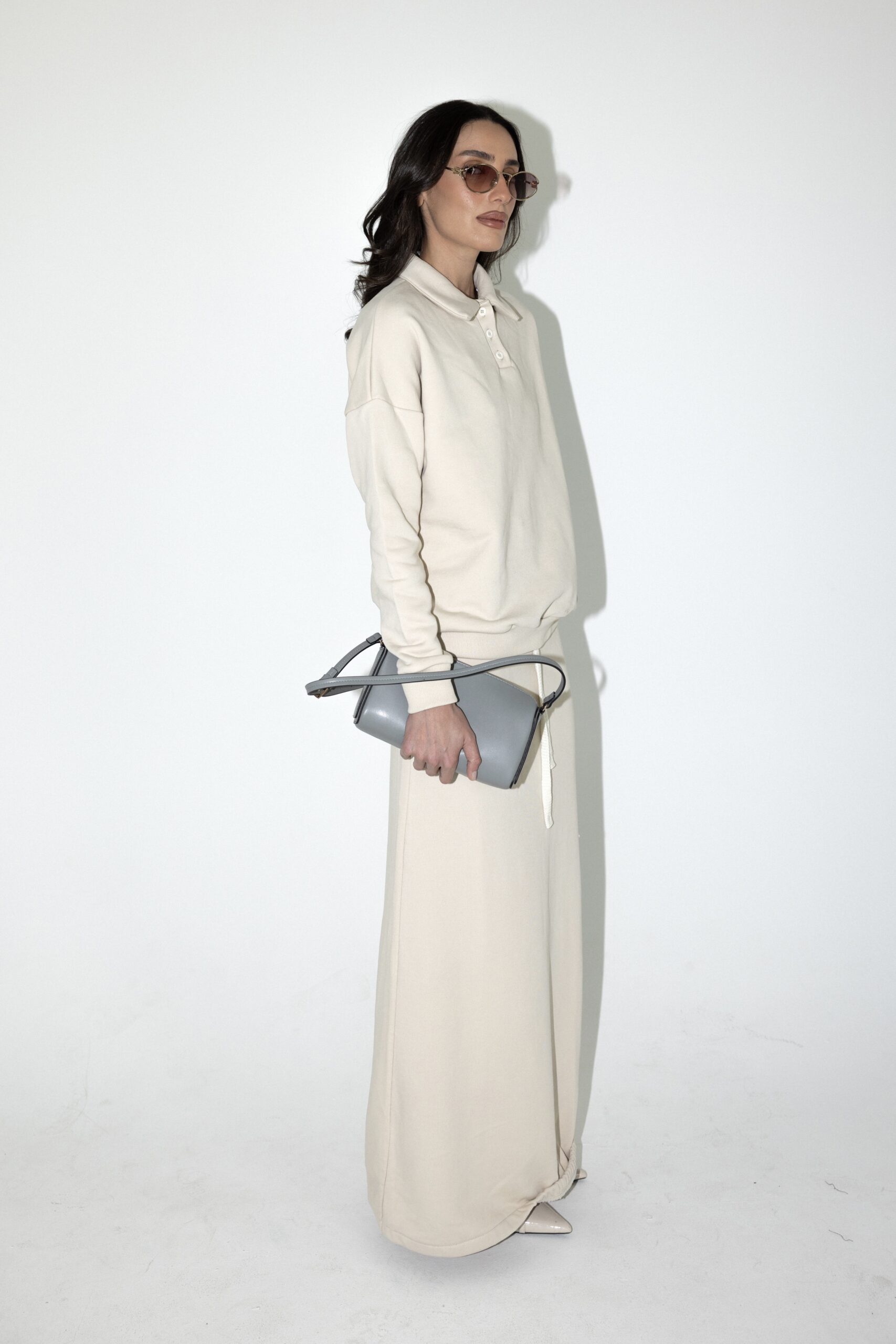 חליפת שני חלקים מבד נעים ורך, חולצה בגזרה אובר סייז עם צווארון ושרוולים ארוכים וחצאית עם גומי למעלה ולמטה.