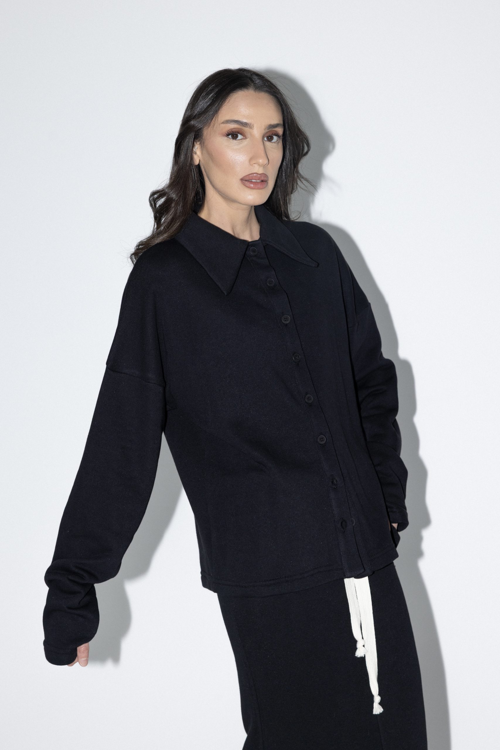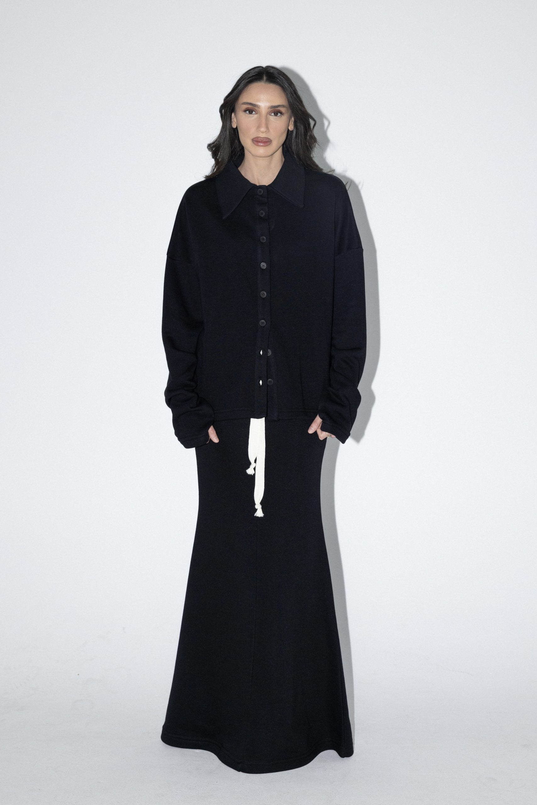 חליפת שני חלקים, חולצה מכופתרת עם צווארון שפיץ וחצאית מקסי עם גומי למעלה.