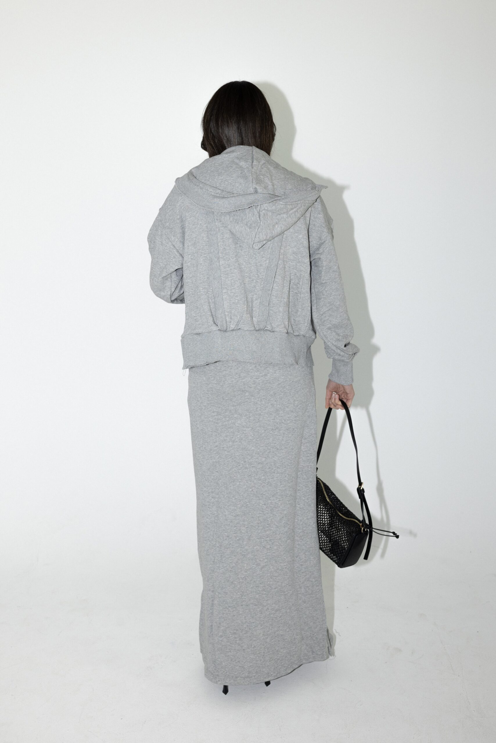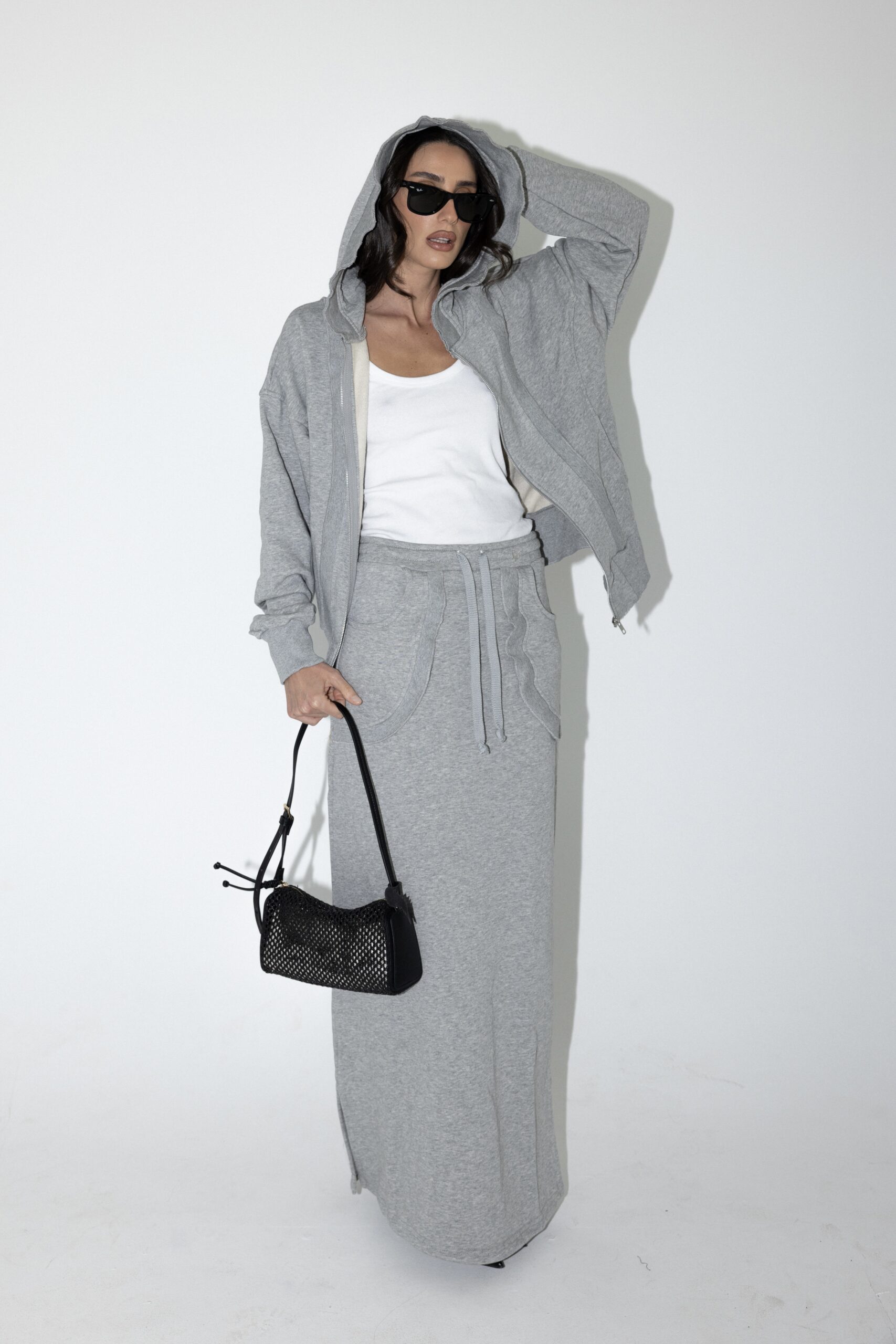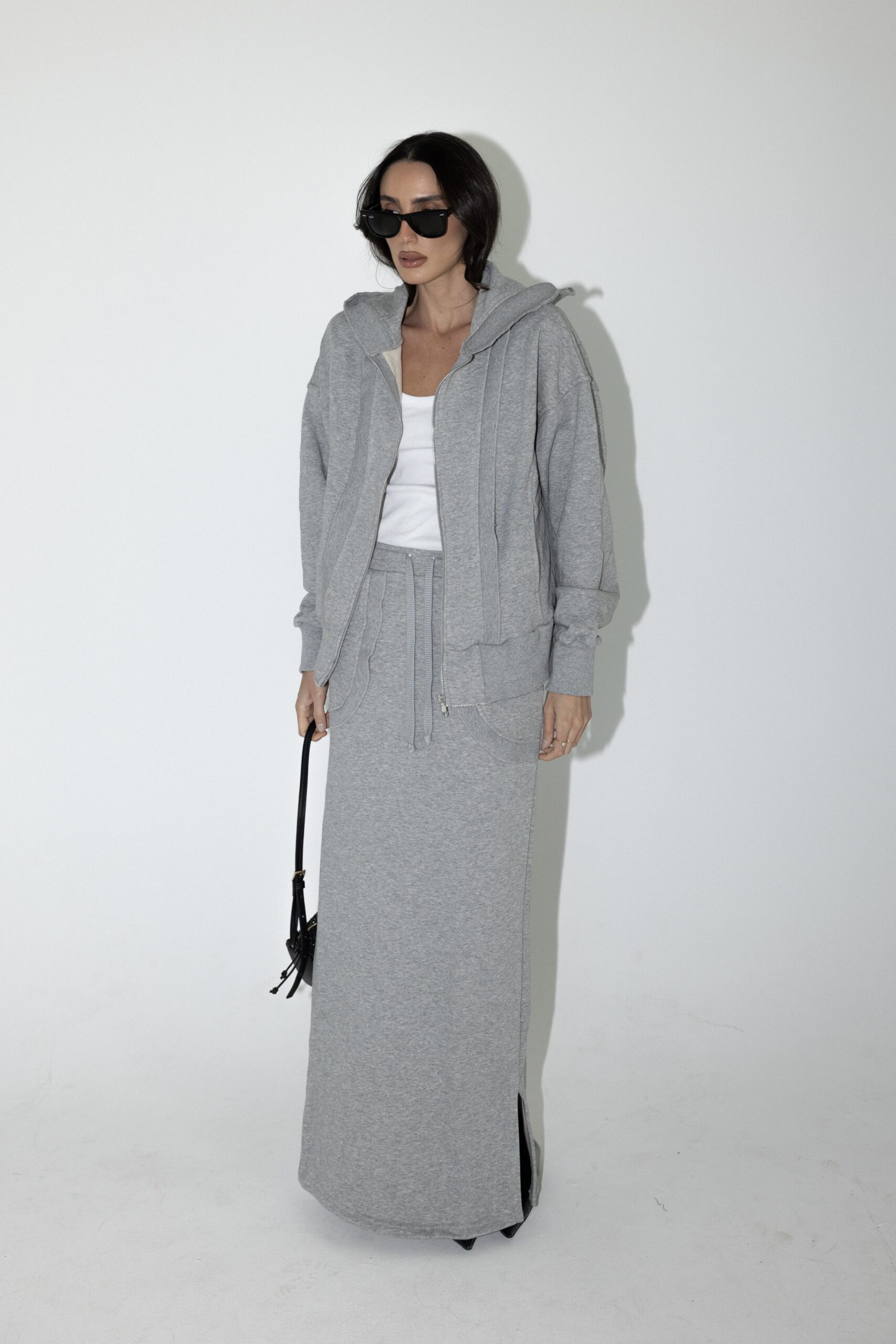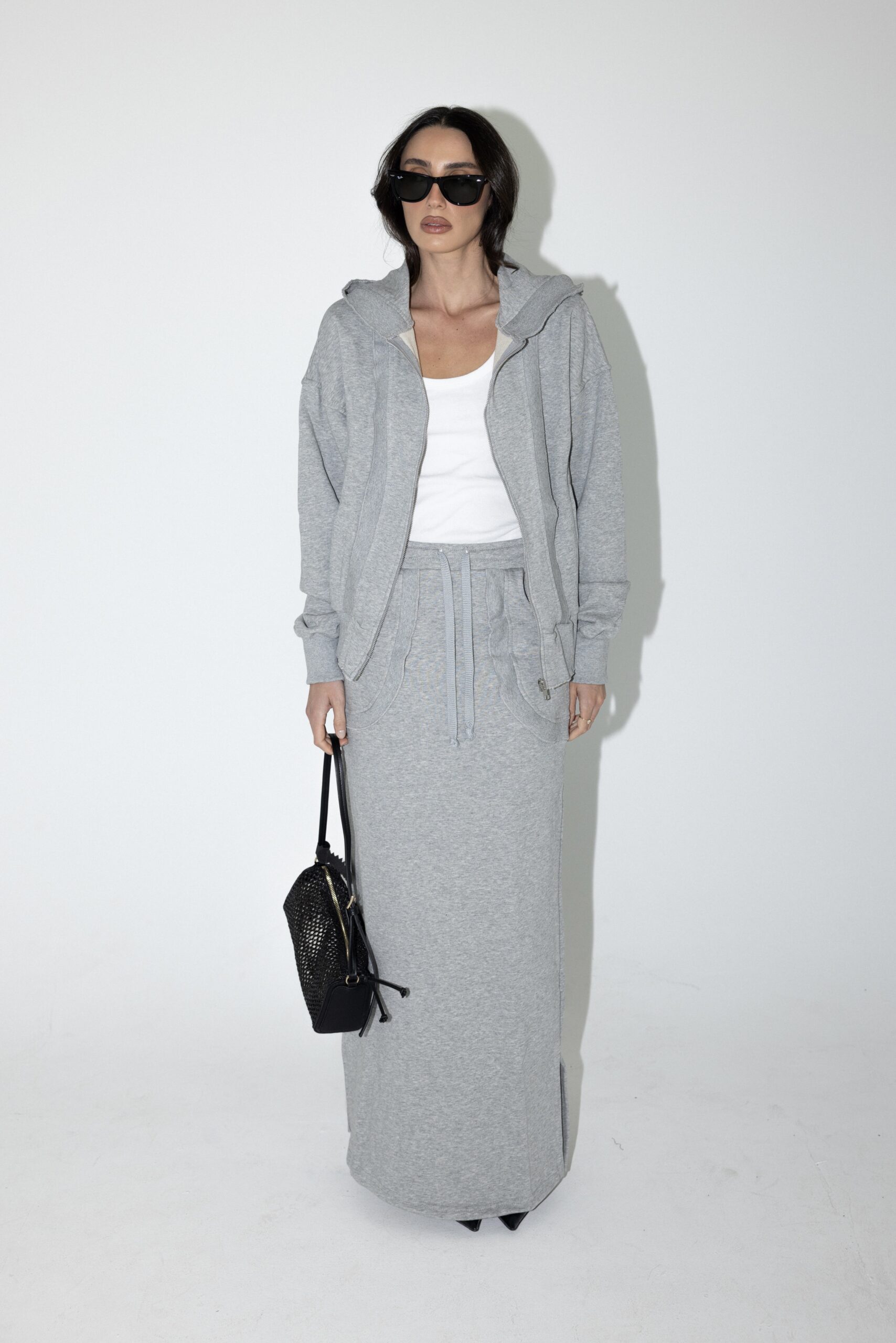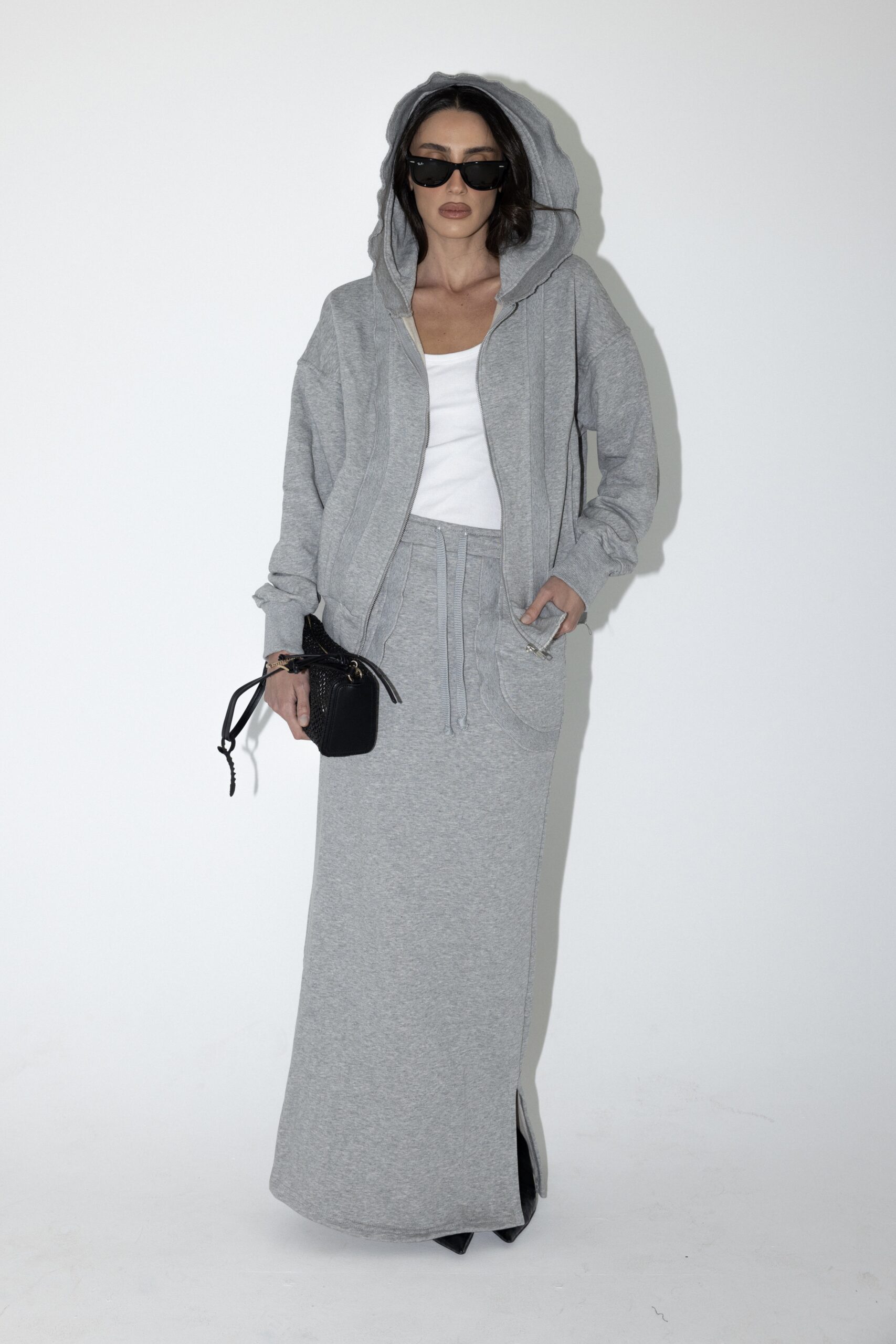 חליפת שני חלקים טרנינג, ג׳קט קפוצ׳ון בגזרת אובר סייז עם שרוולים ארוכים וחצאית מקסי עם גומי למעלה וכיסים מידיים.