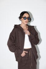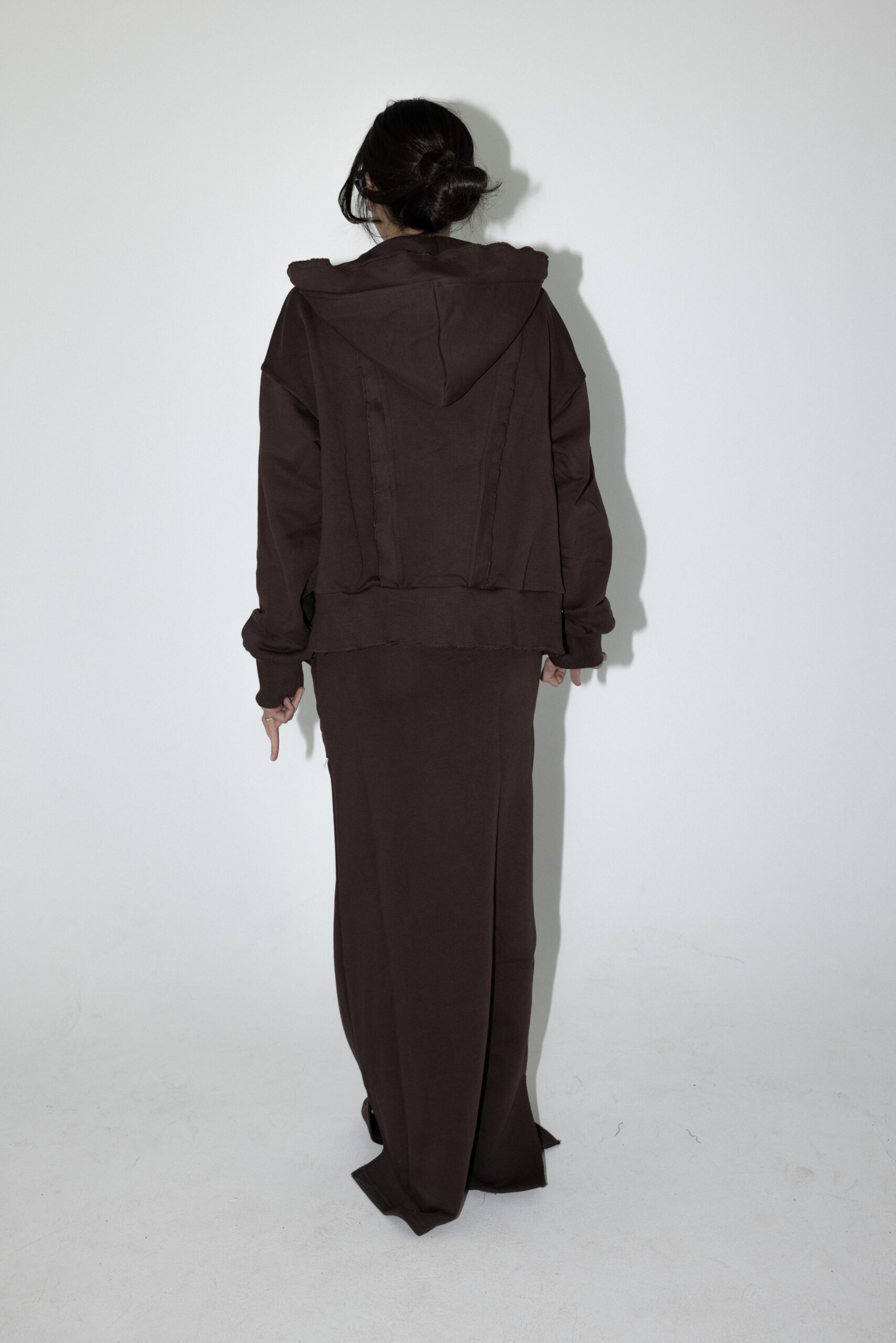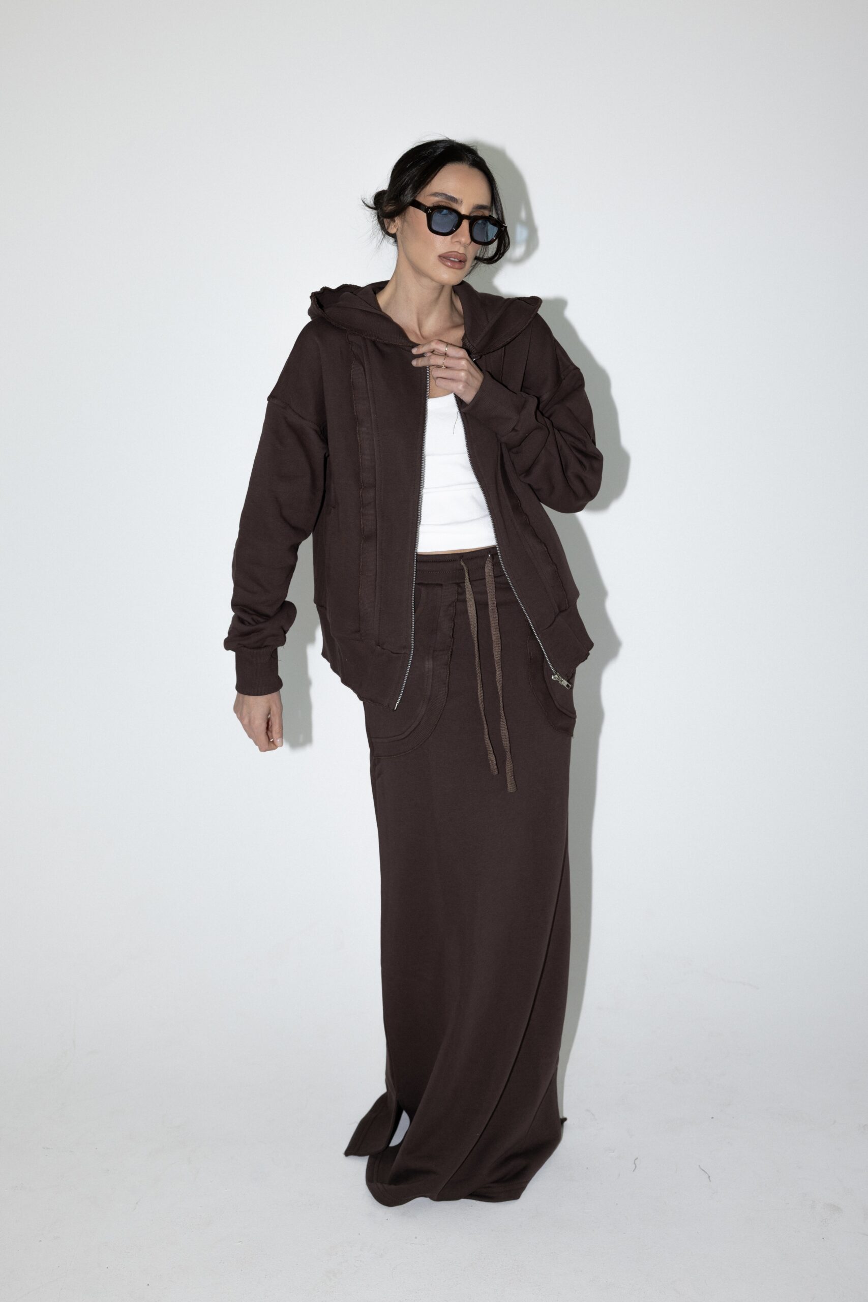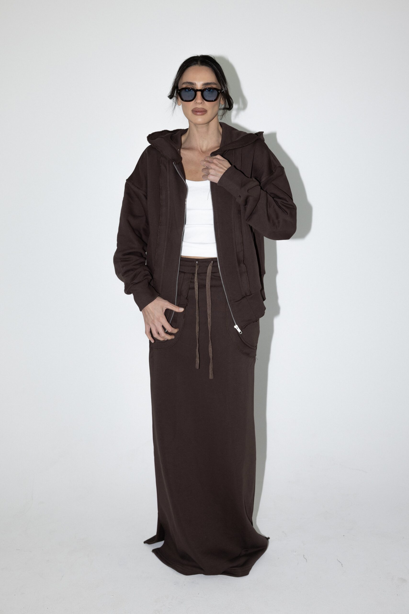 חליפת שני חלקים טרנינג, ג׳קט קפוצ׳ון בגזרת אובר סייז עם שרוולים ארוכים וחצאית מקסי עם גומי למעלה וכיסים מידיים.
