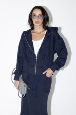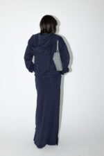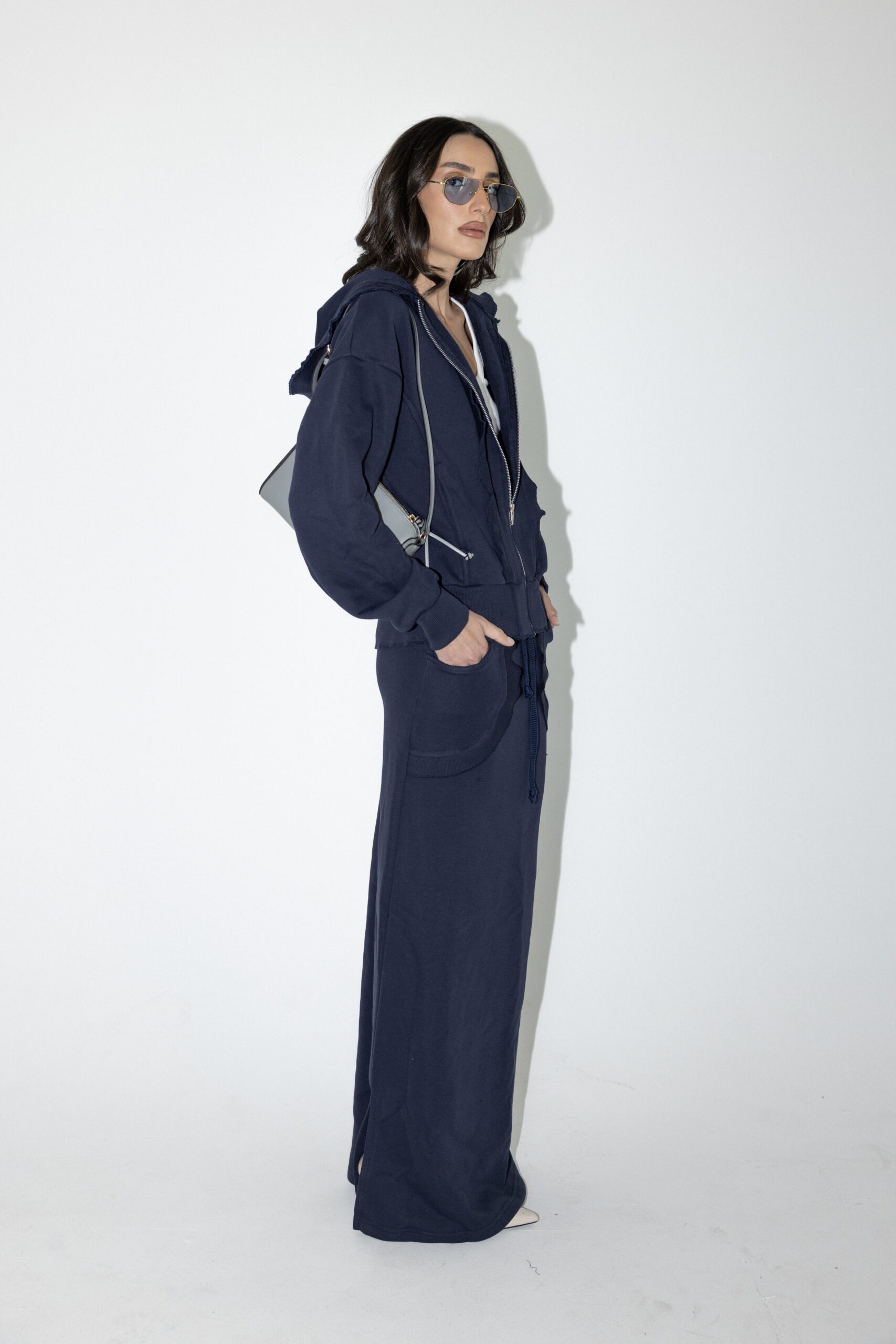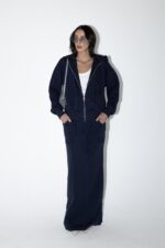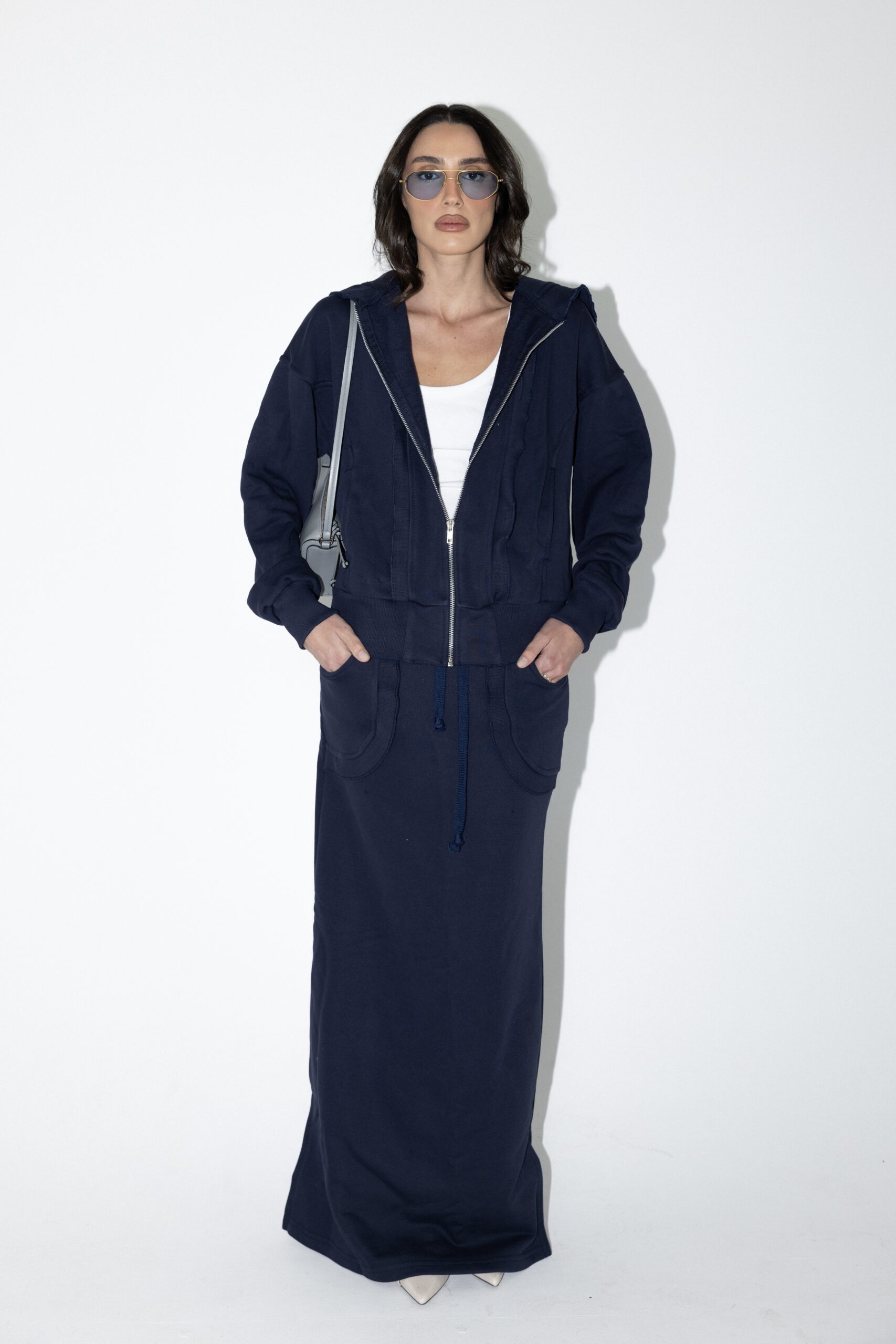 חליפת שני חלקים טרנינג, ג׳קט קפוצ׳ון בגזרת אובר סייז עם שרוולים ארוכים וחצאית מקסי עם גומי למעלה וכיסים מידיים.