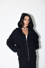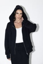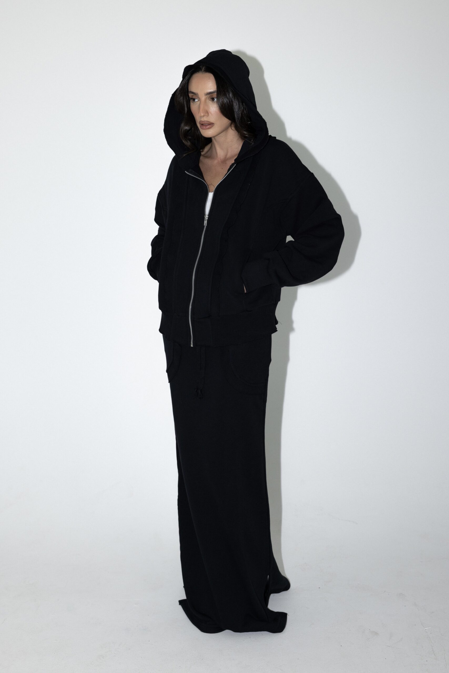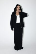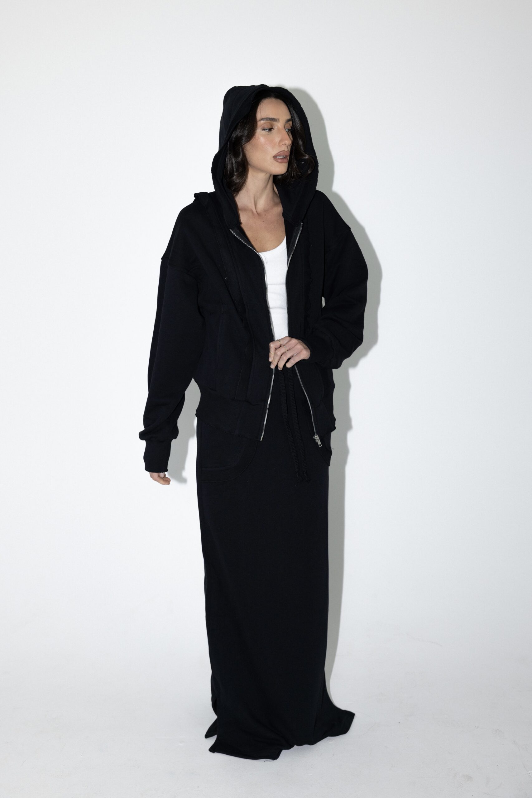 חליפת שני חלקים טרנינג, ג׳קט קפוצ׳ון בגזרת אובר סייז עם שרוולים ארוכים וחצאית מקסי עם גומי למעלה וכיסים מידיים.