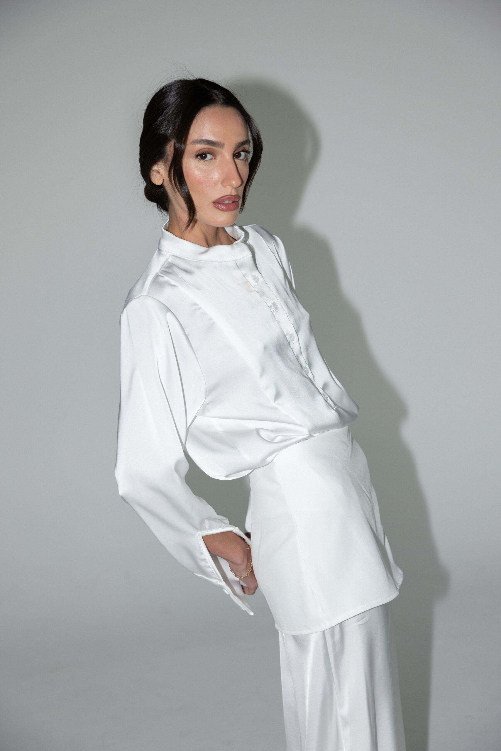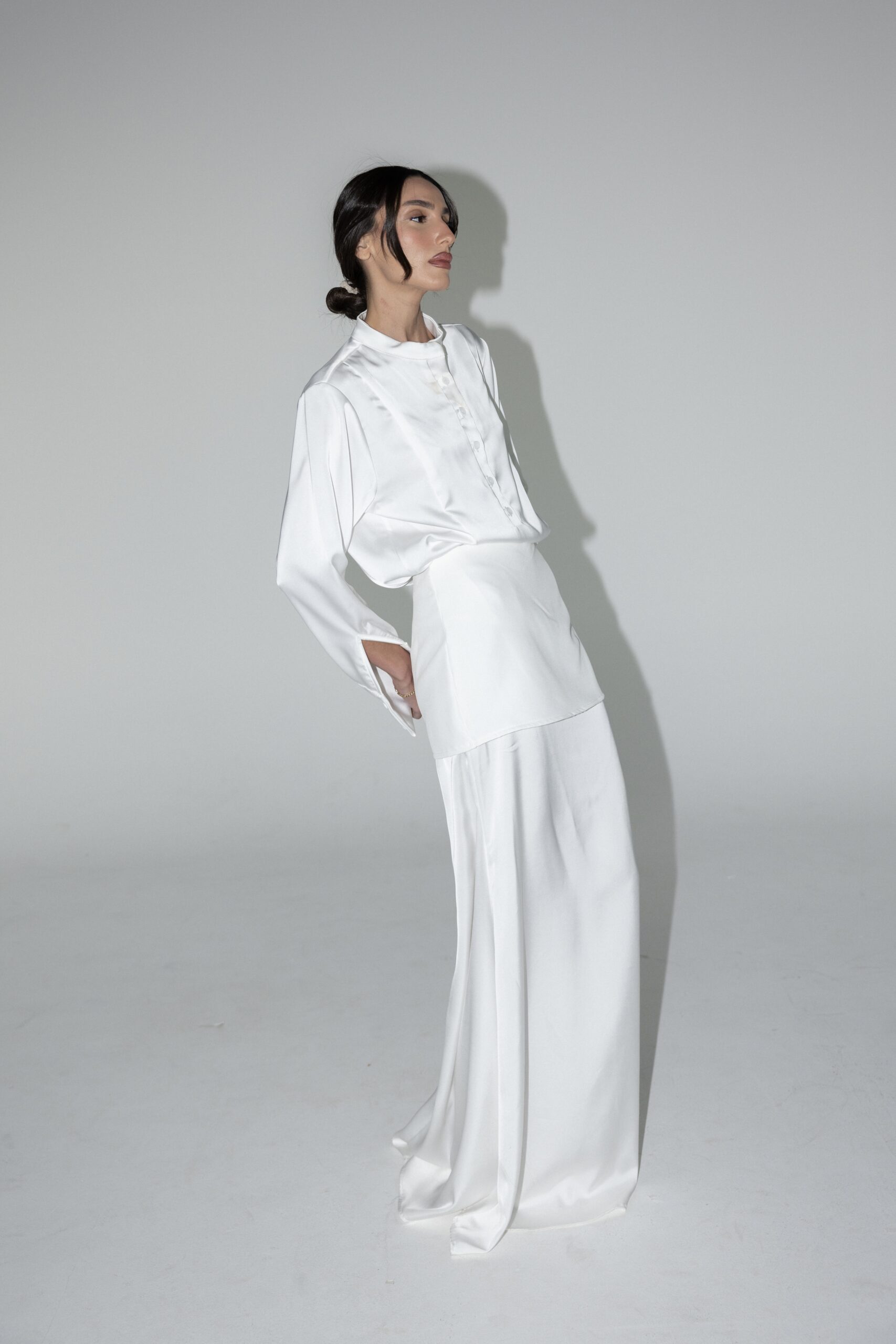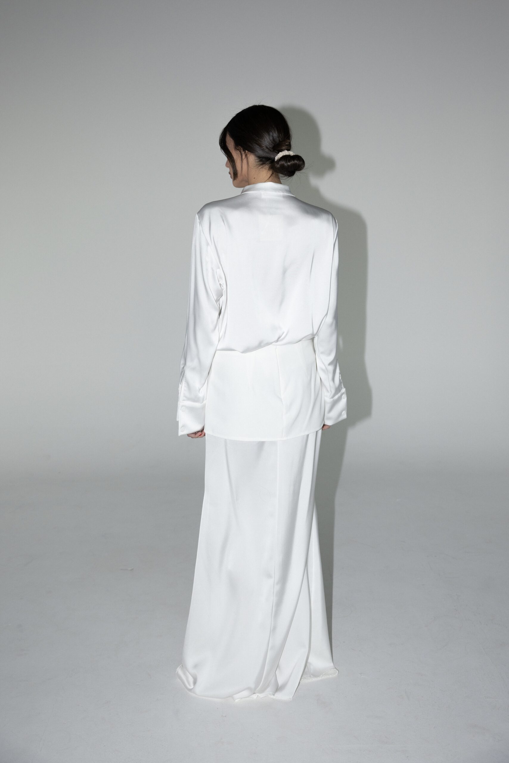 חליפת שני חלקים מבד סאטן, חולצה מכופתרת עם צווארון סיני וחצאית מקסי עם שכבת בד מחוברת לחצאית.