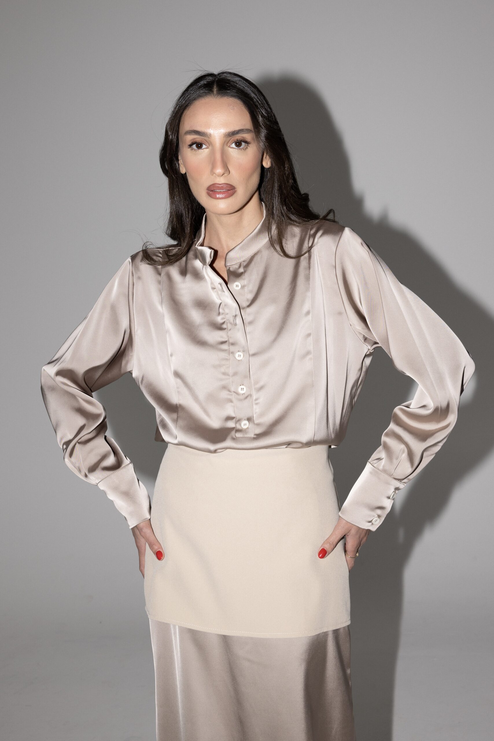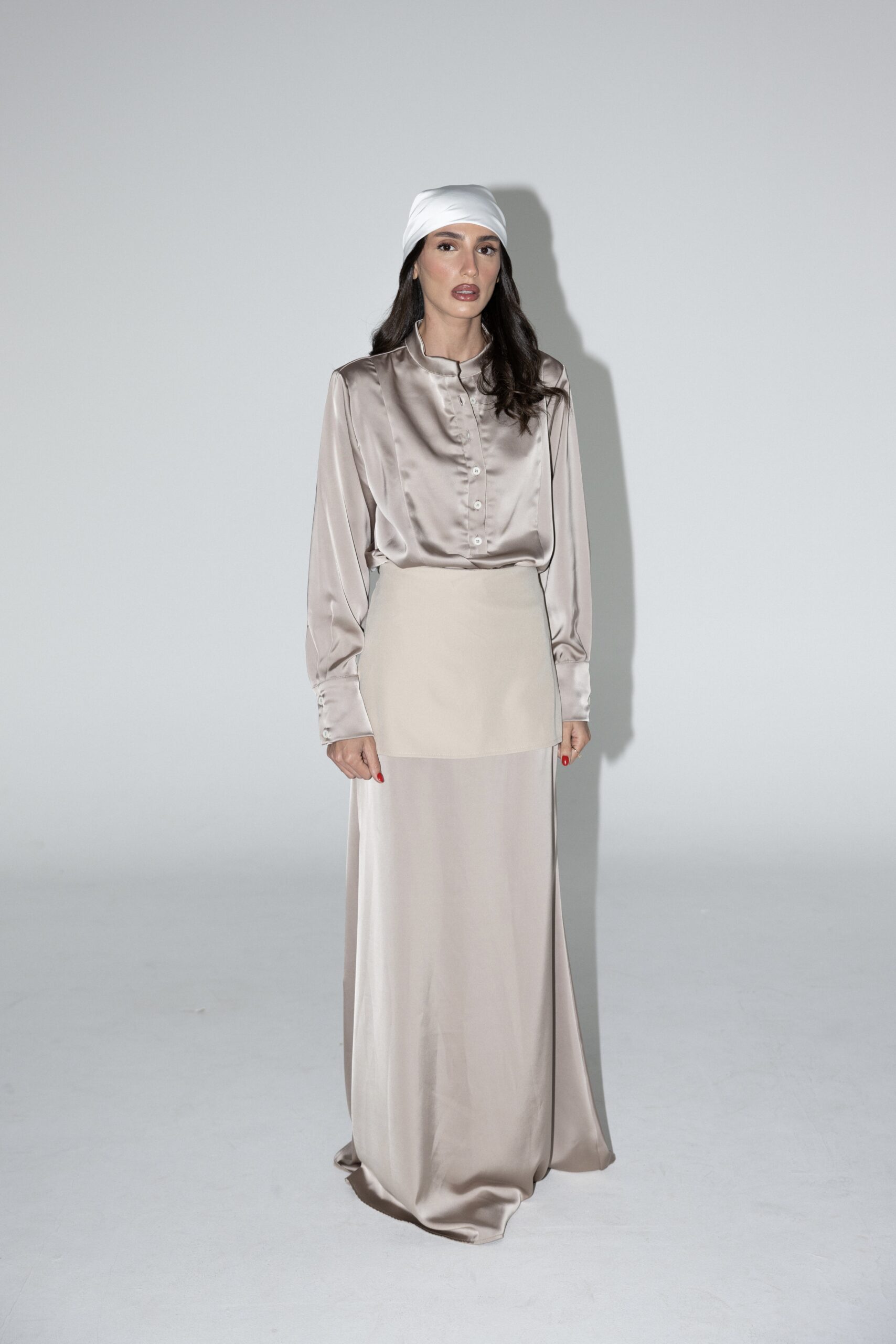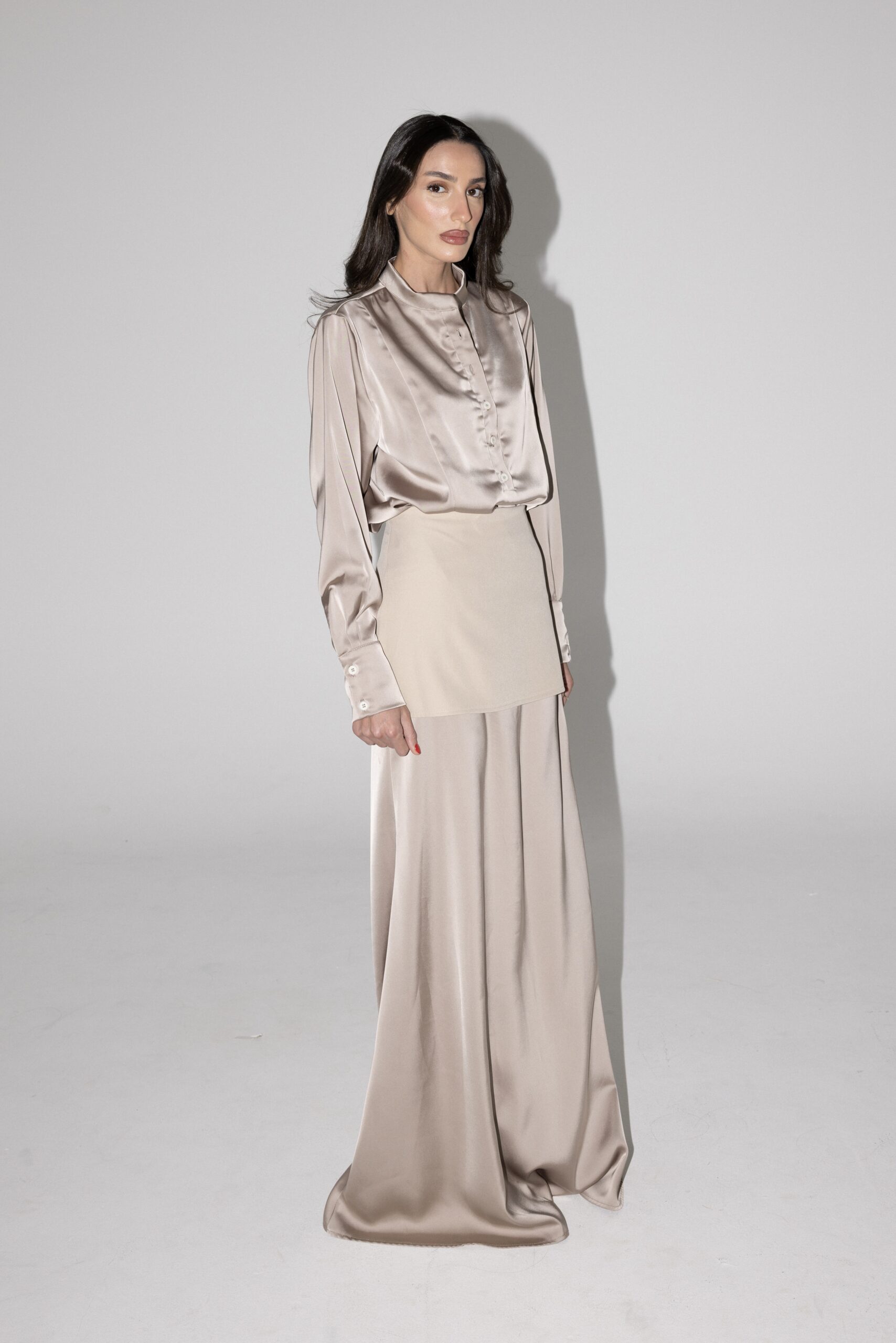 חליפת שני חלקים מבד סאטן, חולצה מכופתרת עם צווארון סיני וחצאית מקסי עם שכבת בד מחוברת לחצאית.