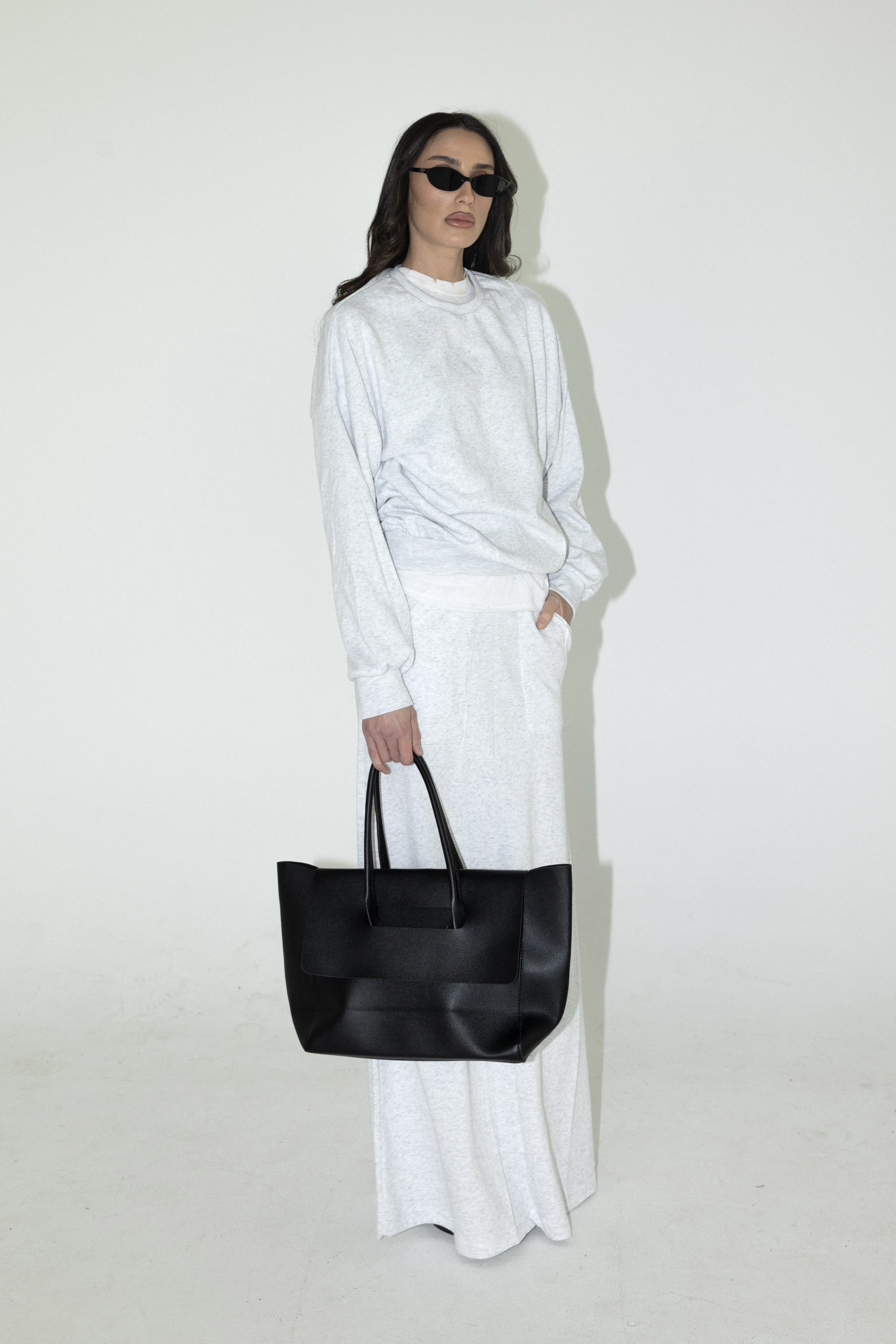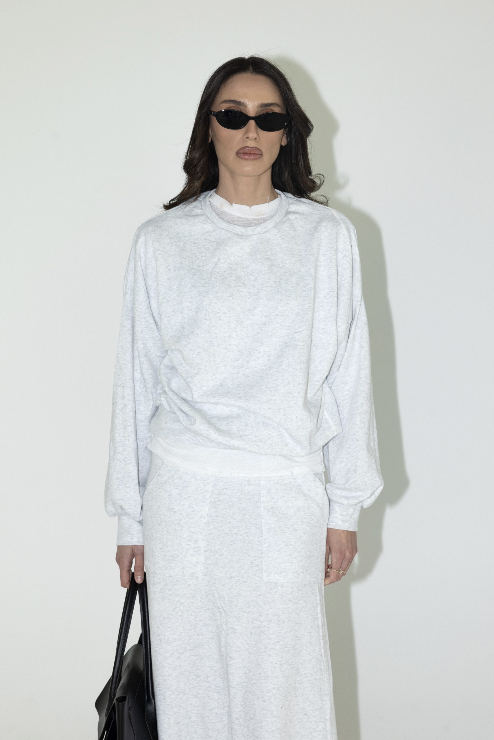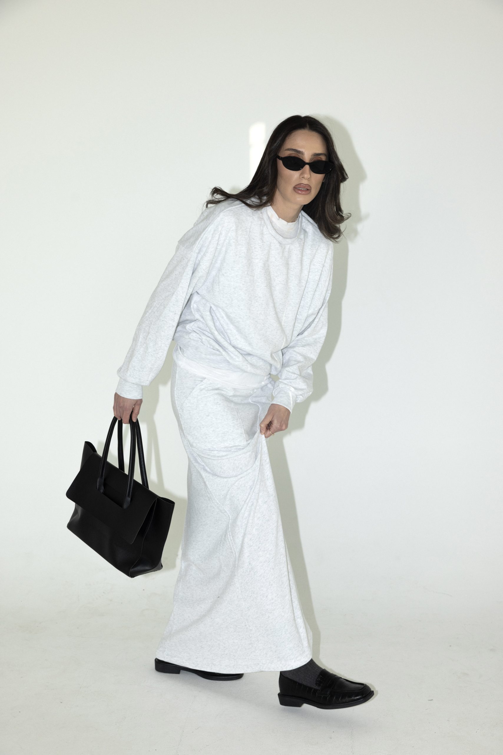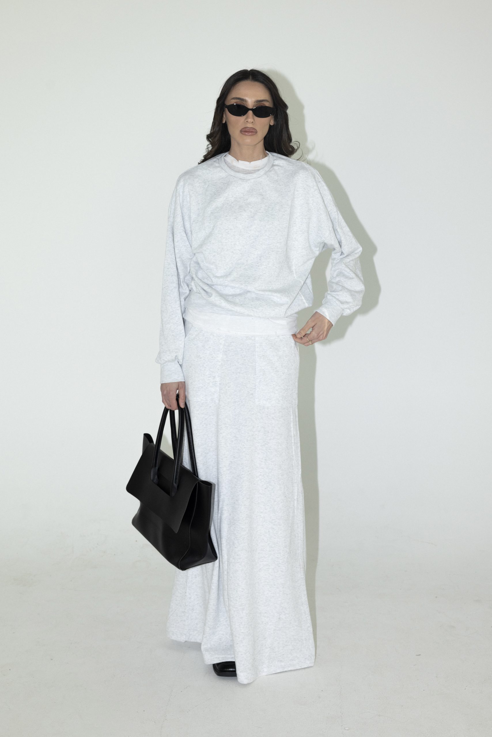 חליפת שני חלקים מבד פרנד צטרי, חולצה עם צווארון ניקי ושרוולים ארוכים וחצאית מקסי עם גומי למעלה וכיסים.