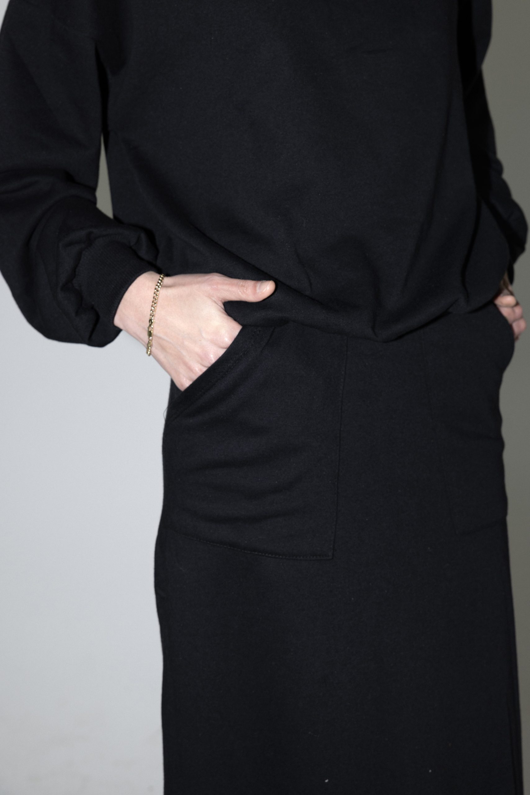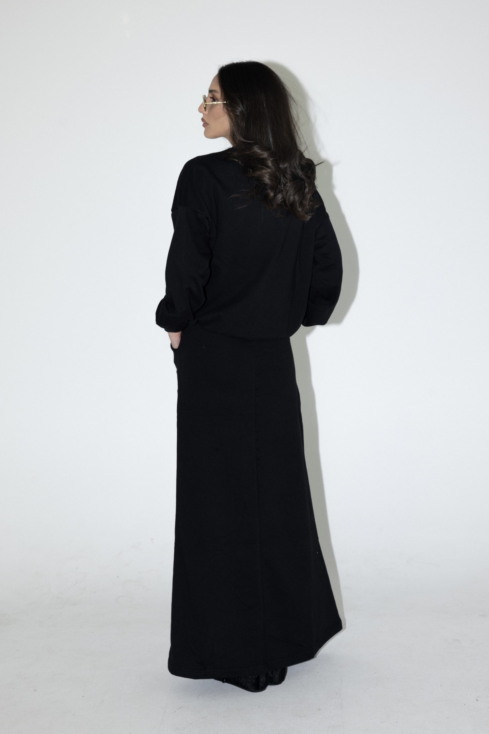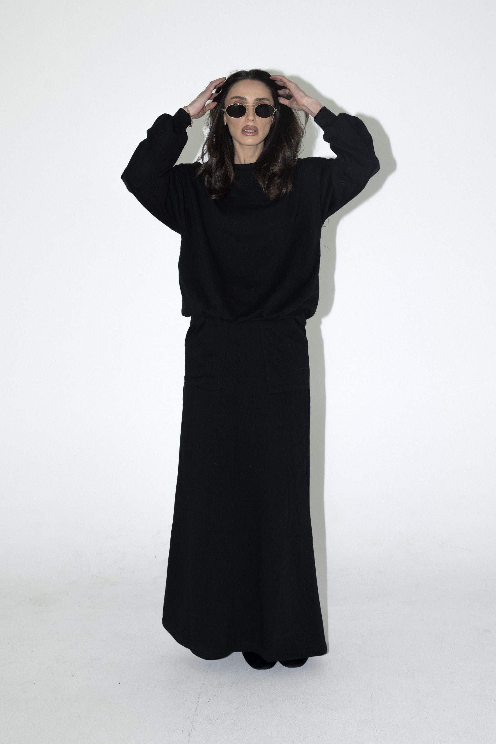 חליפת שני חלקים מבד פרנד צטרי, חולצה עם צווארון ניקי ושרוולים ארוכים וחצאית מקסי עם גומי למעלה וכיסים.