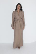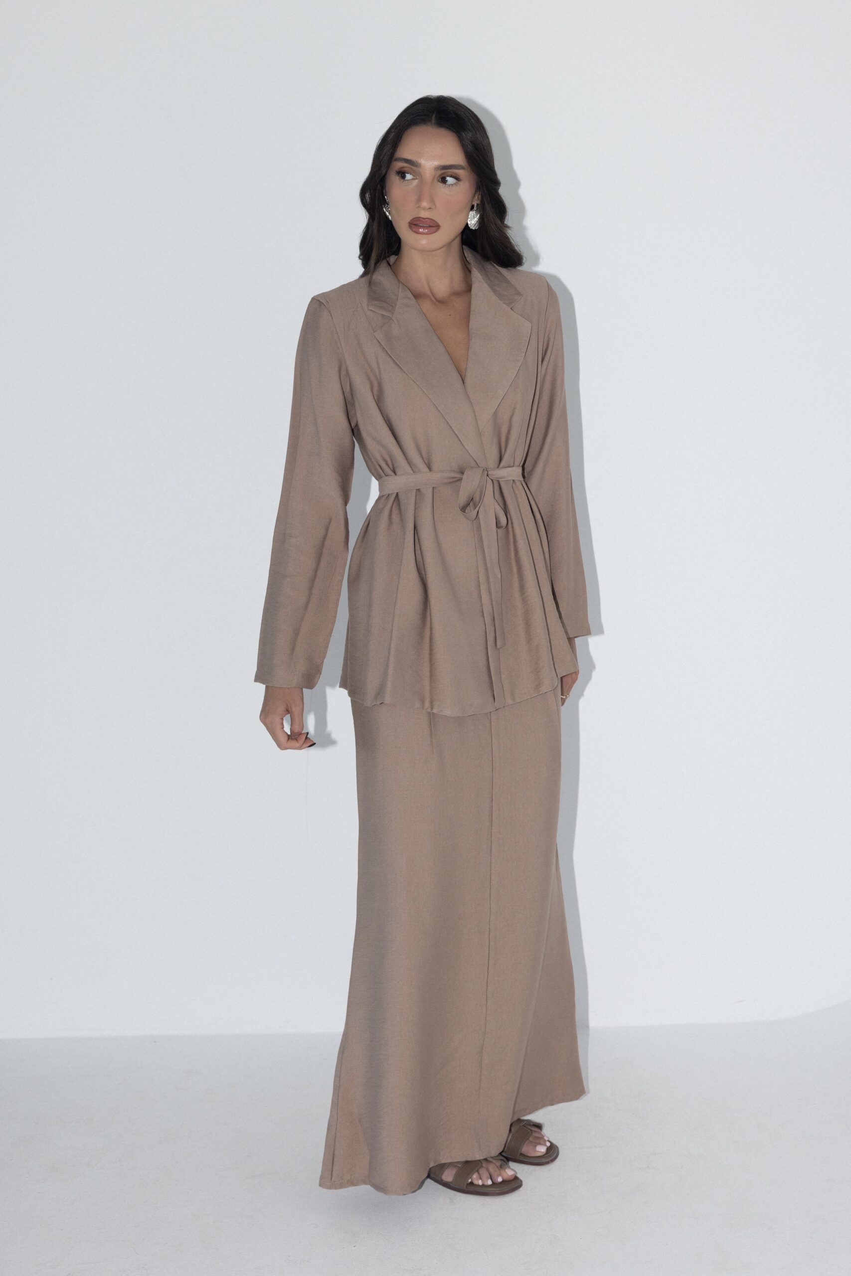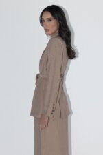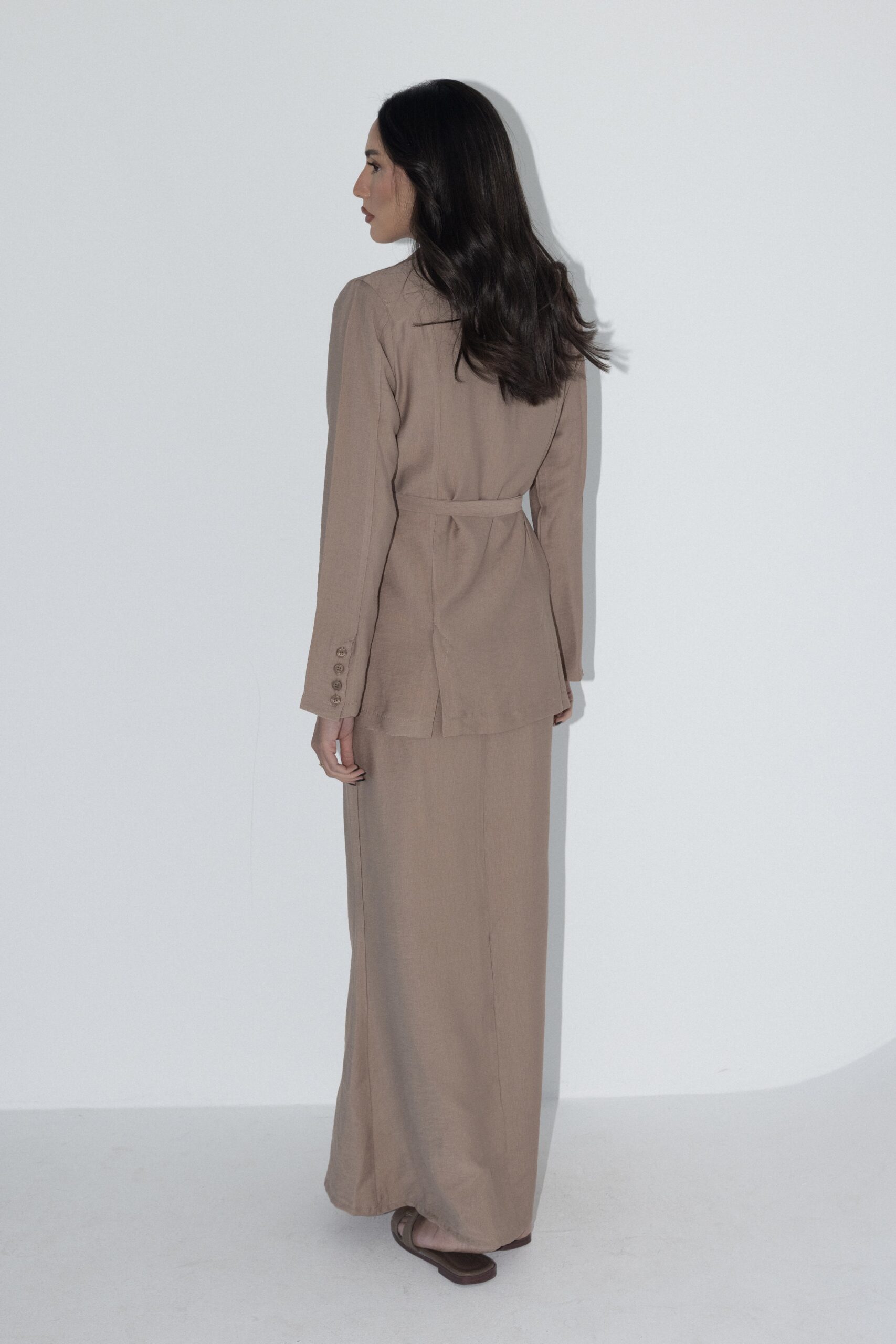 חליפת מבד פשתן קלאסית ונקייה. ז’קט מעטפת עם קשירה במותן וחצאית מקסי קלילה. הבחירה המושלמת לימים חמימים בלוק אלגנטי ומדויק. מידת הבגד על הדוגמנית 0.