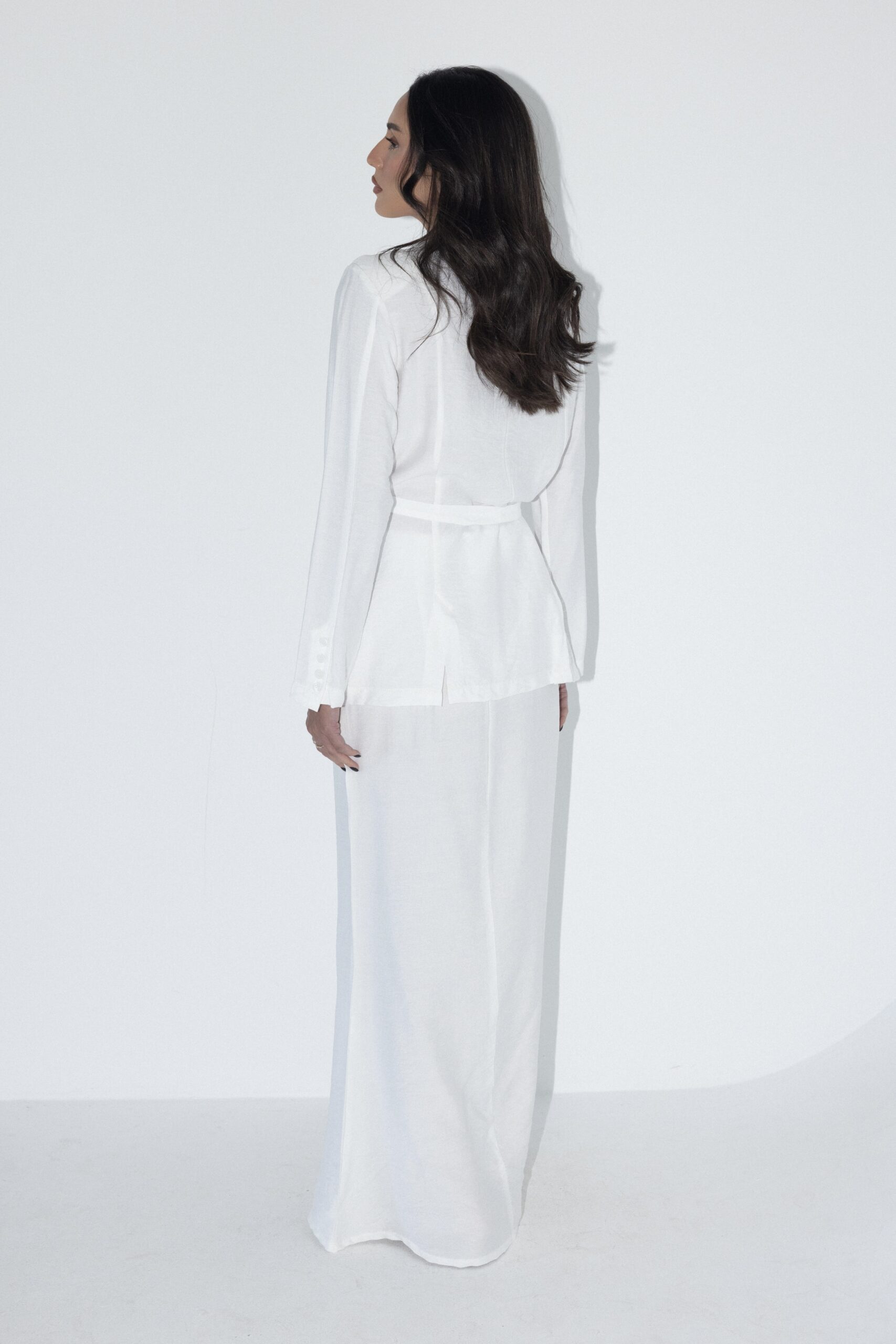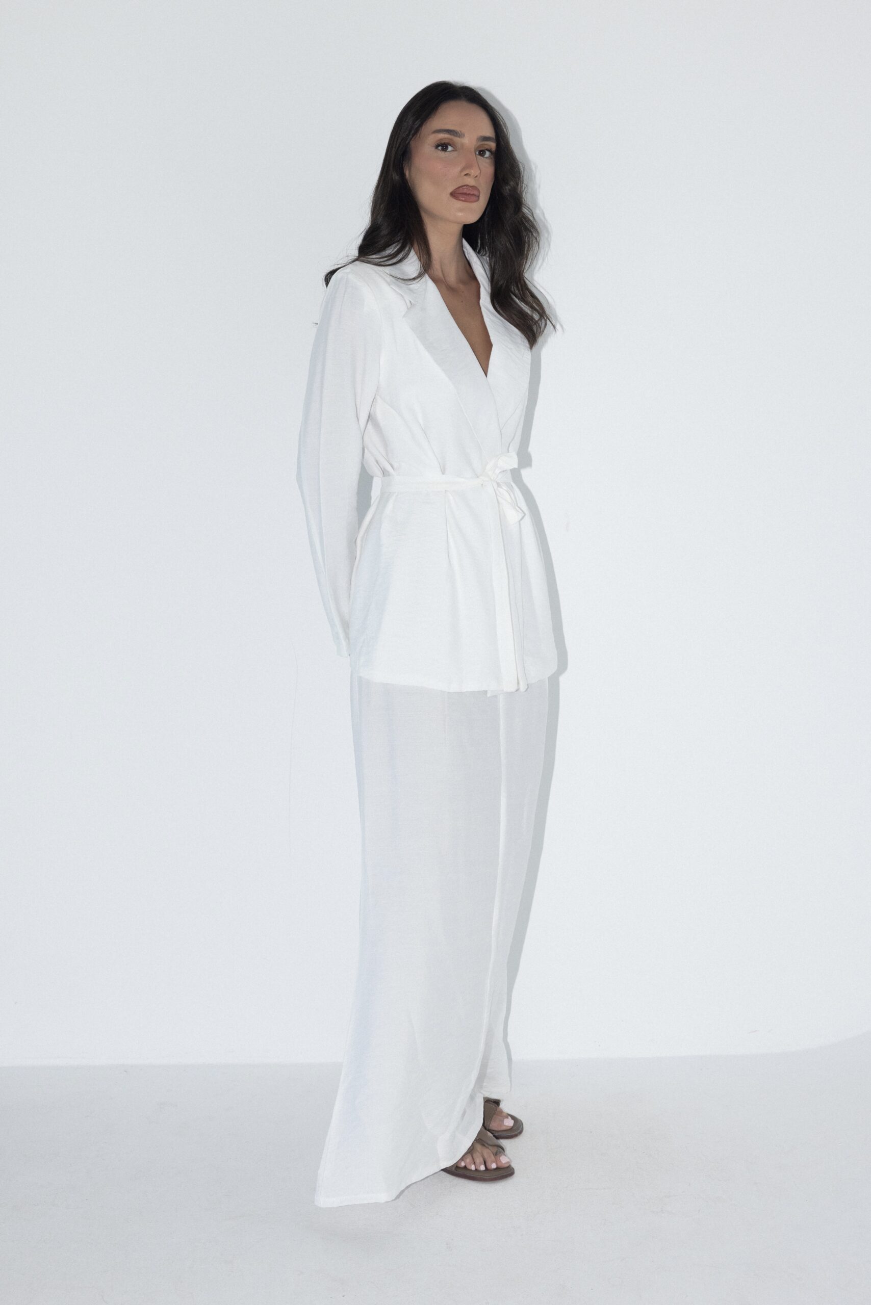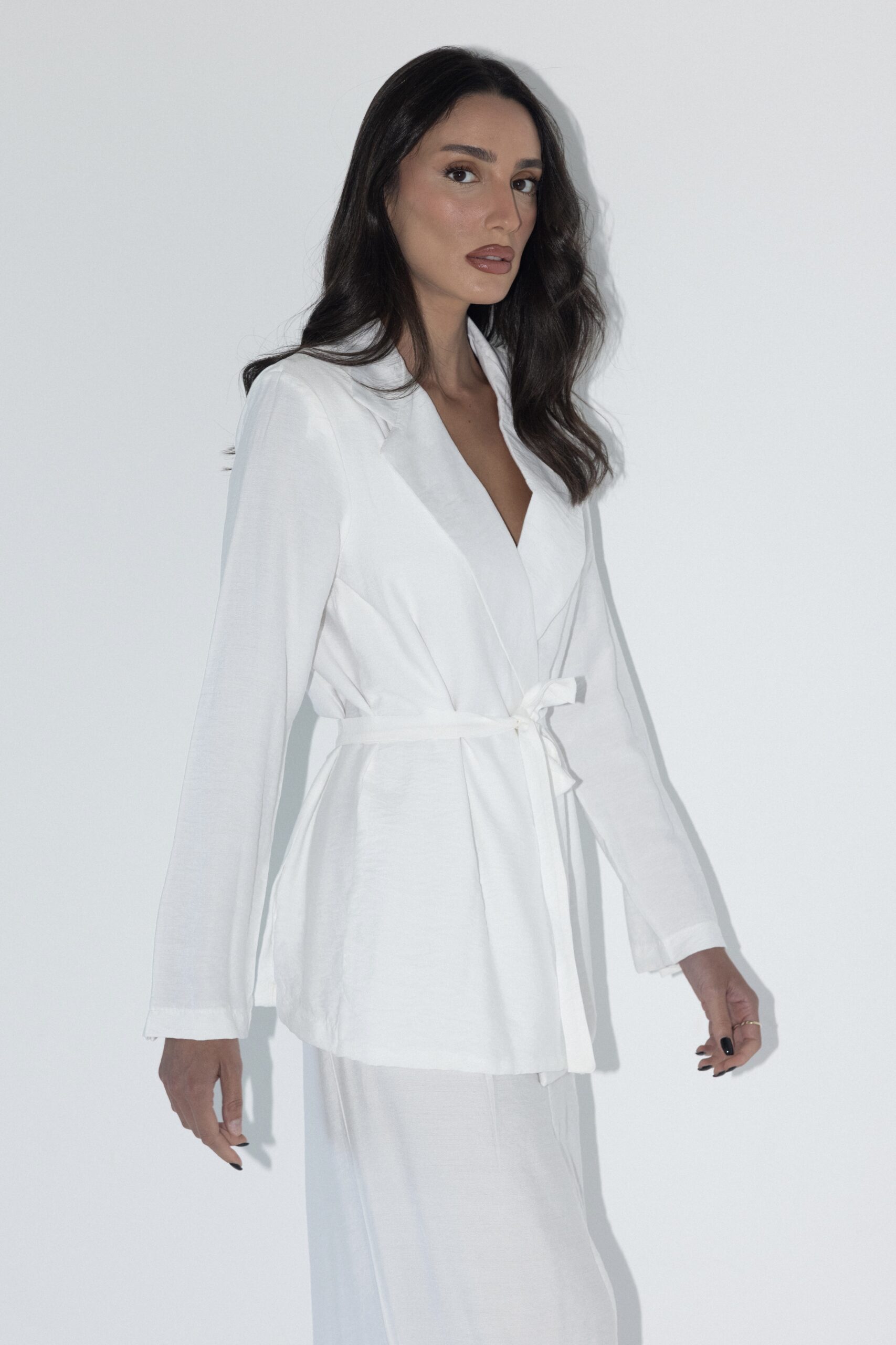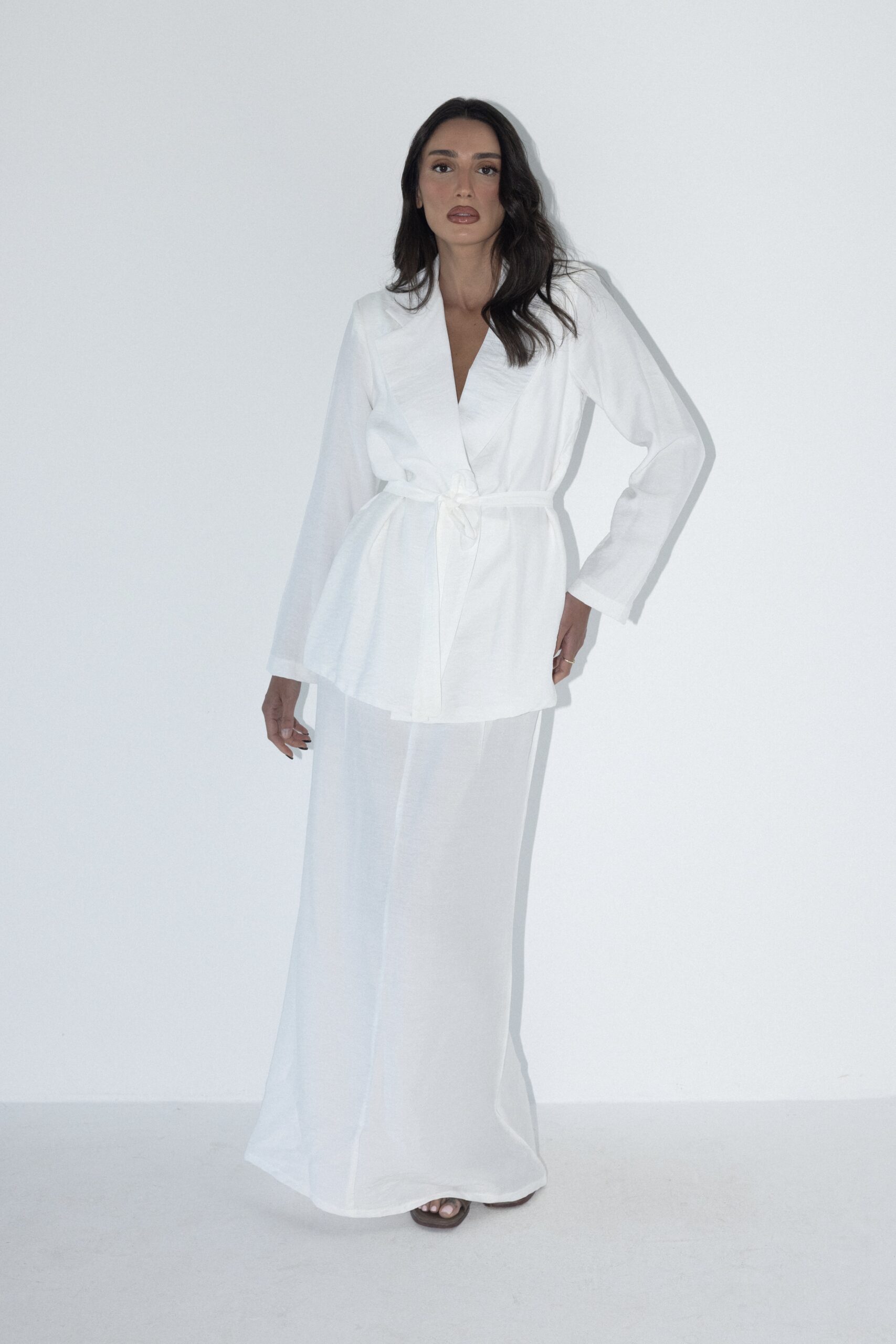 חליפת מבד פשתן קלאסית ונקייה. ז’קט מעטפת עם קשירה במותן וחצאית מקסי קלילה. הבחירה המושלמת לימים חמימים בלוק אלגנטי ומדויק. מידת הבגד על הדוגמנית 0.