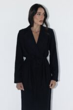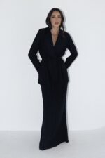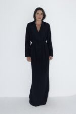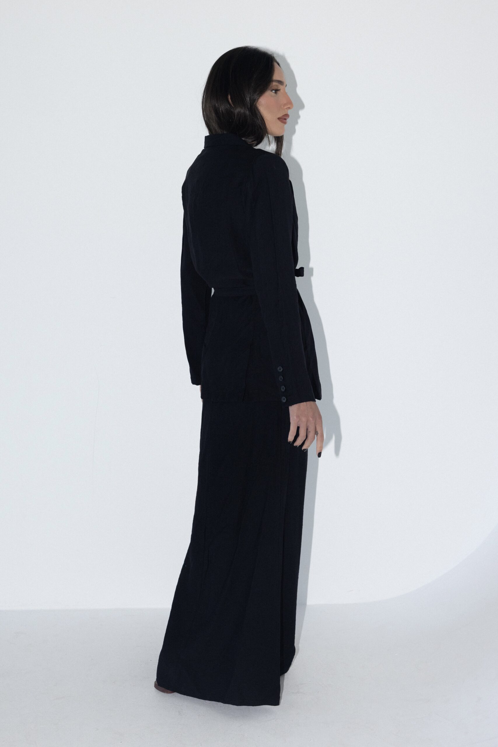 חליפת מבד פשתן קלאסית ונקייה. ז’קט מעטפת עם קשירה במותן וחצאית מקסי קלילה. הבחירה המושלמת לימים חמימים בלוק אלגנטי ומדויק. מידת הבגד על הדוגמנית 0.