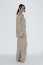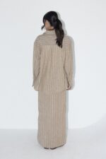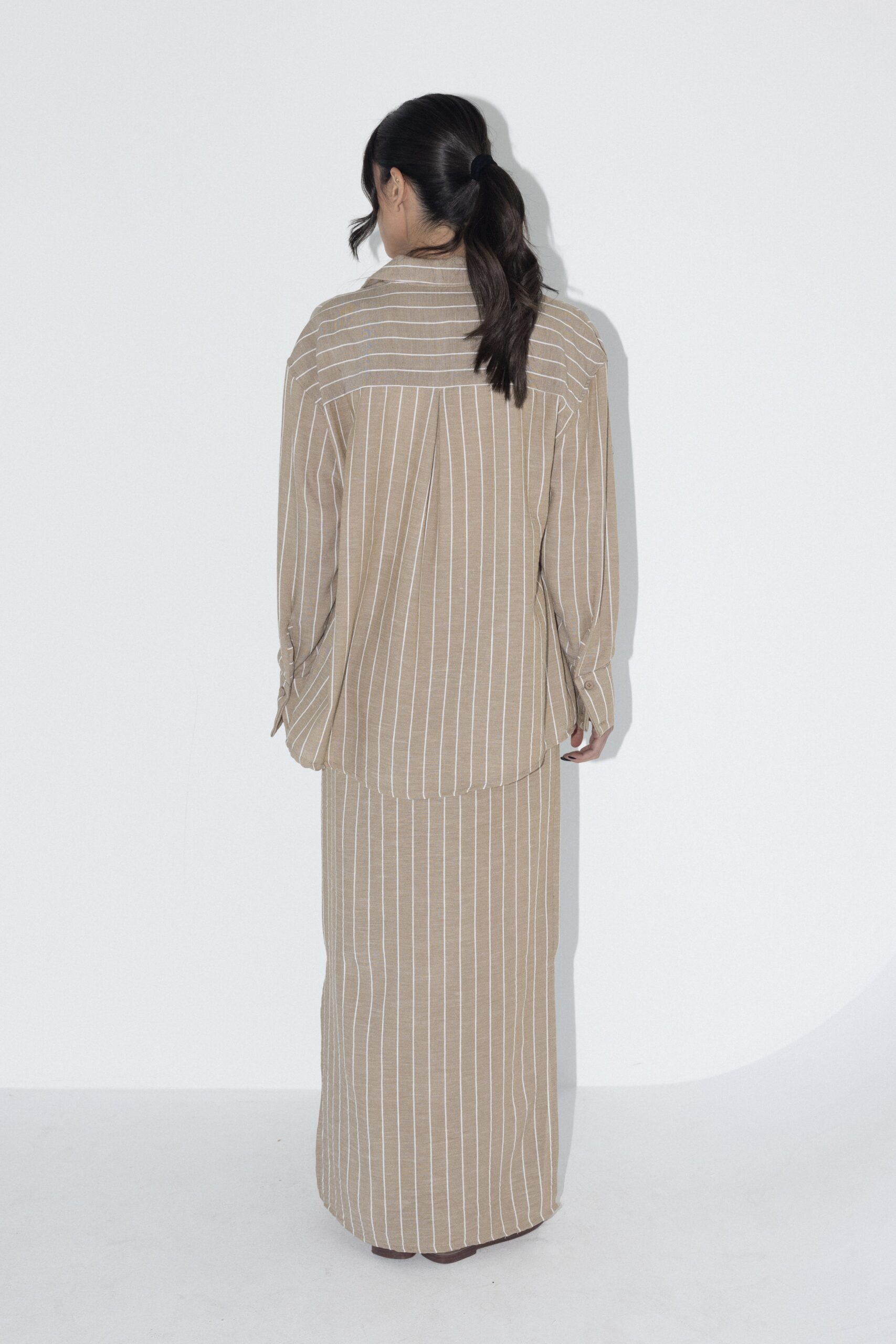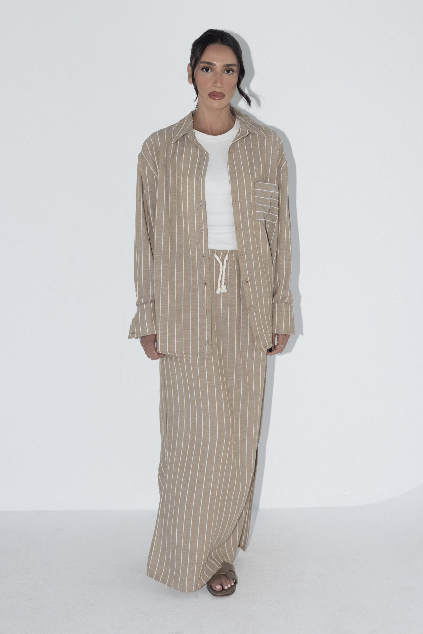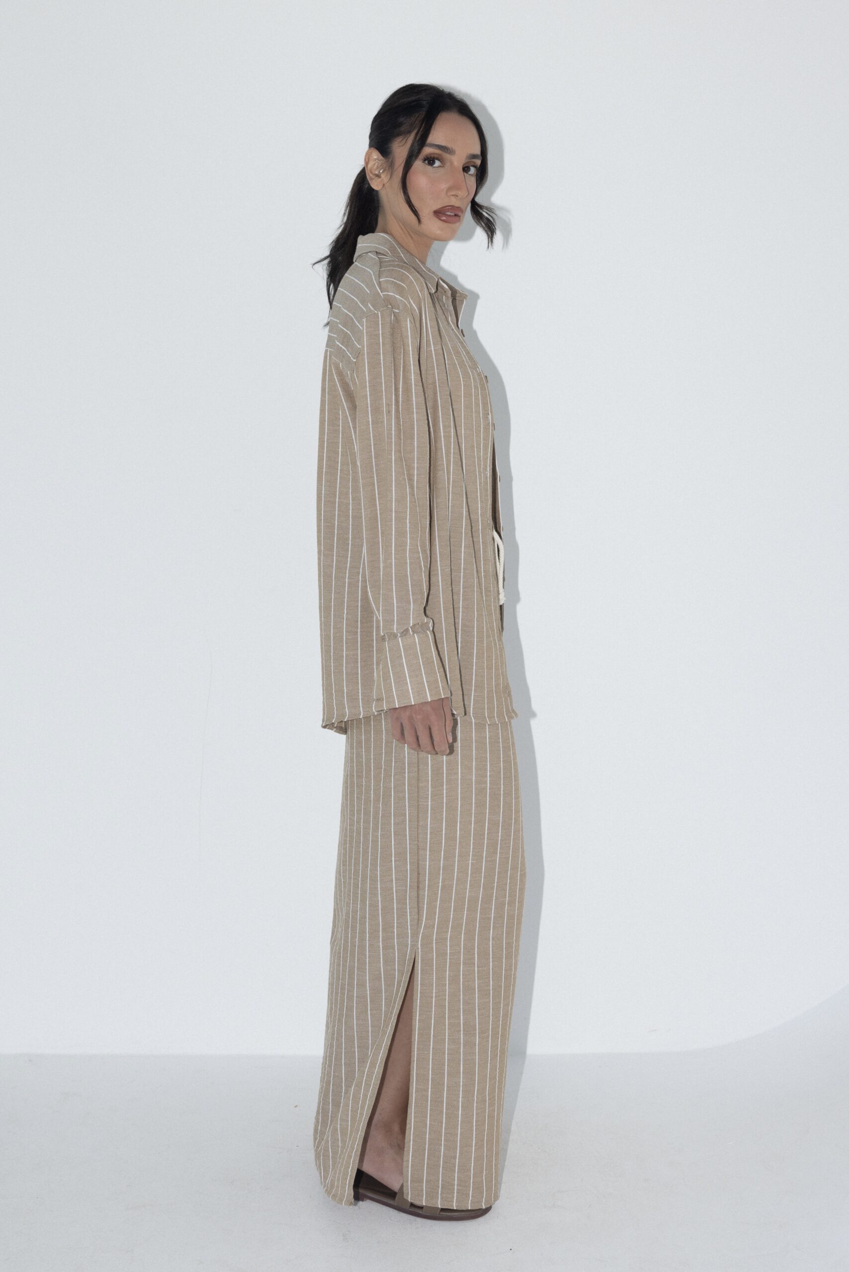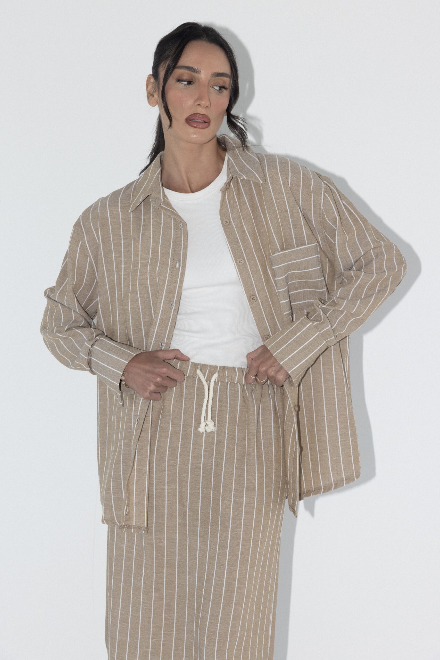 חליפה קז’ואלית מושלמת ליום-יום חולצה מכופתרת בגזרת אוברסייז עם כיס קדמי, וחצאית מקסי תואמת עם גומי ושרוך במותן ופתח צד לנוחות מירבית. עשויה בד אוורירי ונעים עם פסים לבנים עדינים מידת הבגד על הדוגמנית 0.