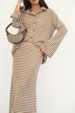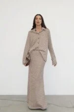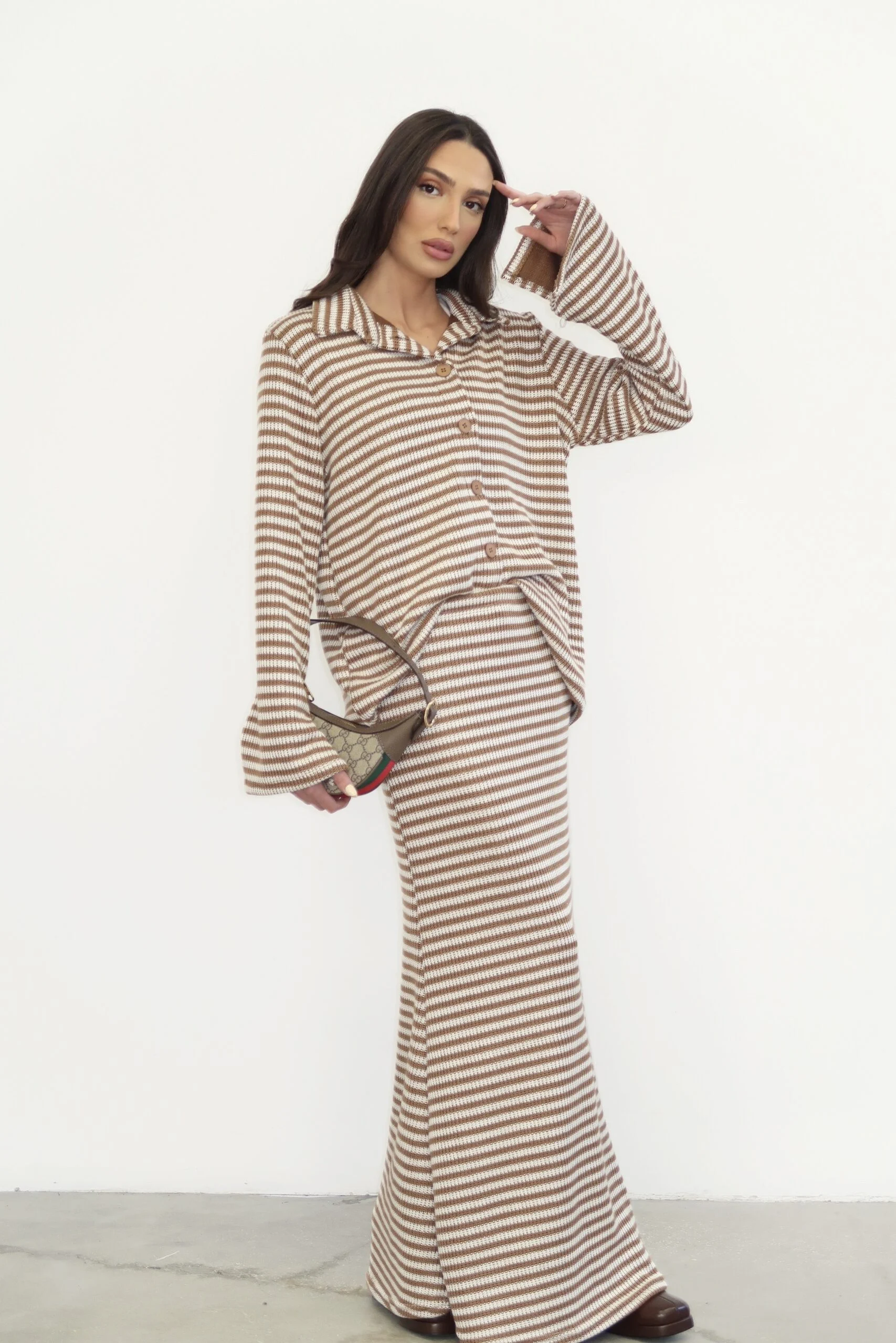 חליפת שני חלקים, קרטיגן בגזרת אובר סייז ושרוולים ארוכים מתרחבים וחצאית מקסי עם גומי למעלה.