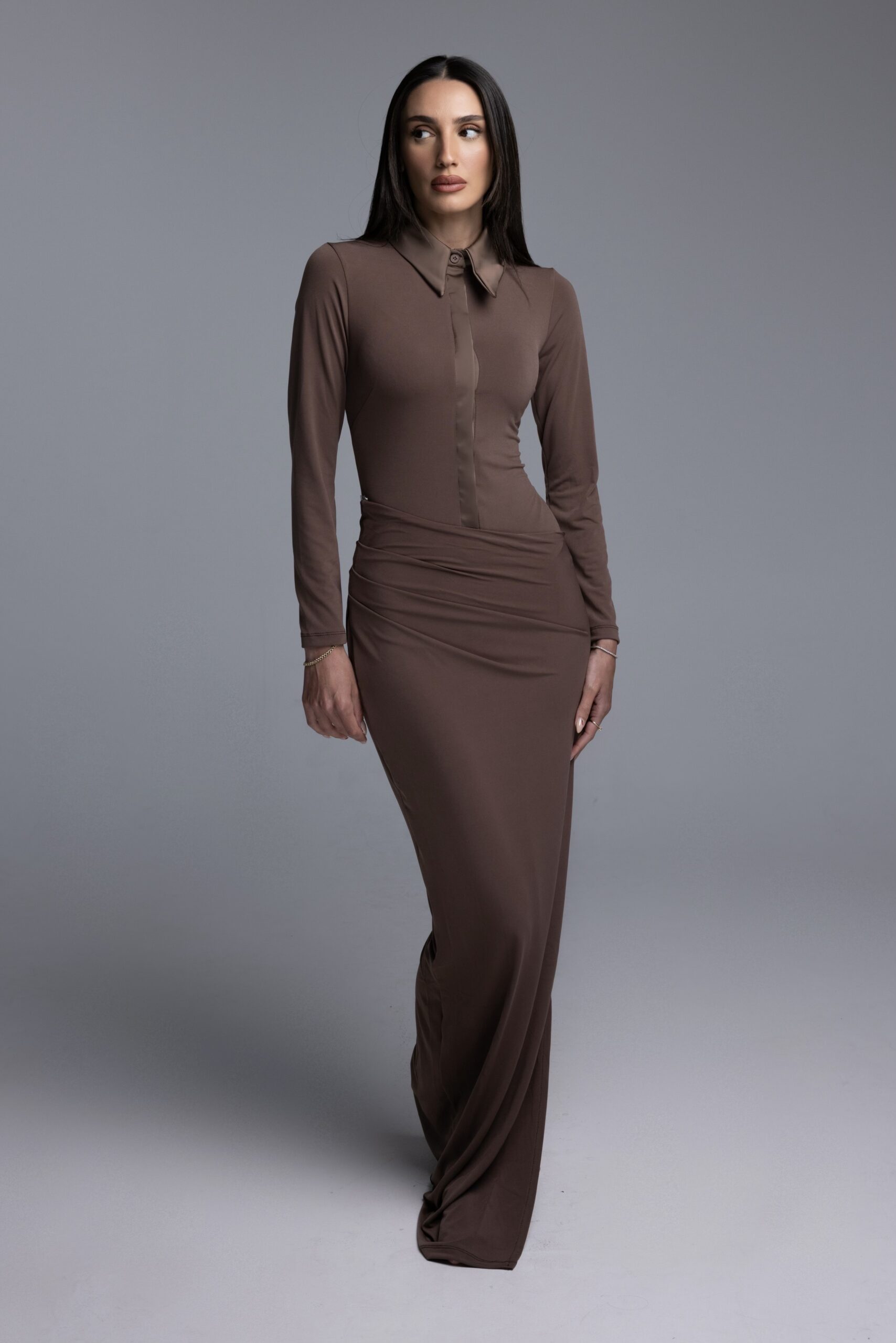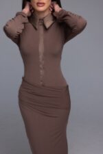 חליפה אלגנטית מבד לייקרה המשלבת בגד גוף עם צווארון וכפתורים נסתרים יחד עם חצאית מקסי מחטבת עם כיווצים במותן. מידת הבגד על הדוגמנית 0.
