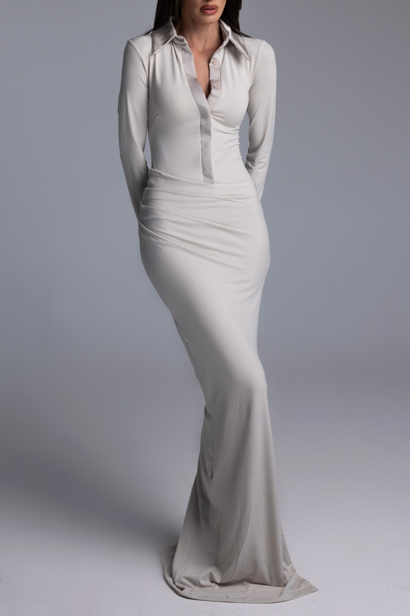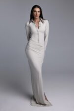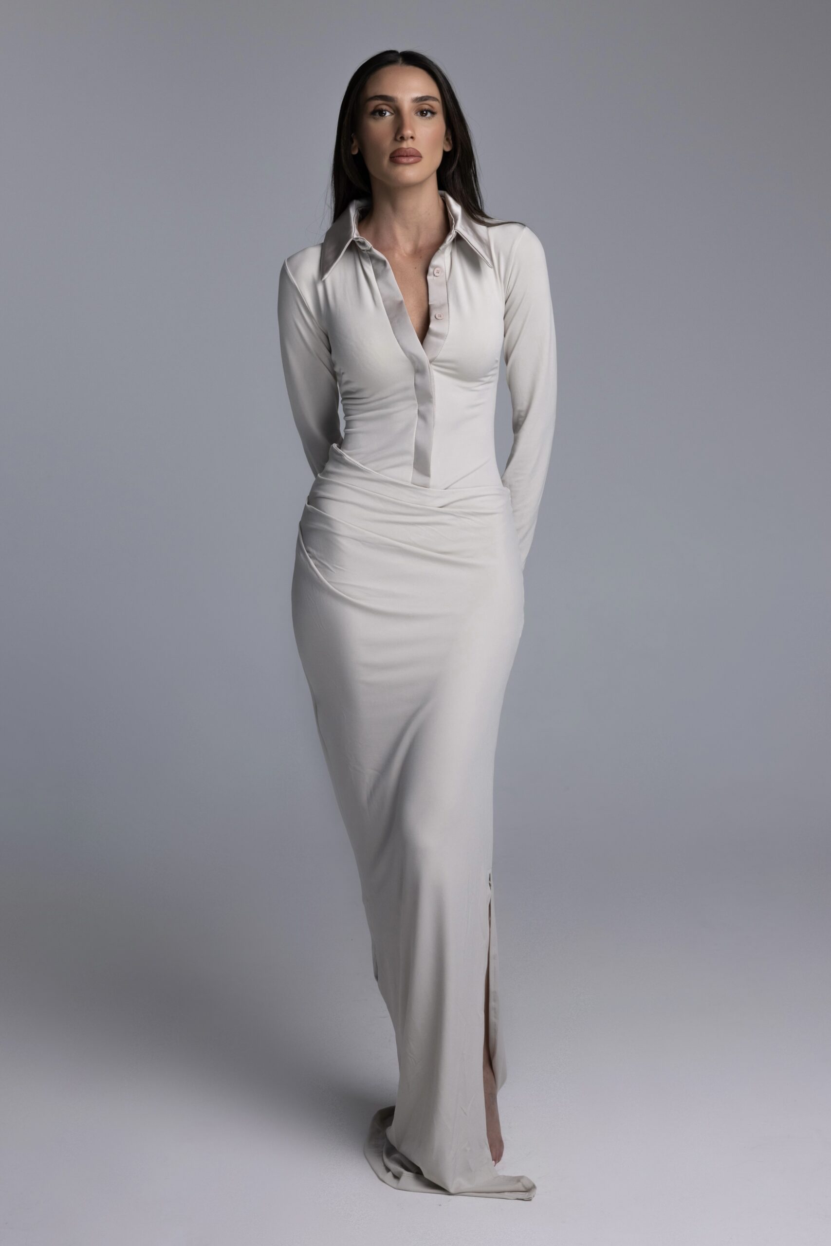 חליפה אלגנטית מבד לייקרה המשלבת בגד גוף עם צווארון וכפתורים נסתרים יחד עם חצאית מקסי מחטבת עם כיווצים במותן. מידת הבגד על הדוגמנית 0.