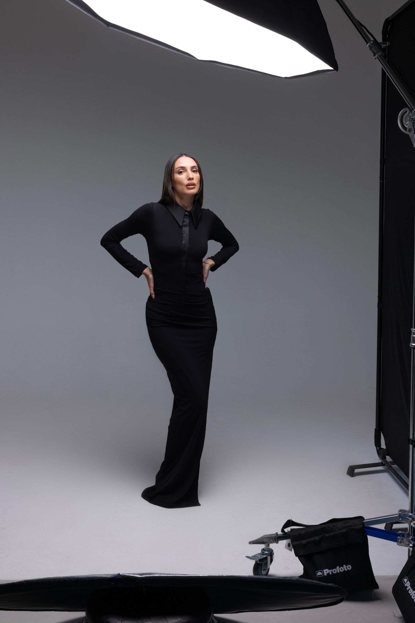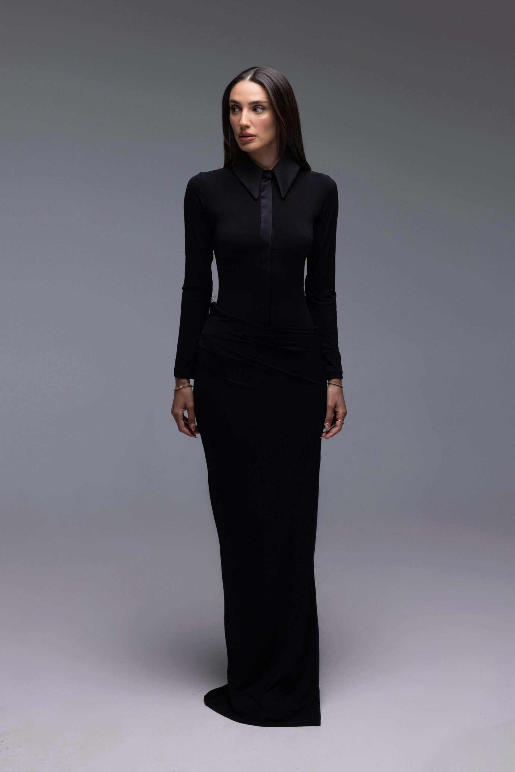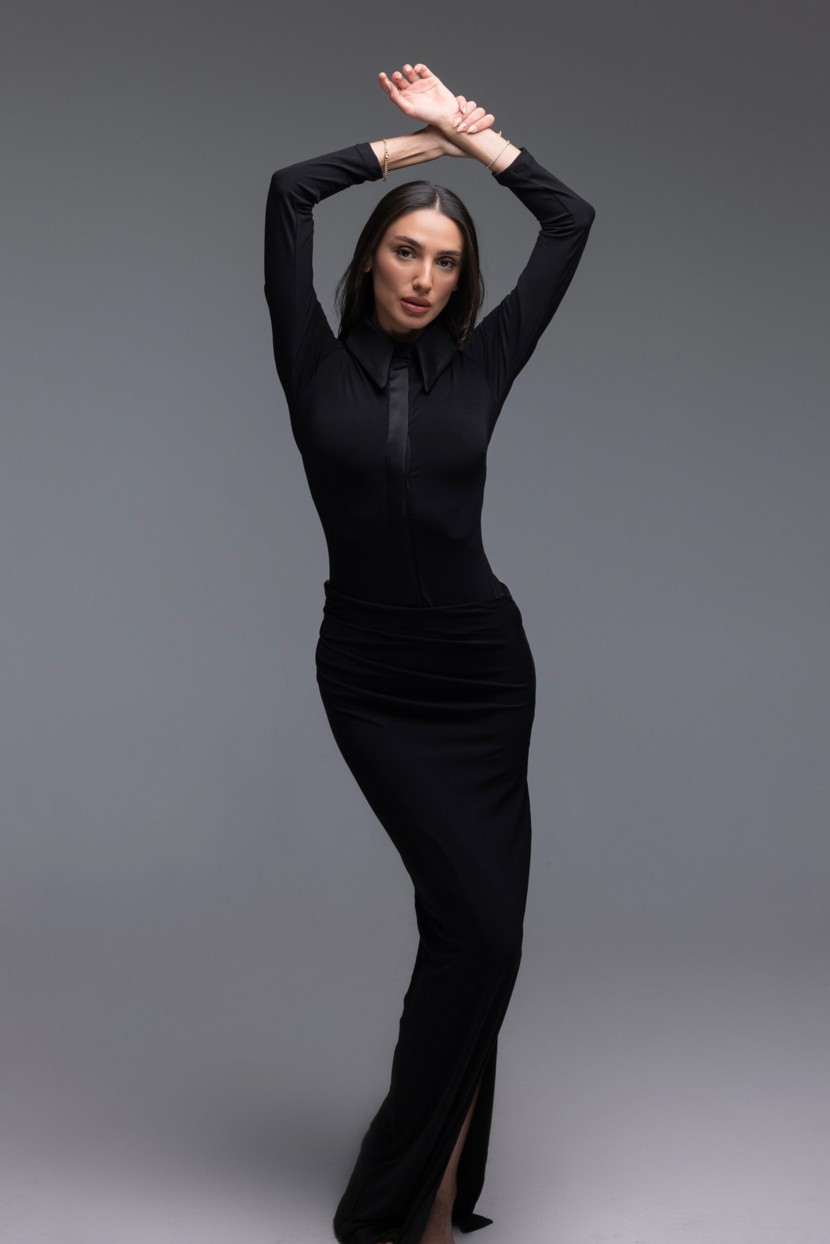 חליפה אלגנטית מבד לייקרה המשלבת בגד גוף עם צווארון וכפתורים נסתרים יחד עם חצאית מקסי מחטבת עם כיווצים במותן. מידת הבגד על הדוגמנית 0.