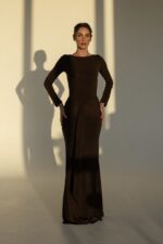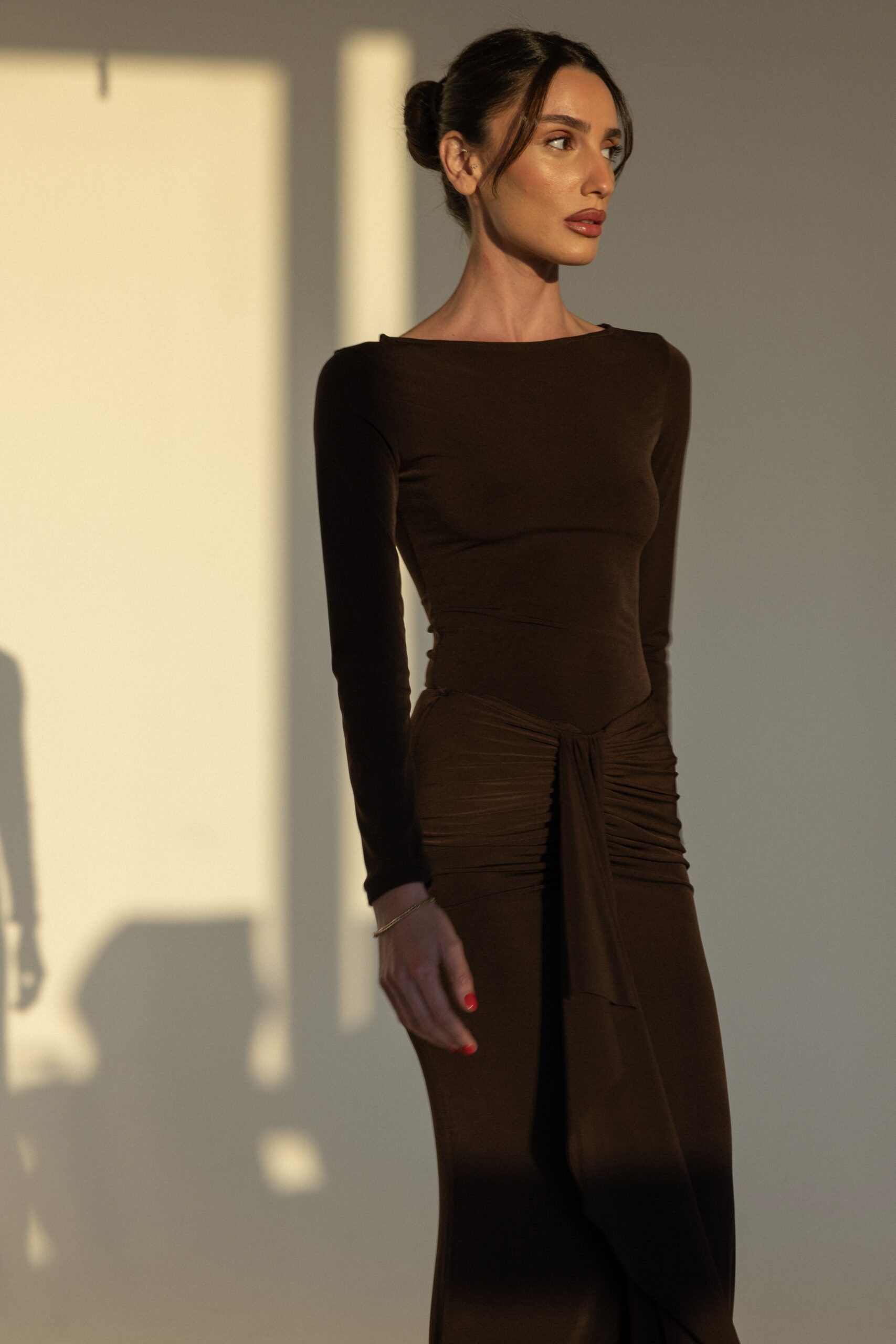 חליפת שני חלקים מבד לייקרה, בגד גוף עם שרוולים ארוכים וחצאית ארוכה עם כיווצים באזור הבטן. מידת הבגד על הדוגמנית 0.