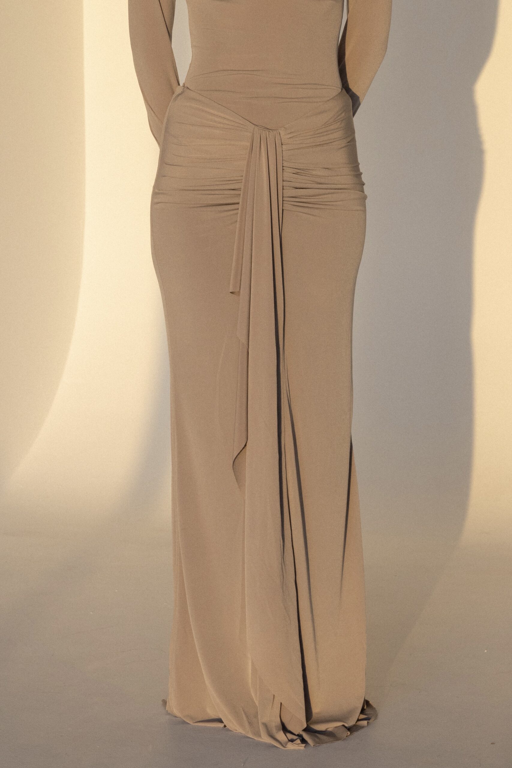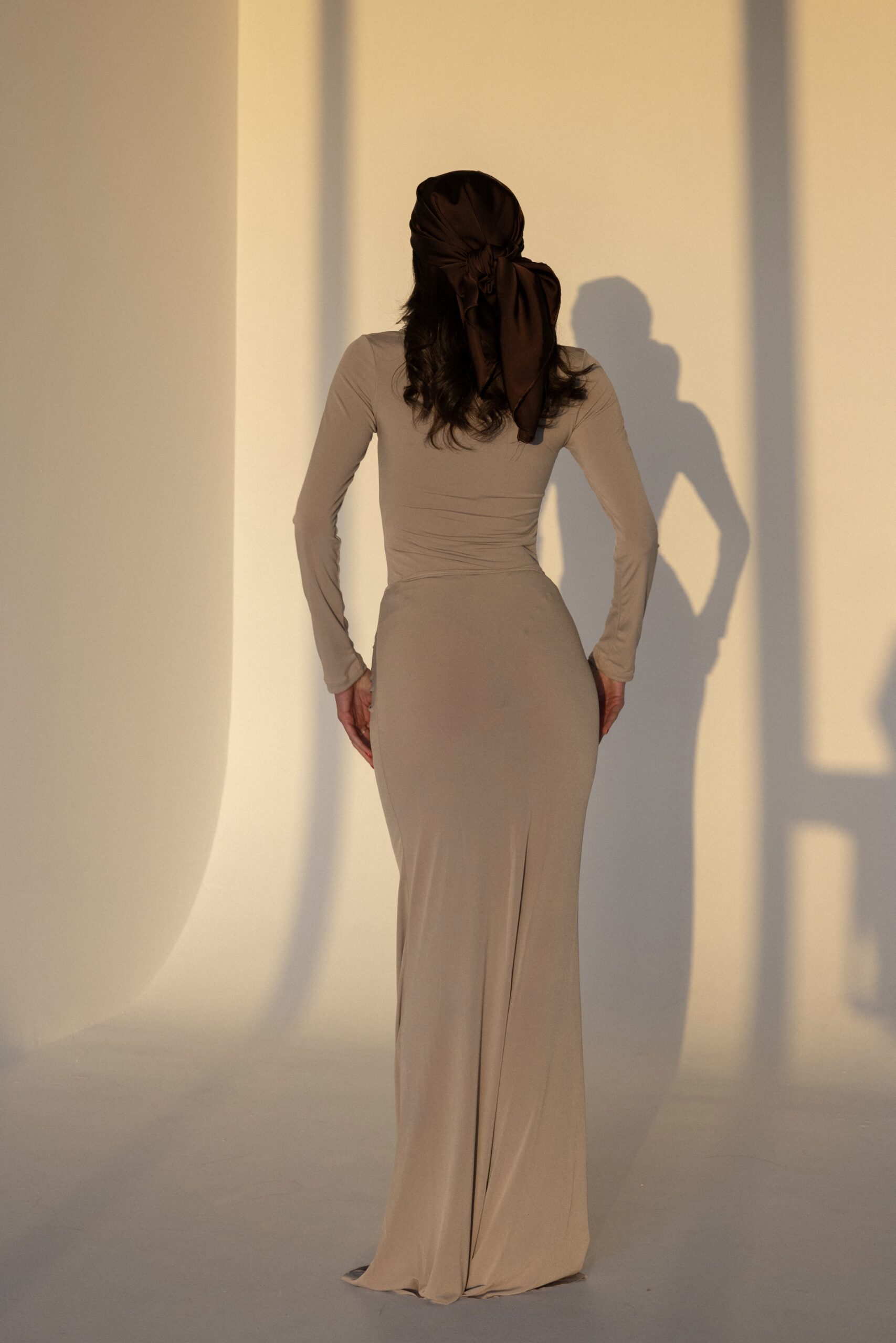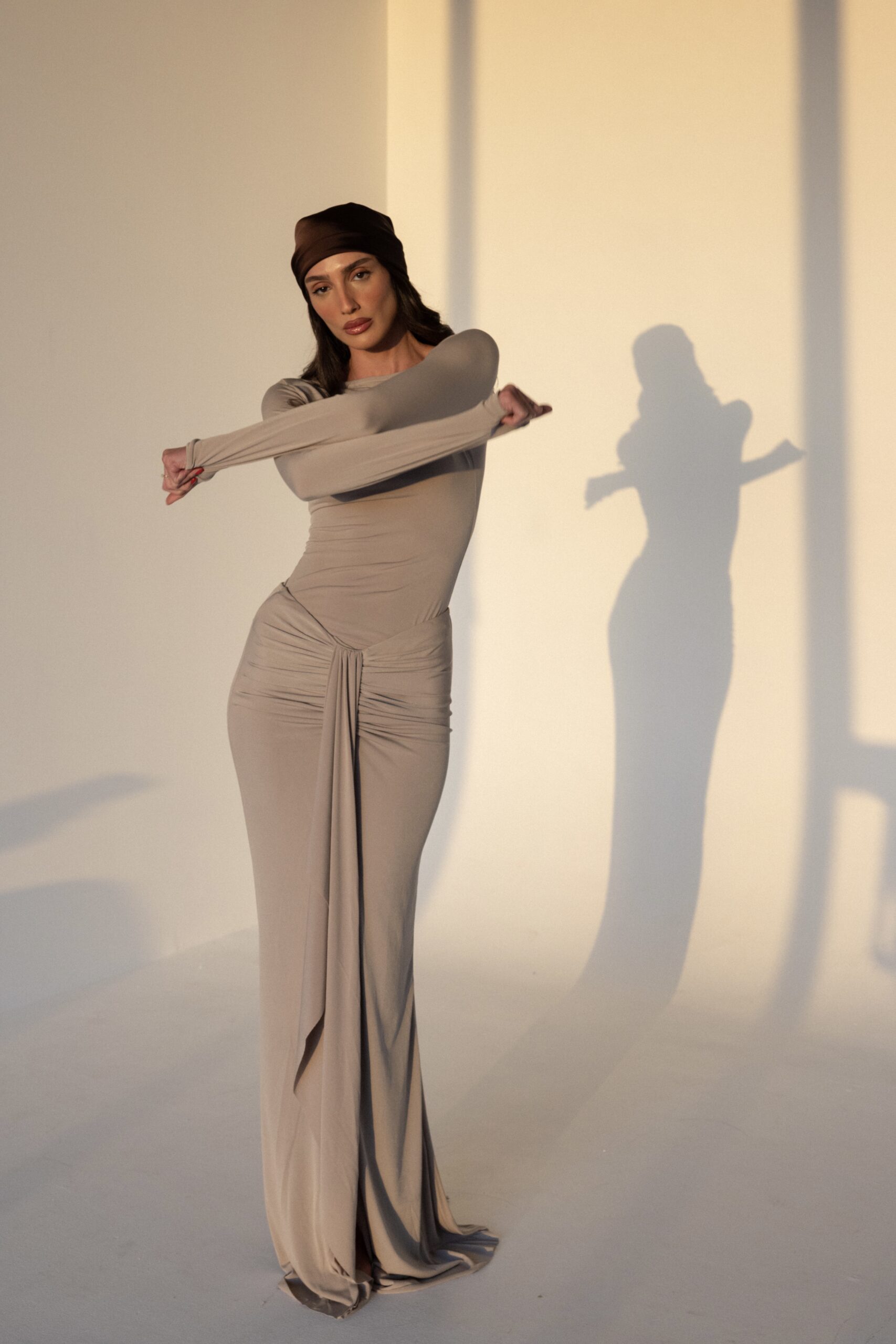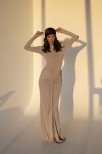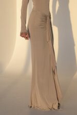 חליפת שני חלקים מבד לייקרה, בגד גוף עם שרוולים ארוכים וחצאית ארוכה עם כיווצים באזור הבטן. מידת הבגד על הדוגמנית 0.