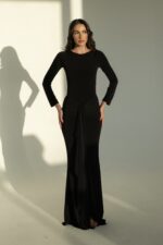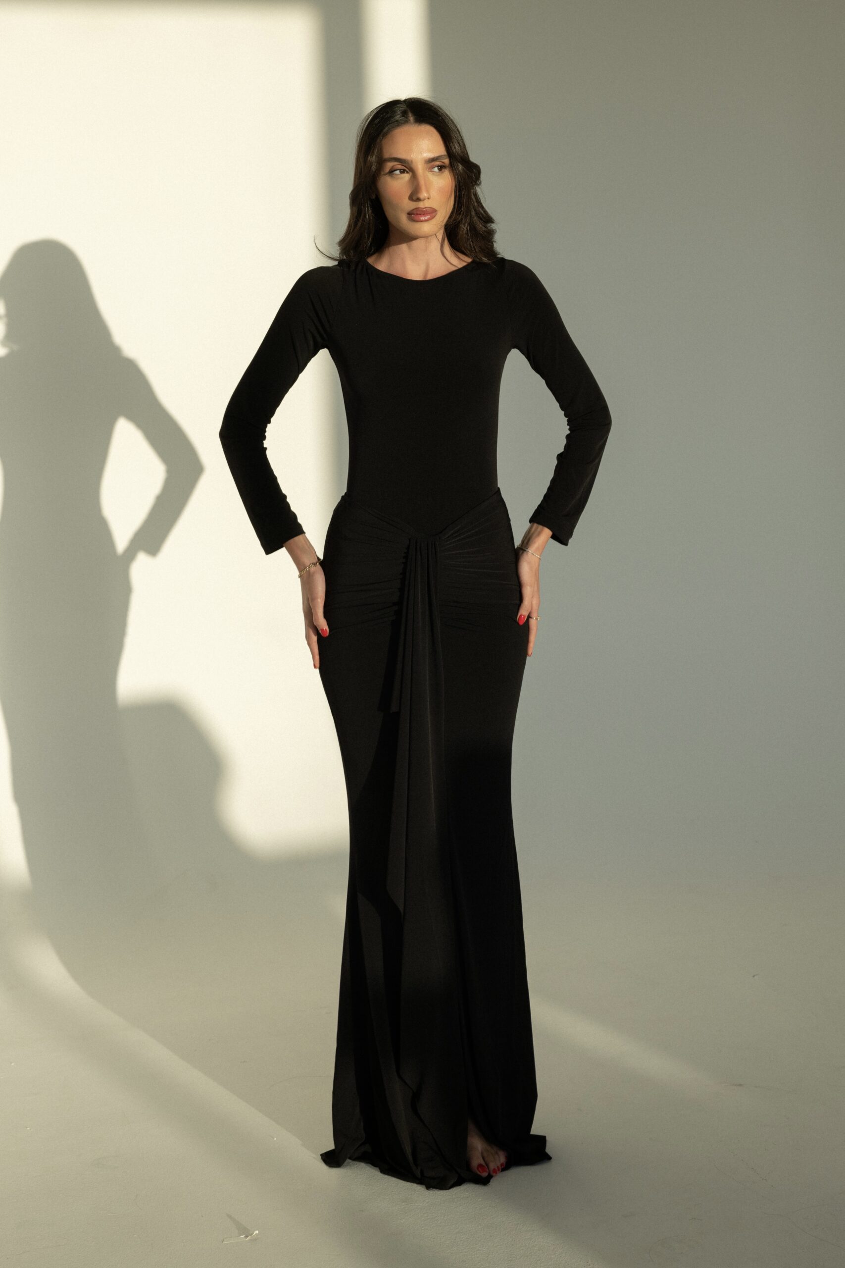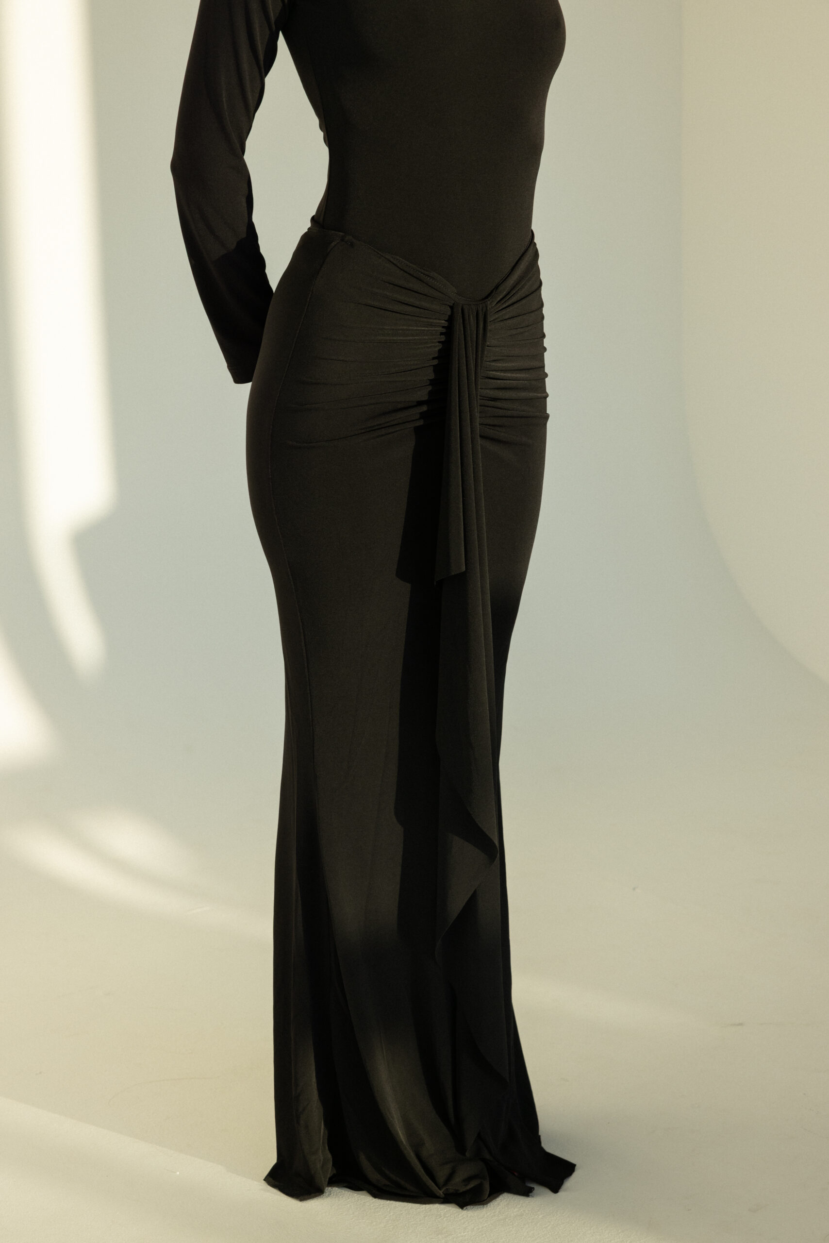 חליפת שני חלקים מבד לייקרה, בגד גוף עם שרוולים ארוכים וחצאית ארוכה עם כיווצים באזור הבטן. מידת הבגד על הדוגמנית 0.