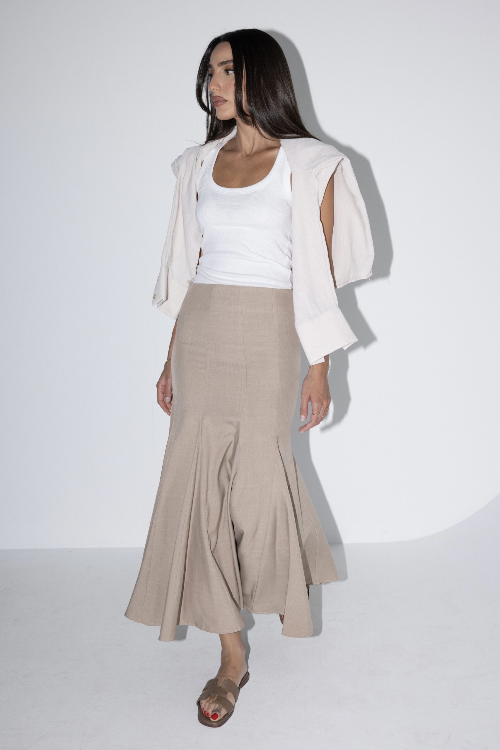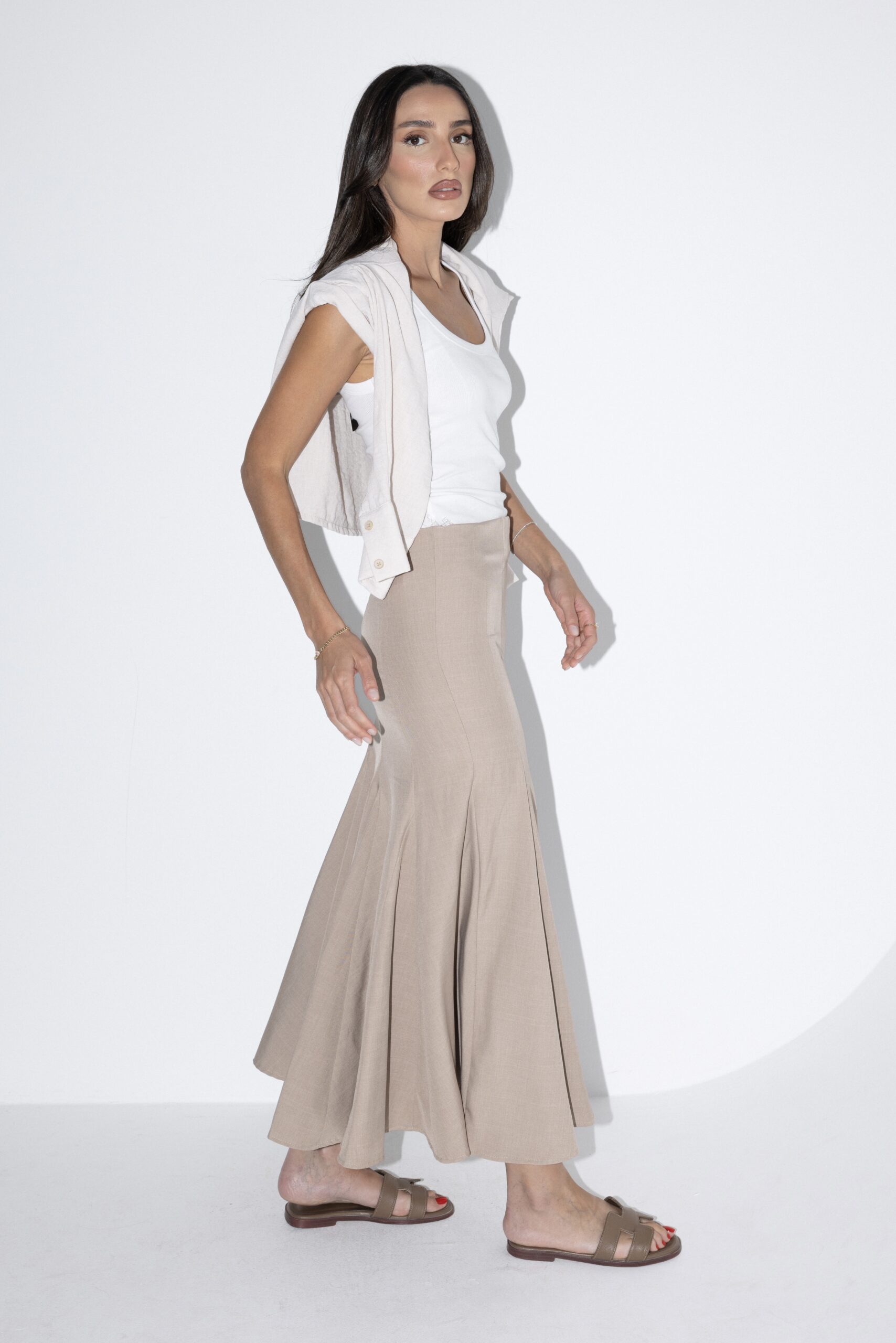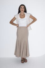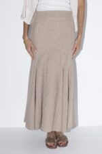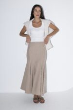 חצאית מקסי בגזרה מחמיאה המדגישה את המותן ומתרחבת כלפי מטה עם תוספת קפלים עדינים היוצרים תנועה רכה ואלגנטית. החצאית עם רוכסן אחורי. מידת הבגד על הדוגמנית 0.