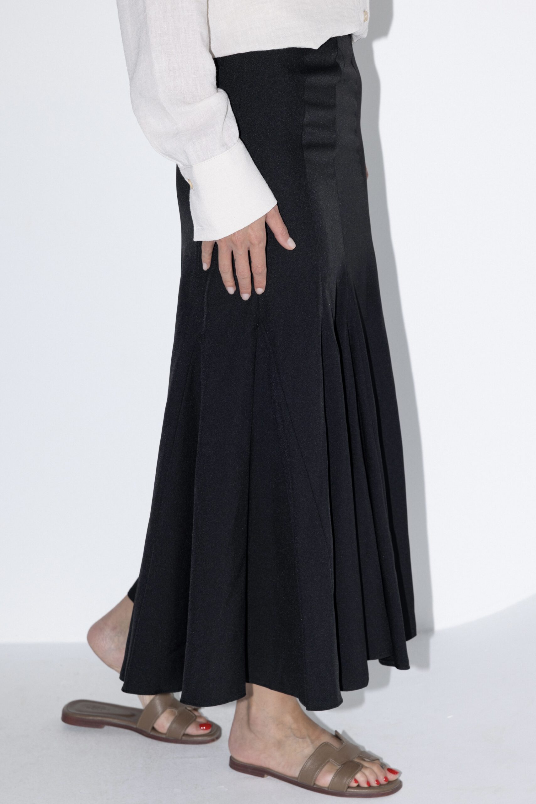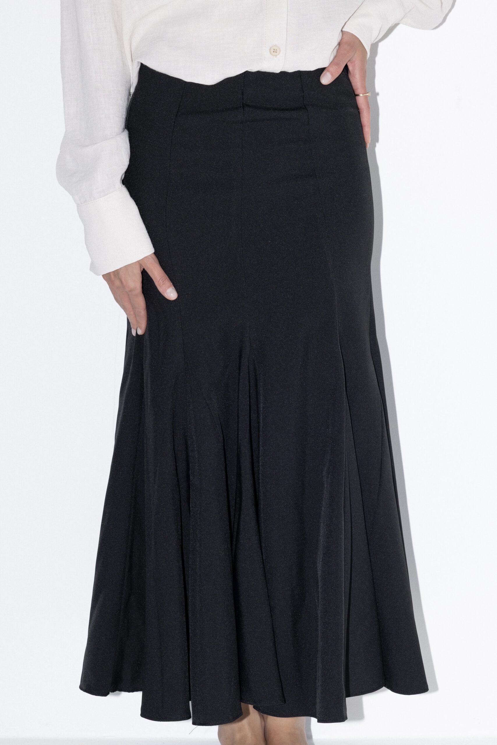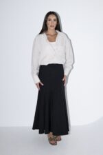 חצאית מקסי בגזרה מחמיאה המדגישה את המותן ומתרחבת כלפי מטה עם תוספת קפלים עדינים היוצרים תנועה רכה ואלגנטית. החצאית עם רוכסן אחורי. מידת הבגד על הדוגמנית 0.