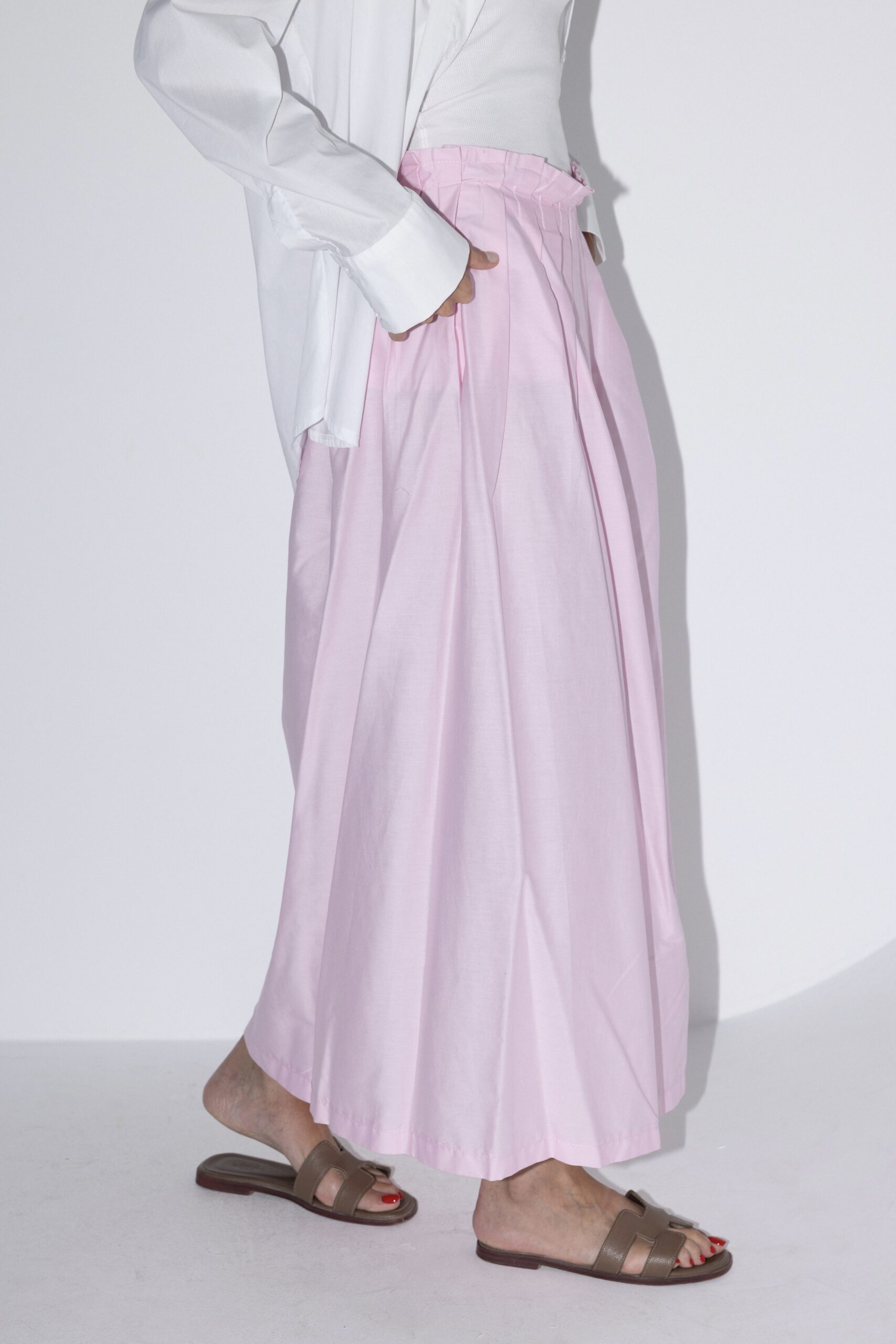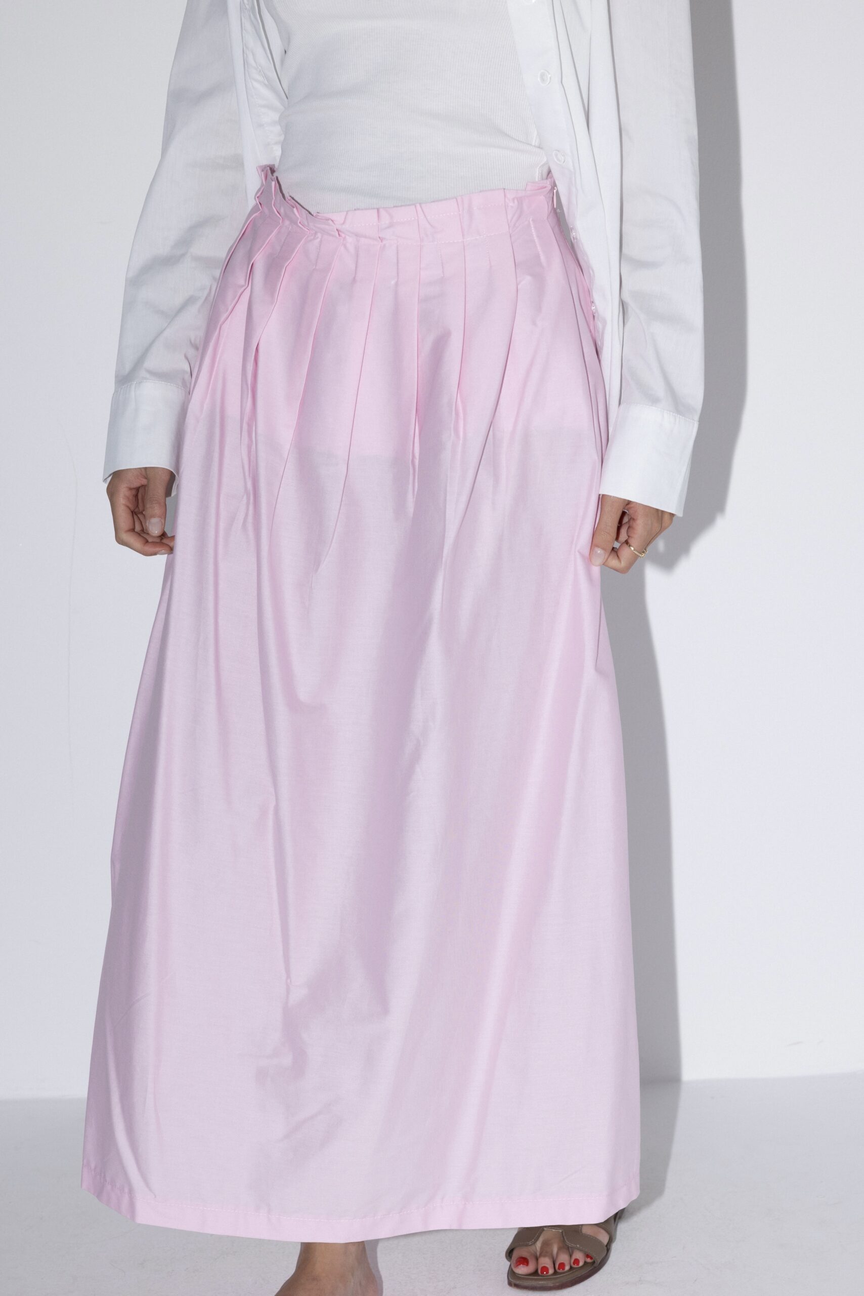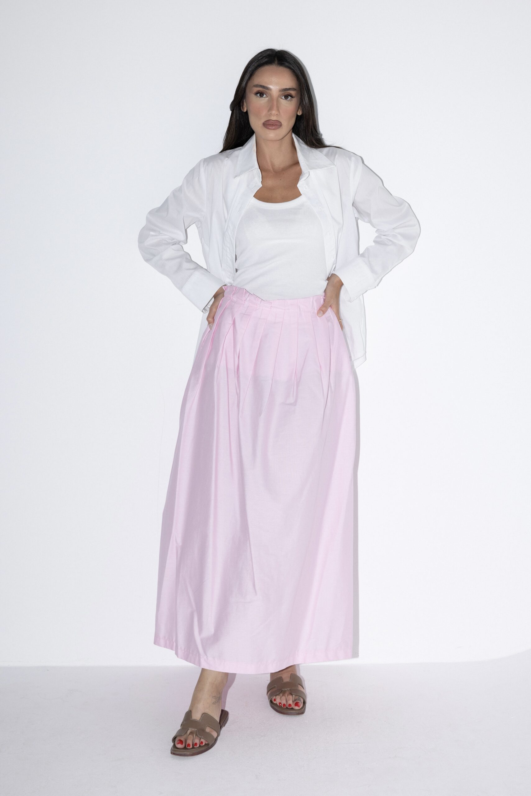 חצאית מקסי בעלת גזרה גבוהה עם כיווצים עדינים במותן המוסיפים נפח ותנועה טבעית. עשויה מבד קליל ונושם המעניק נוחות מירבית לאורך כל היום. מידת הבגד על הדוגמנית 0.